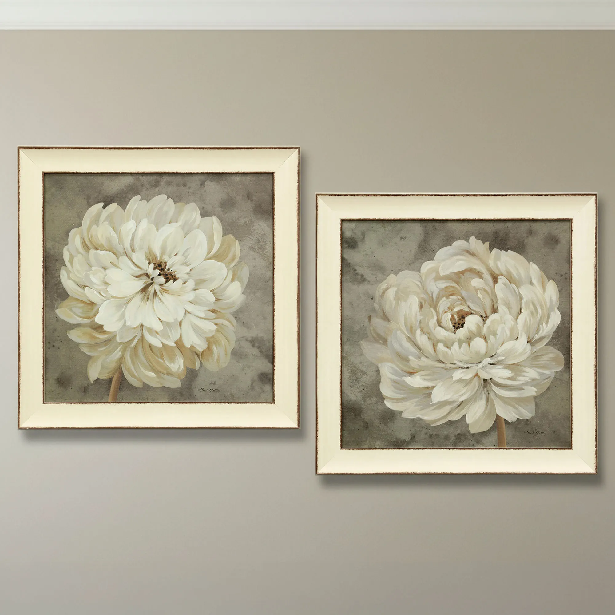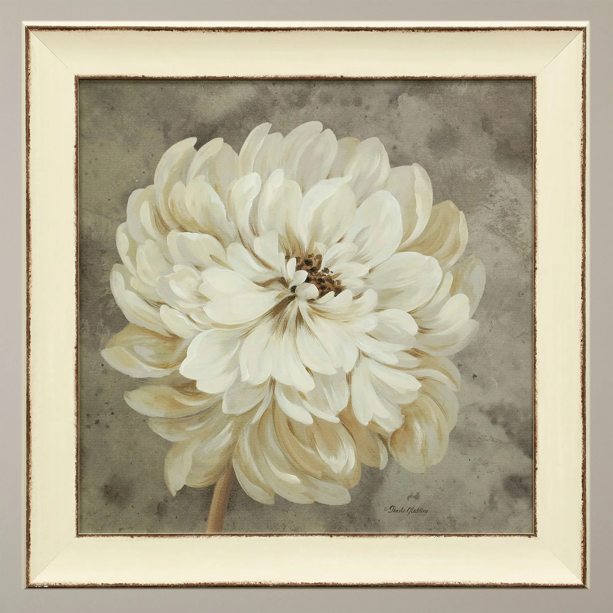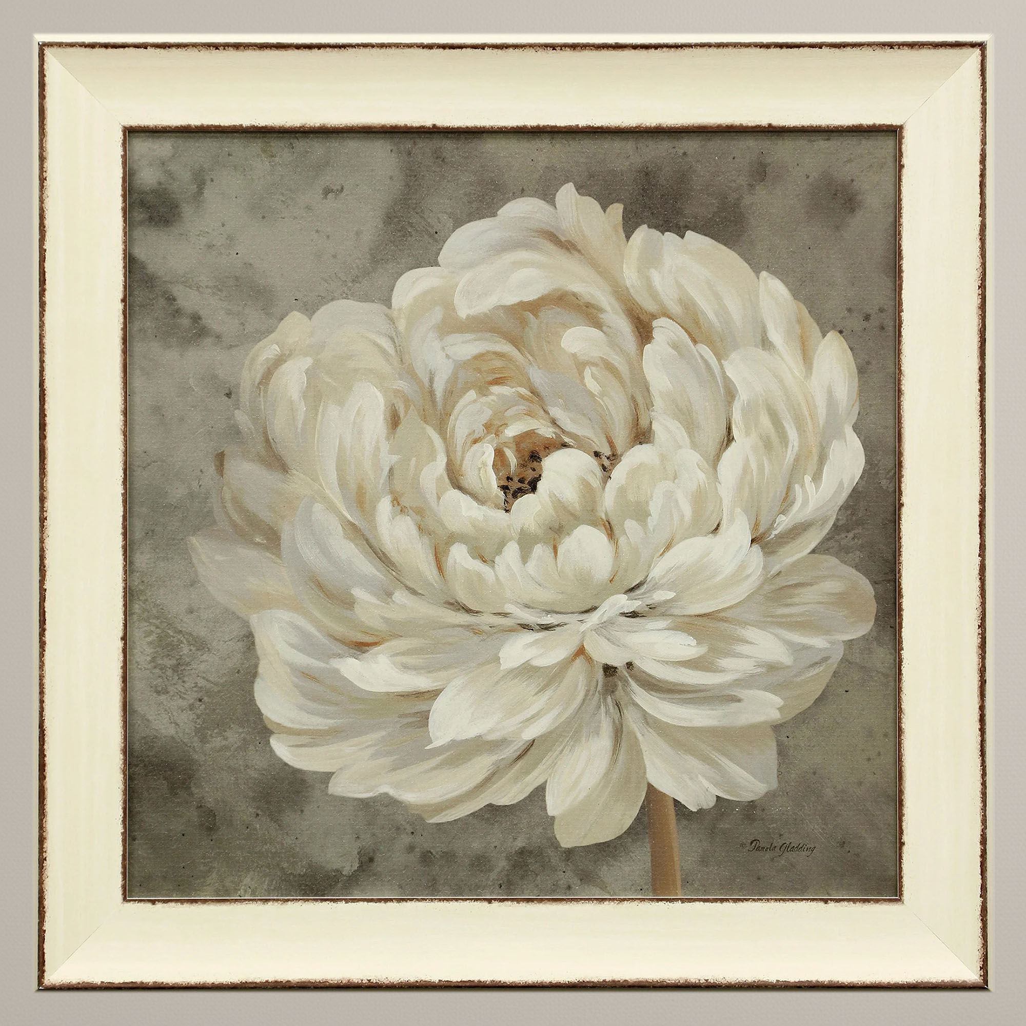 These flower blossoms prove that Blooming in Neutral still captures attention. Proudly made in the USA, each gel-coated textured paper print artwork features a beautiful layered flower unfurling creamy neutral-toned petals on a mottled gray and taupe background. Bloom II opens toward the right. Bloom III tilts towards the left. With brown distressing, a creamy polystyrene frame completes each floral wall art. Overall, each framed wall art measures 30"sq.x2"D.