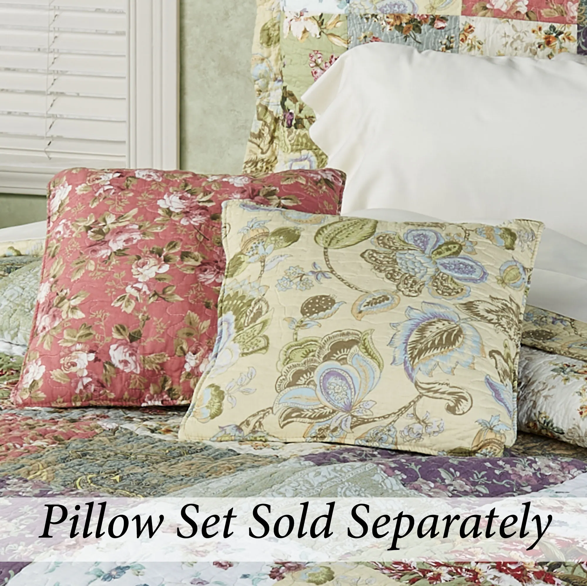 Also available: The Pillow Set includes two square pillows with bound ends and tie closures. Machine wash the pillow shams; spot clean the inserts. One pillow is dark coral with florals printed in shades of dark coral, pink, and white with green leaves; reverse is blue-green with paisley designs printed in light taupe, yellow, brown, and tan. The other pillow is pale yellow with florals in periwinkle, lavender, and golden yellow with green and taupe leaves; reverse is warm purple with florals in orchid and linen with green and linen leaves.