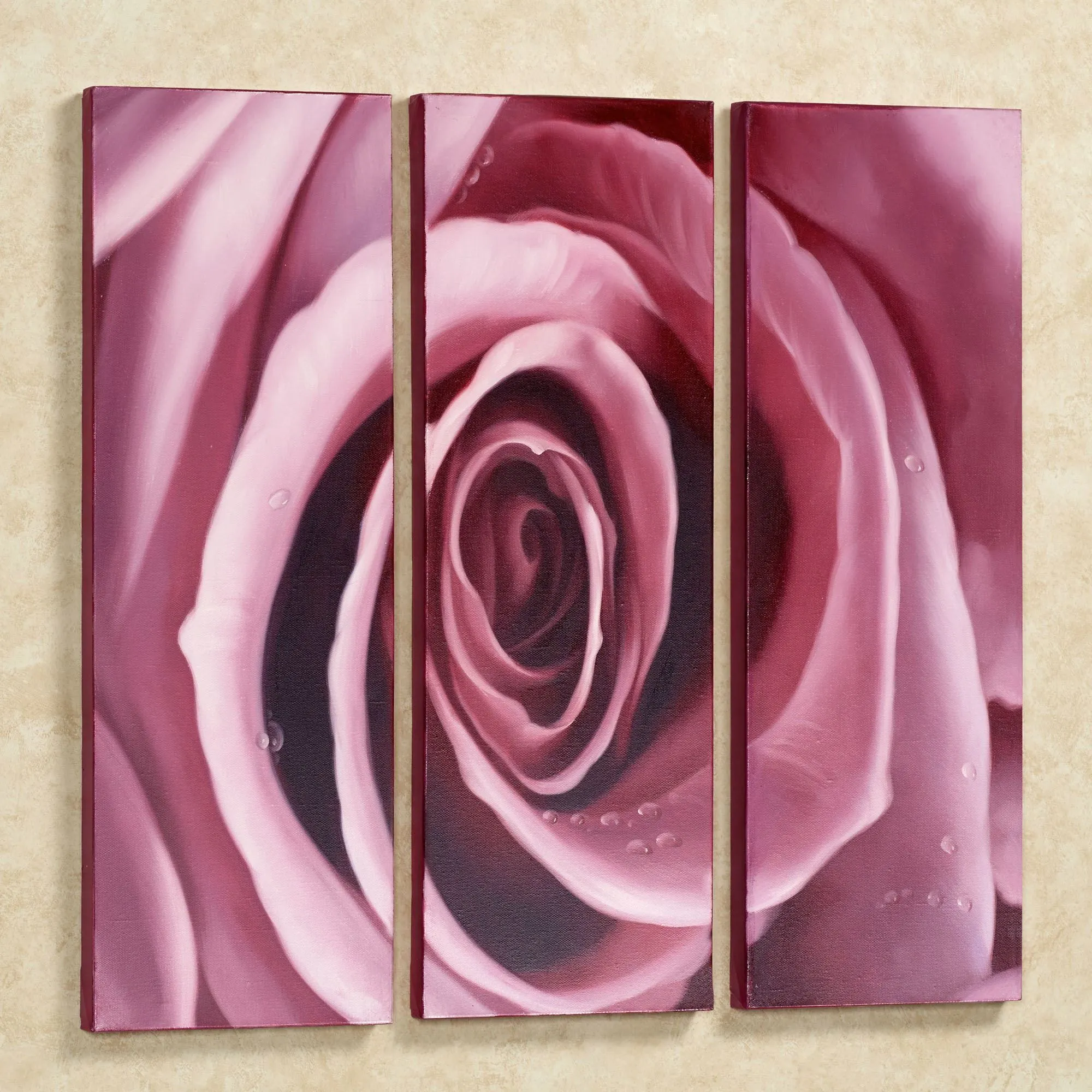Get up close and personal with the radiant floral beauty of the Blooming Rose in this intricate triptych canvas wall art. A handpainted oil on canvas, each is gallery-wrapped over a wood frame and contains the unfurling petals of an orchid pink rose, dotted with drops of dew. Due to the handpainted nature, minor variations may occur. Each measures 10"Wx1.5"Dx30"H.