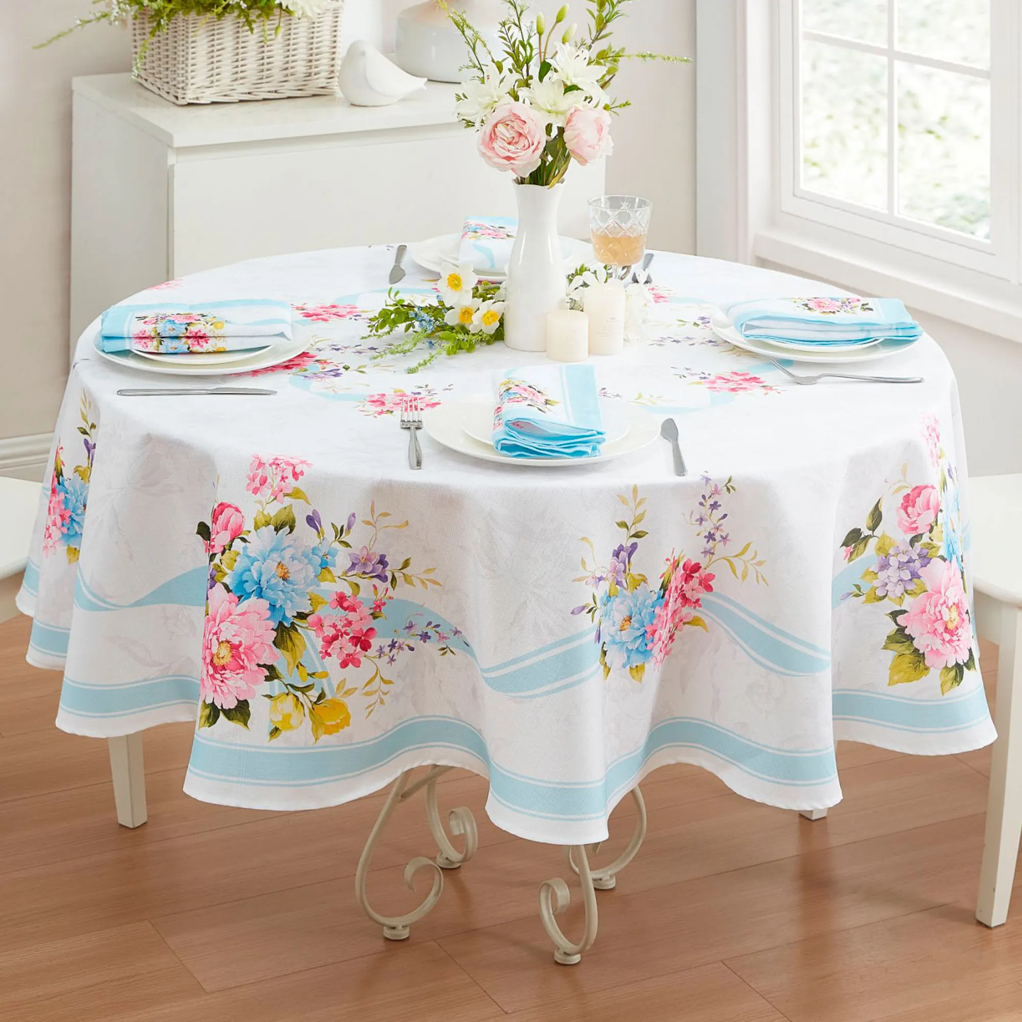 • Floral table linens are machine washable
