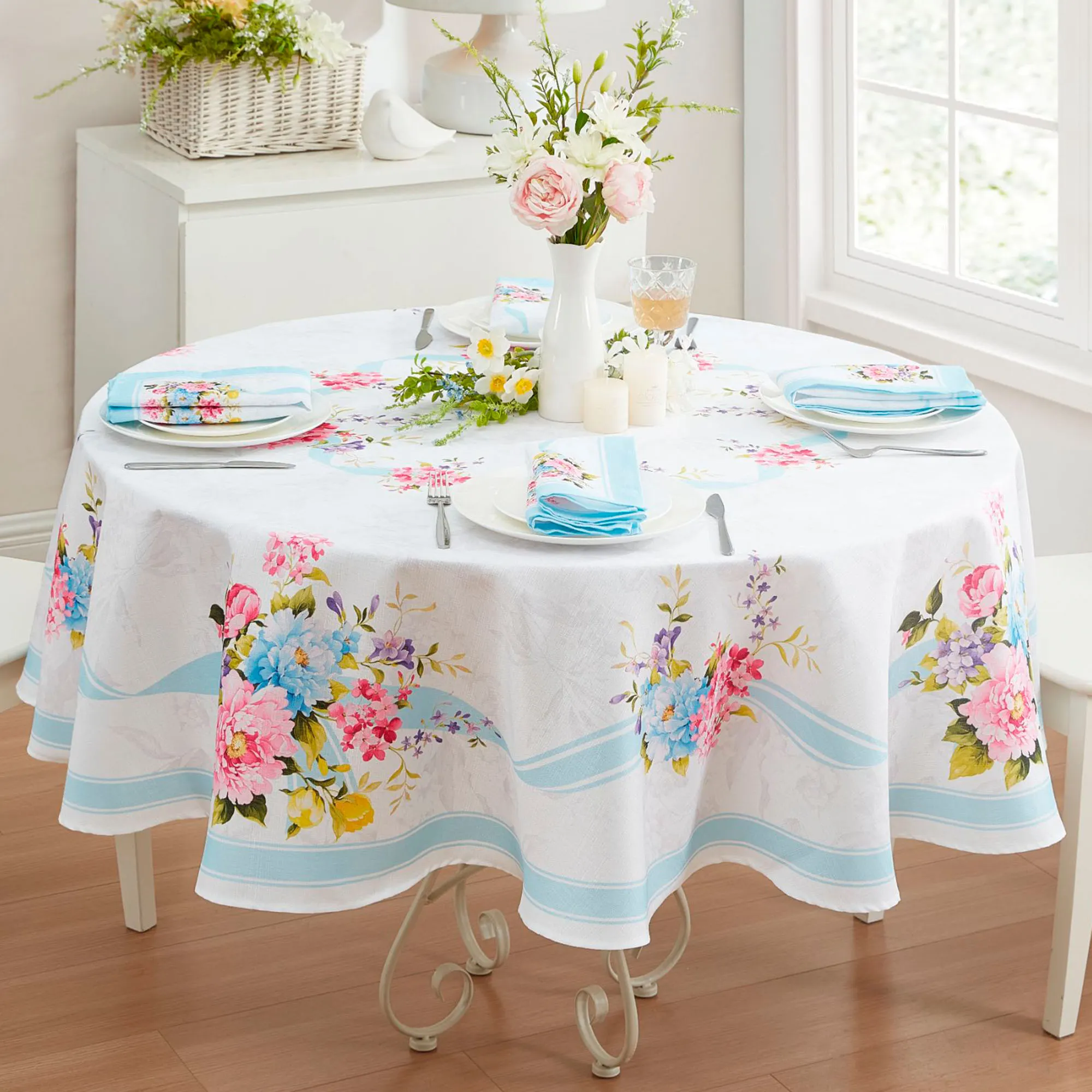 • Floral table linens are machine washable