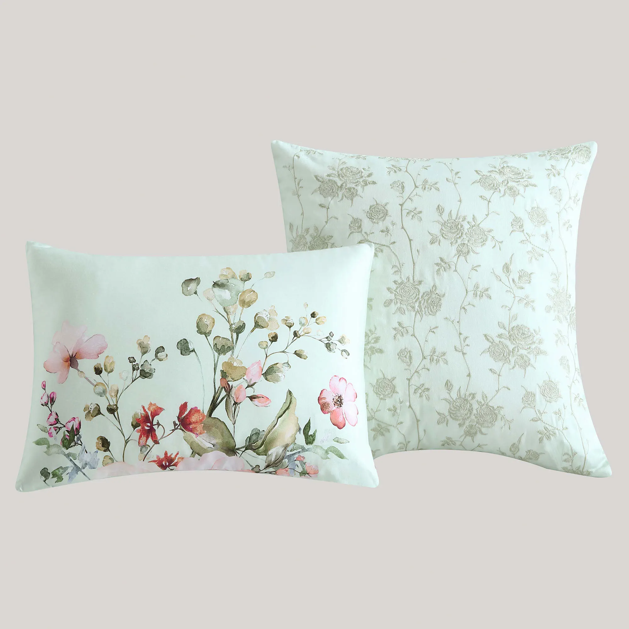 Tailored square pillow has embroidered florals and leaves on misty green and a zipper closure. Tailored rectangle pillow has printed florals on misty green and a zipper closure.