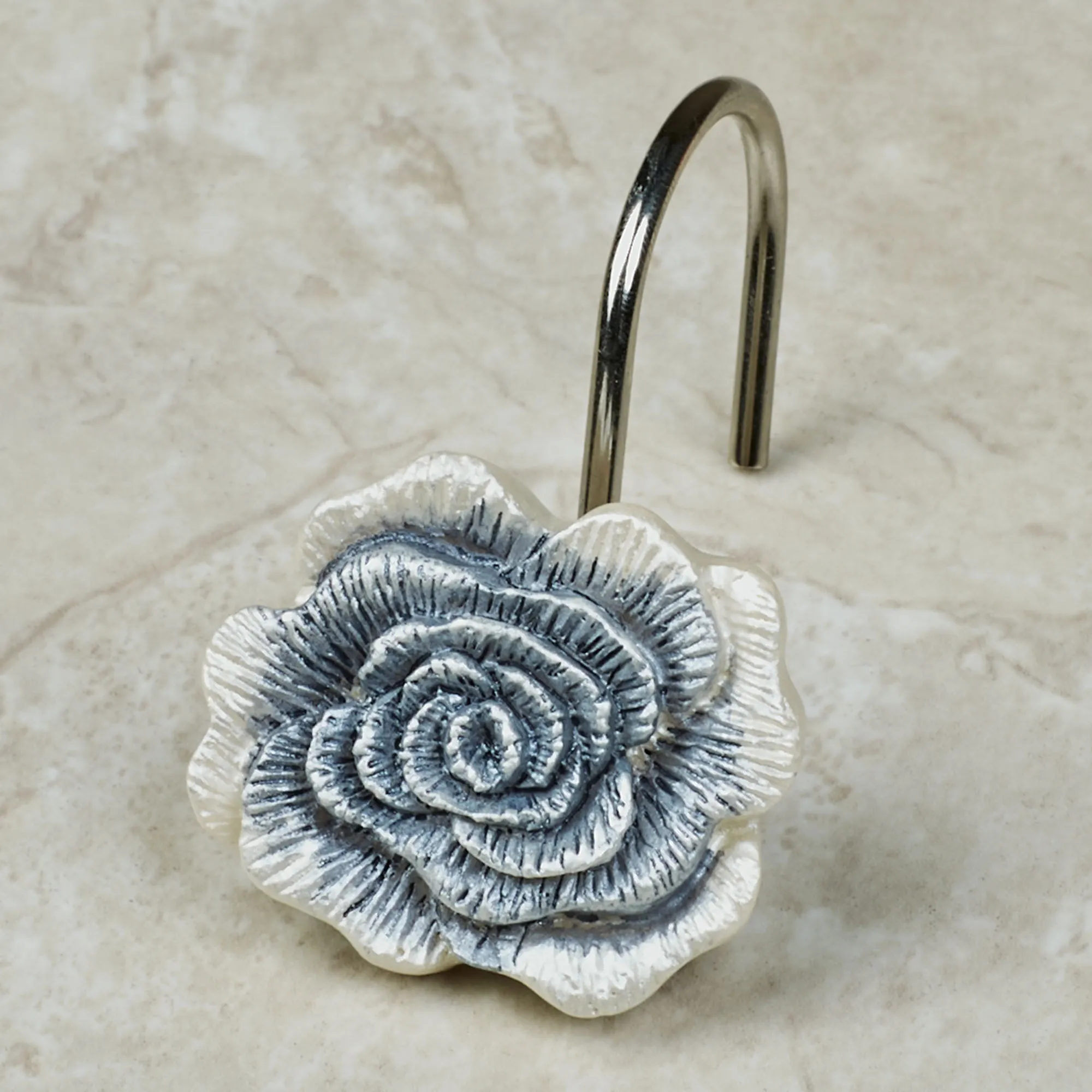 Blossom Roses display floral beauty on these shower accessories. The polyester Shower Curtain has embroidered roses in shades of blue, gray, gold, and ivory on a sheer ivory background along with gold embroidered scrolls and swags. The bottom also has embroidery, ivory velvet, and scalloped ends. We recommend a shower curtain liner. Measures 70"Wx72"L. Machine washable. Imported. Shower Curtain Hooks are sold separately in a 12-piece set. The resin and metal shower hooks are roses handpainted in blue and ivory. Each hook is 1.5"Wx2"Dx1.5"H.
