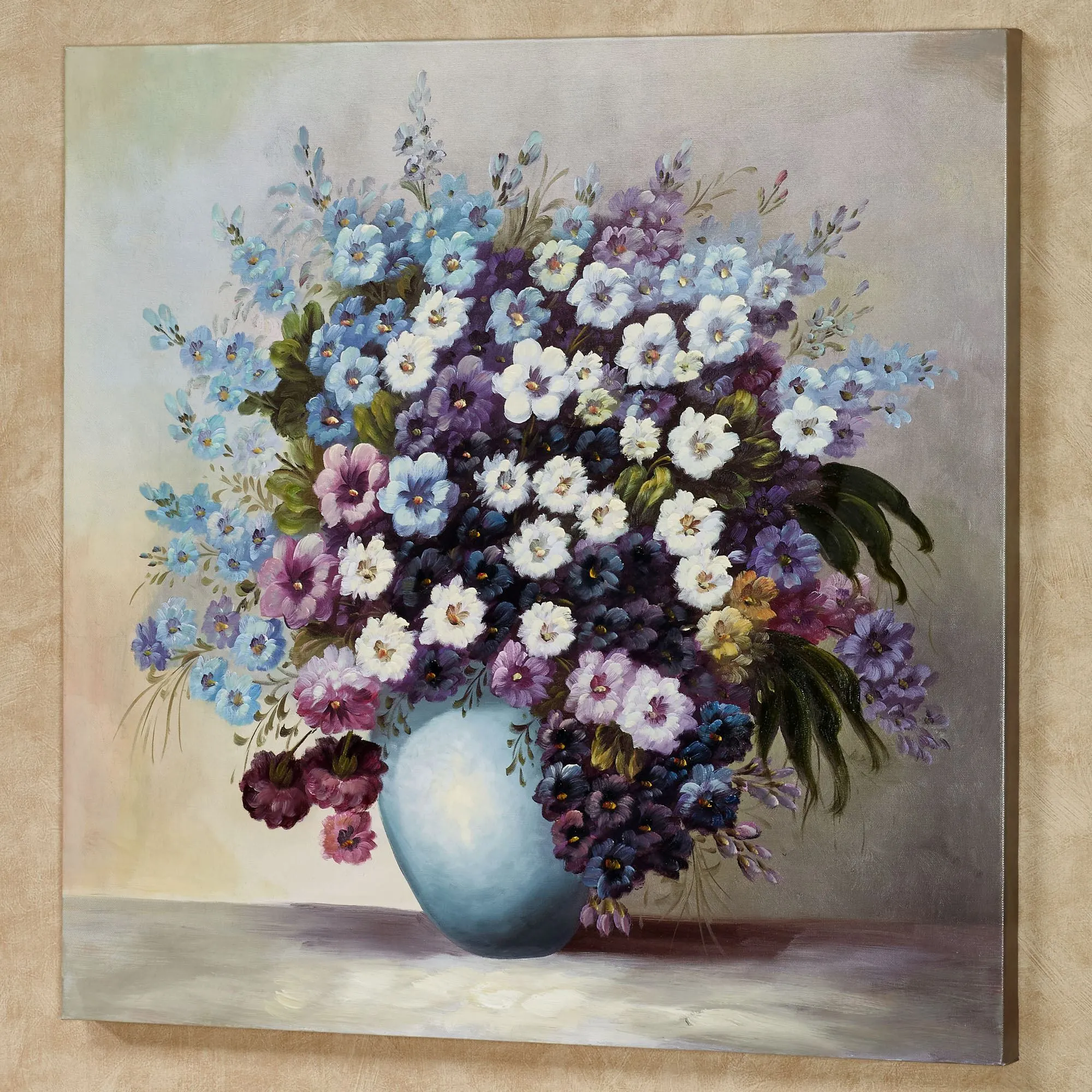 The Blossoms of Spring have beautiful shades of blue, white, and purple. Giclee on canvas wall art features a voluminous bouquet of handpainted flowers. Canvas is gallery-wrapped over a wood frame. Floral wall art measures 30"sq.x1.5"D. Due to the handcrafted nature of this item, slight variations may occur; no two items will be exactly alike.