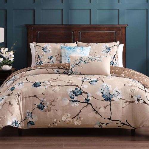 The Blue Blossom Floral Bedding unfurls sweet petals with wonder and whimsy from sepia-toned surroundings. The 5-piece Bed Set includes a comforter, 2 shams, and 2 accent pillows. Full of charm, the beige cotton sateen bedding features printed blue, ivory, black, brown, and beige hues in a lovely flowering branch design. Oversized comforter reverses to beige and brown florals on brown cotton sateen. Click on the Details tab to read about the other items. Fill is polyester. Machine washable; spot clean the pillows. Imported.