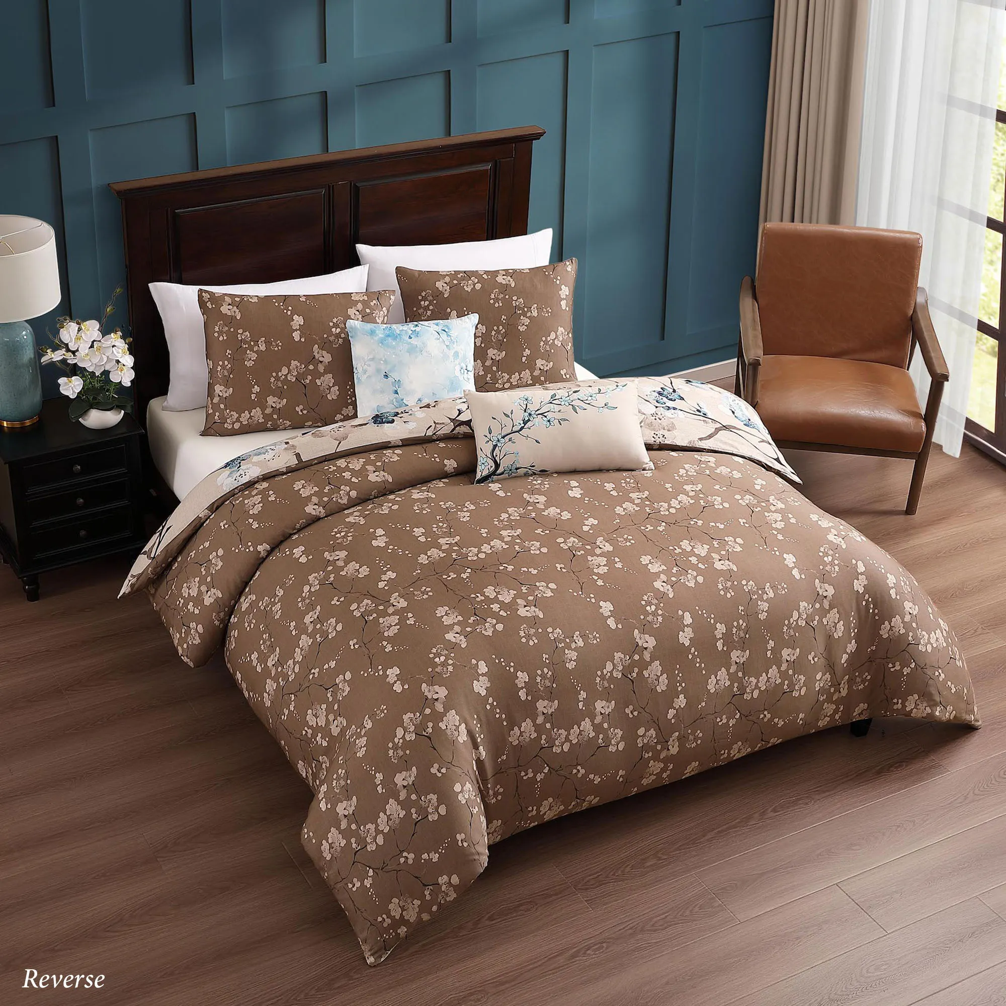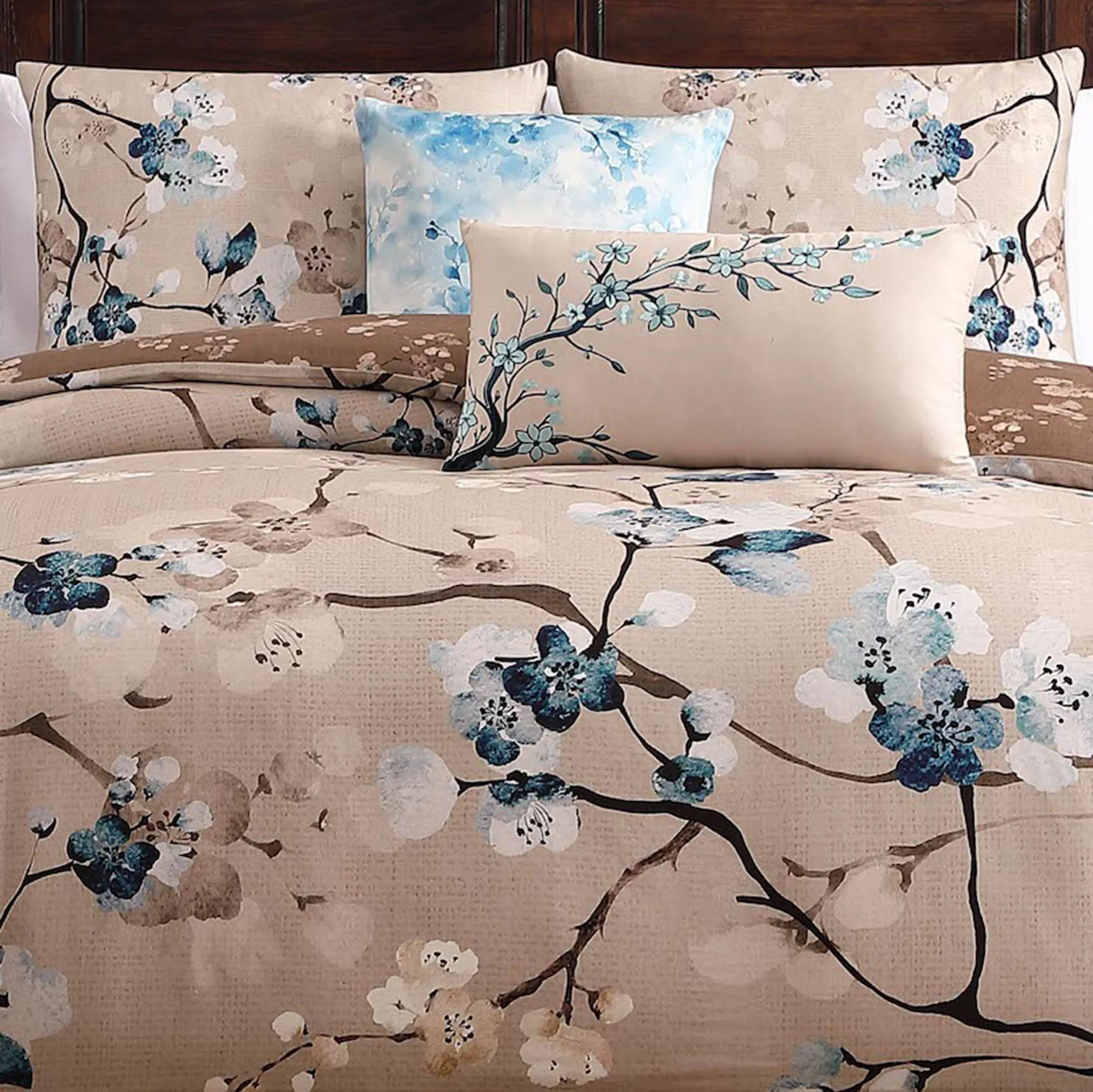 Blue Blossom Reversible Beige Floral 5 pc Comforter Bed Set