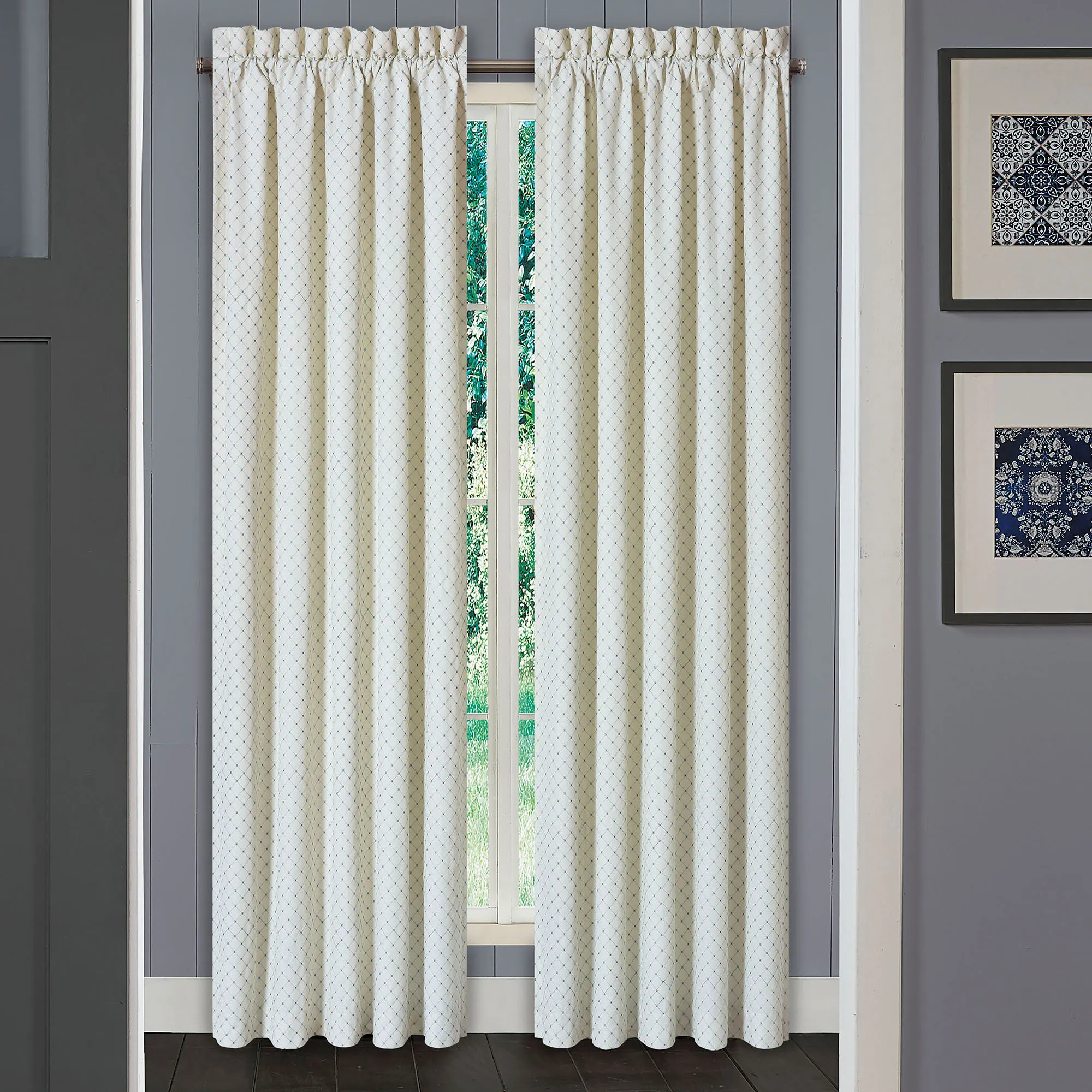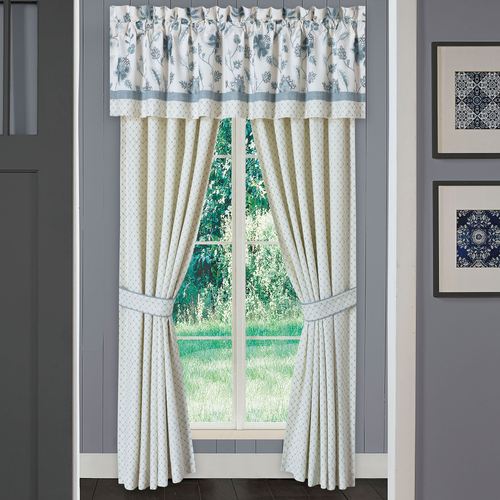 The polyester Blue Garden Window Treatment by J. Queen New York will enchant your room. The tailored, lined window treatment has 3" rod pockets. Specify Wide Curtain Pair, 100"Wx84"L; or Valance, 88"Wx21"L. Wide Curtains have celestial blue diamond embroidery on textured ivory and include tiebacks. Valance has embroidered floral and diamond designs in shades of celestial blue, blue shadow, sterling blue, steel blue, and ivory; valance also has a celestial blue band. Dry clean. Imported. The curtain pair width is the total width of two panels together.
