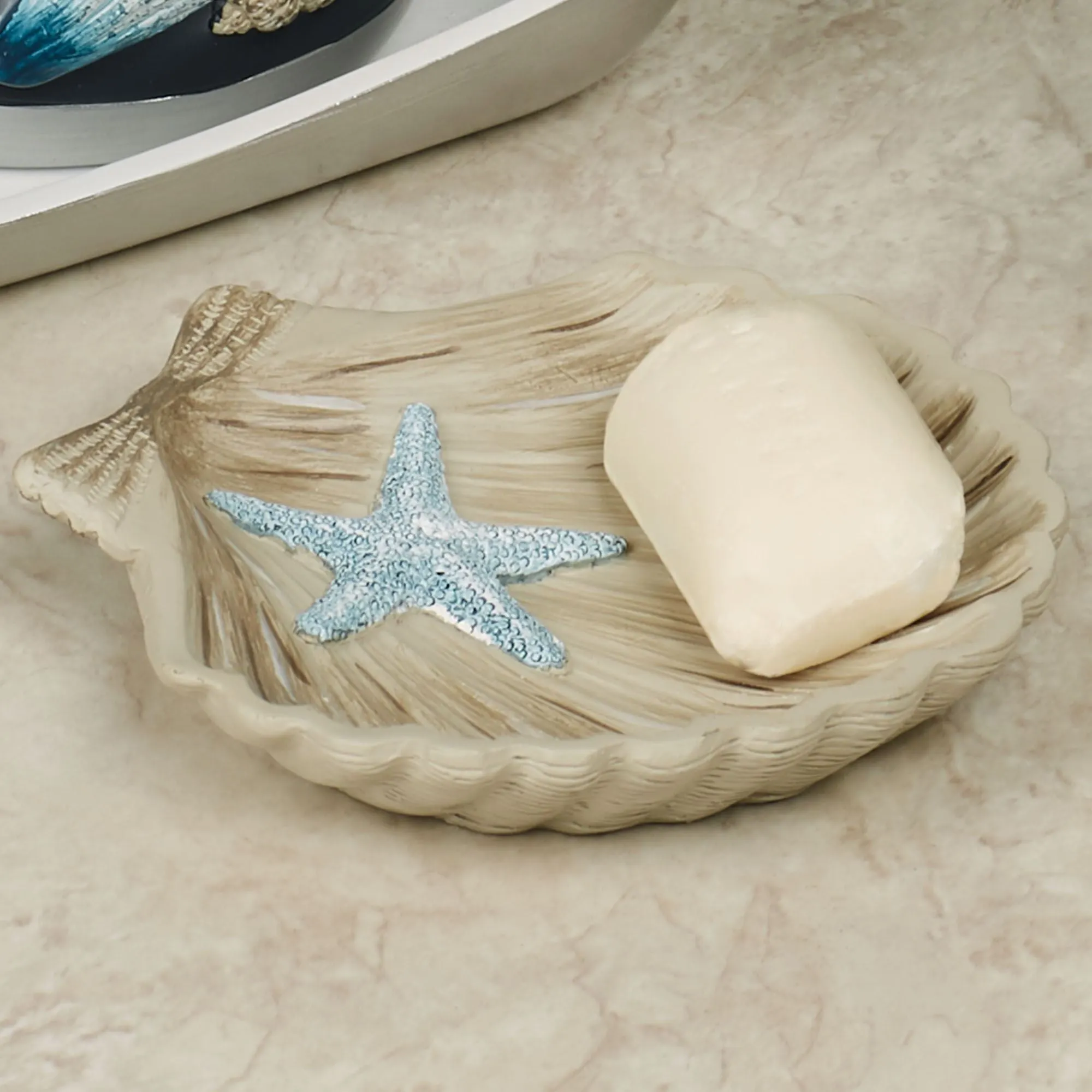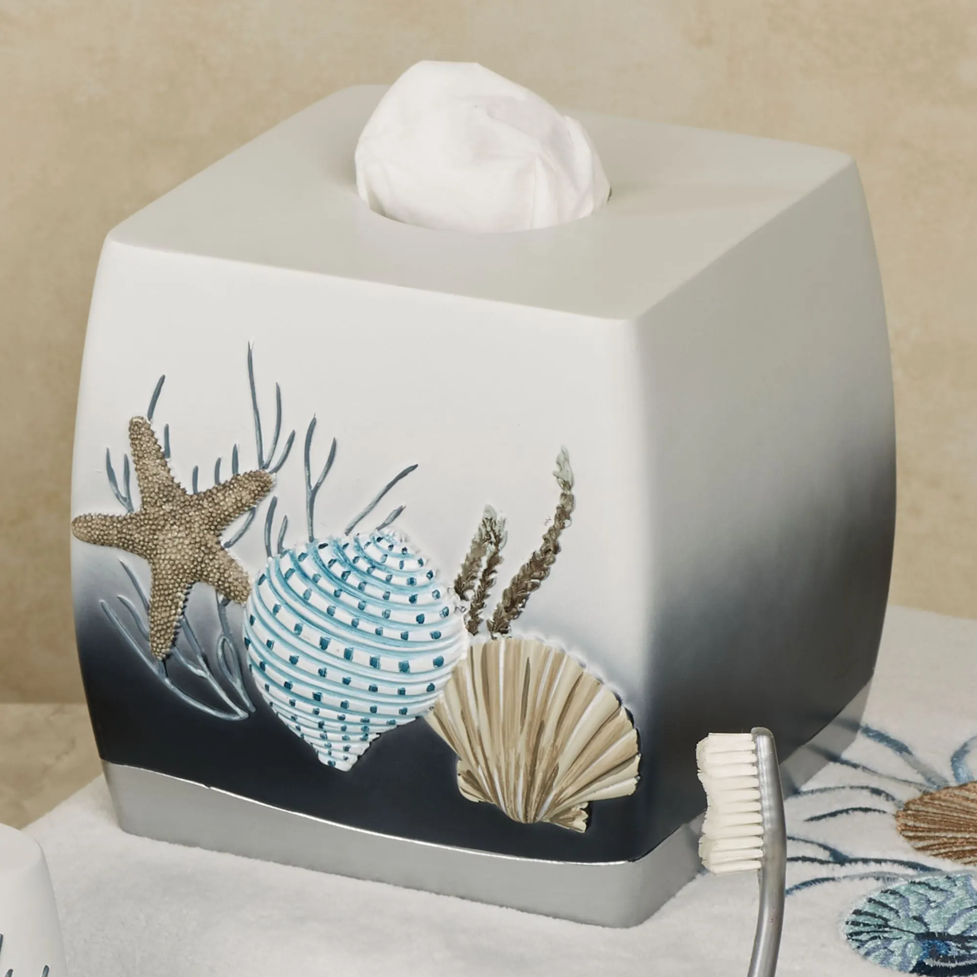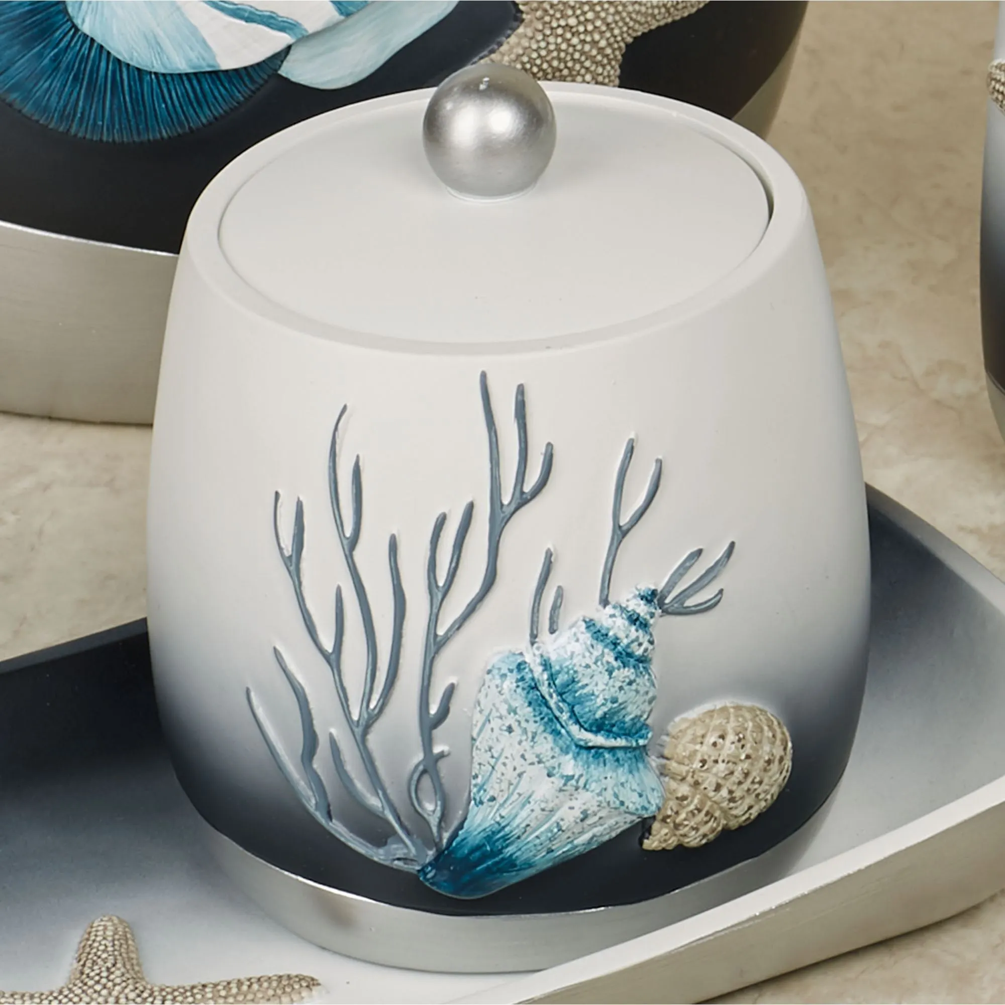 Sway with the undersea current as your bathroom sinks to the depths of the Blue Lagoon with these charming coastal bath accessories. Each resin accent is handpainted in natural and cool blue hues. Specify Lotion/Soap Dispenser, Tissue Cover, Wastebasket, Soap Dish, Toothbrush Holder, Tumbler, Covered Jar, or Tray. All, except Soap Dish and Toothbrush Holder, feature an off-white and cobalt ombre ground adorned with coral and shells; a silver bottom completes each. Some also have a starfish. Soap Dish resembles a scallop shell with a starfish accent. Toothbrush Holder resembles a large nautilus and small starfish resting on a sandy bottom.