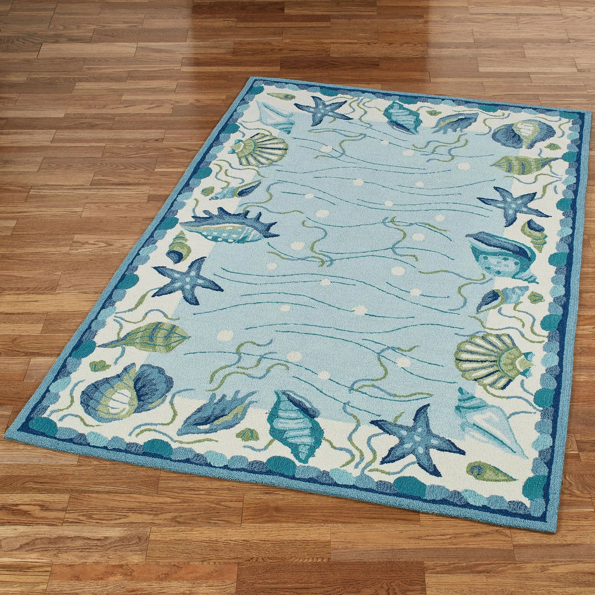 The treasures of the Blue Lagoon have washed upon your shore, bringing coastal splendor and charm to your decor. The .5" thick, hand-hooked polyester area rug features a light blue center and pearl frame decorated with bubbles, seashells, starfish, seagrasses, and pebbles in blue, teal, and green shades; backed in cloth-covered latex. We recommend professional cleaning by a rug cleaner. Imported.