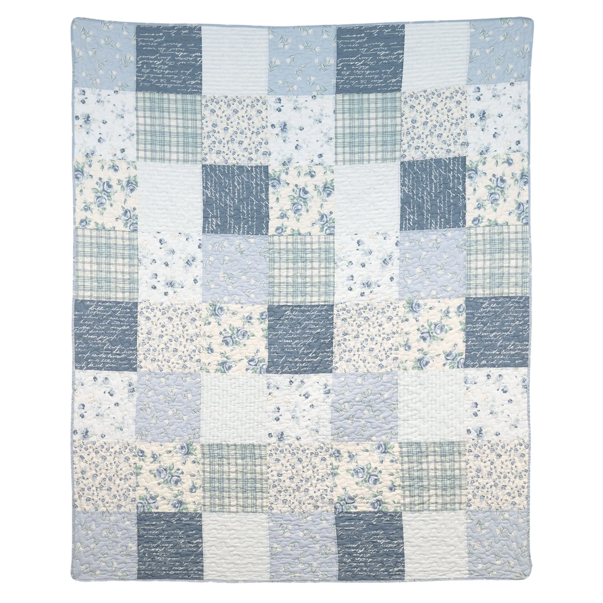 Blue Pastures blossoming with cool blooms provide the perfect inspiration for love notes and romantic dreams. From Your Lifestyle(R) by Donna Sharp(R), the cotton ensemble evokes the same ardor with patchwork blocks filled with a multitude of florals, script, plaids, and stripes. Cool and neutral shades of blue, white, and light cream add an effortless appeal to the design. A reverse of white florals on light blue, vermicelli quilting, and bound edges complete each element, except the Pillow.