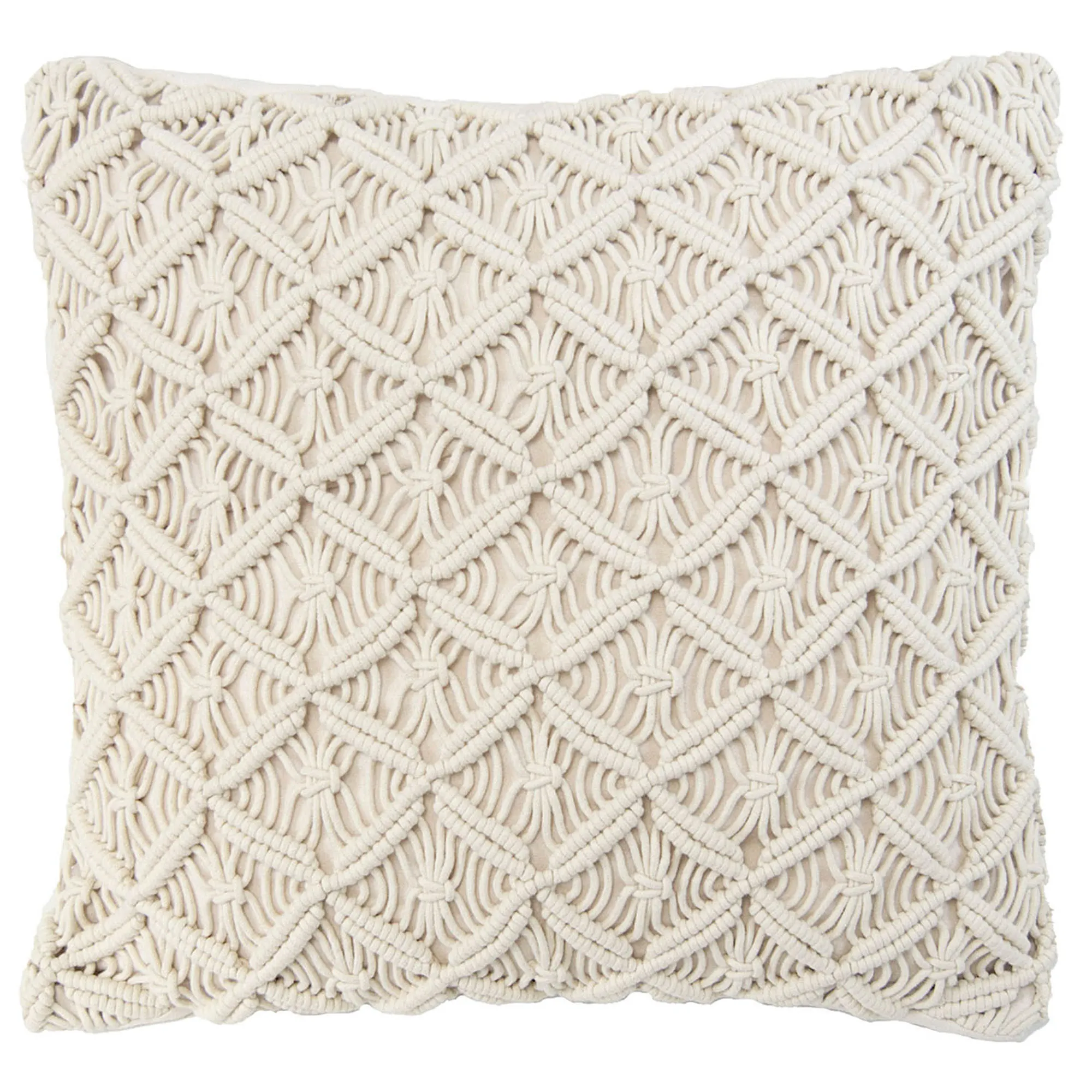 The tailored Square Pillow has natural-colored crochet diamond designs on natural-colored polyester faux suede; zipper closure. Insert is polyester. Spot clean.