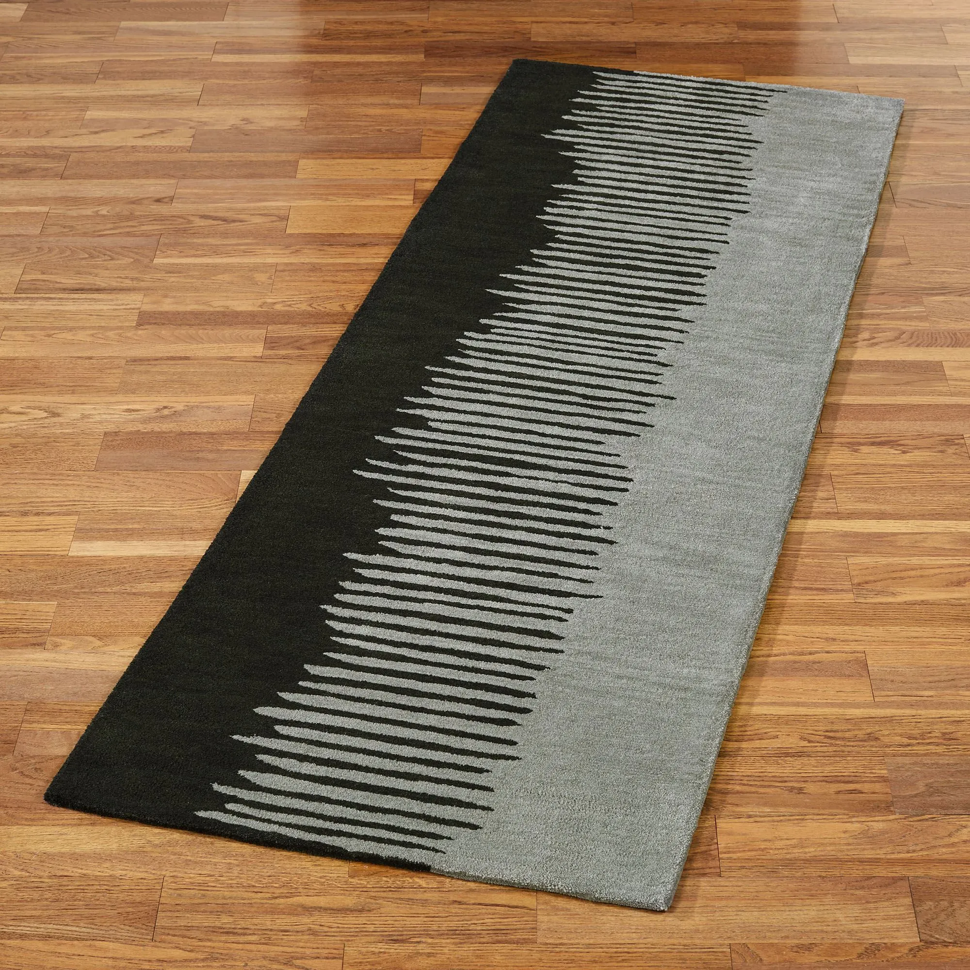 The Blurred Lines Abstract Rug Runner crosses boundaries with contemporary style and intrigue. The .625" thick, hand-tufted polyacrylic rug features a center of converging hues. Colors include black and dark gray. Backing is cloth-covered latex. We recommend professional cleaning by a rug cleaner. Imported.