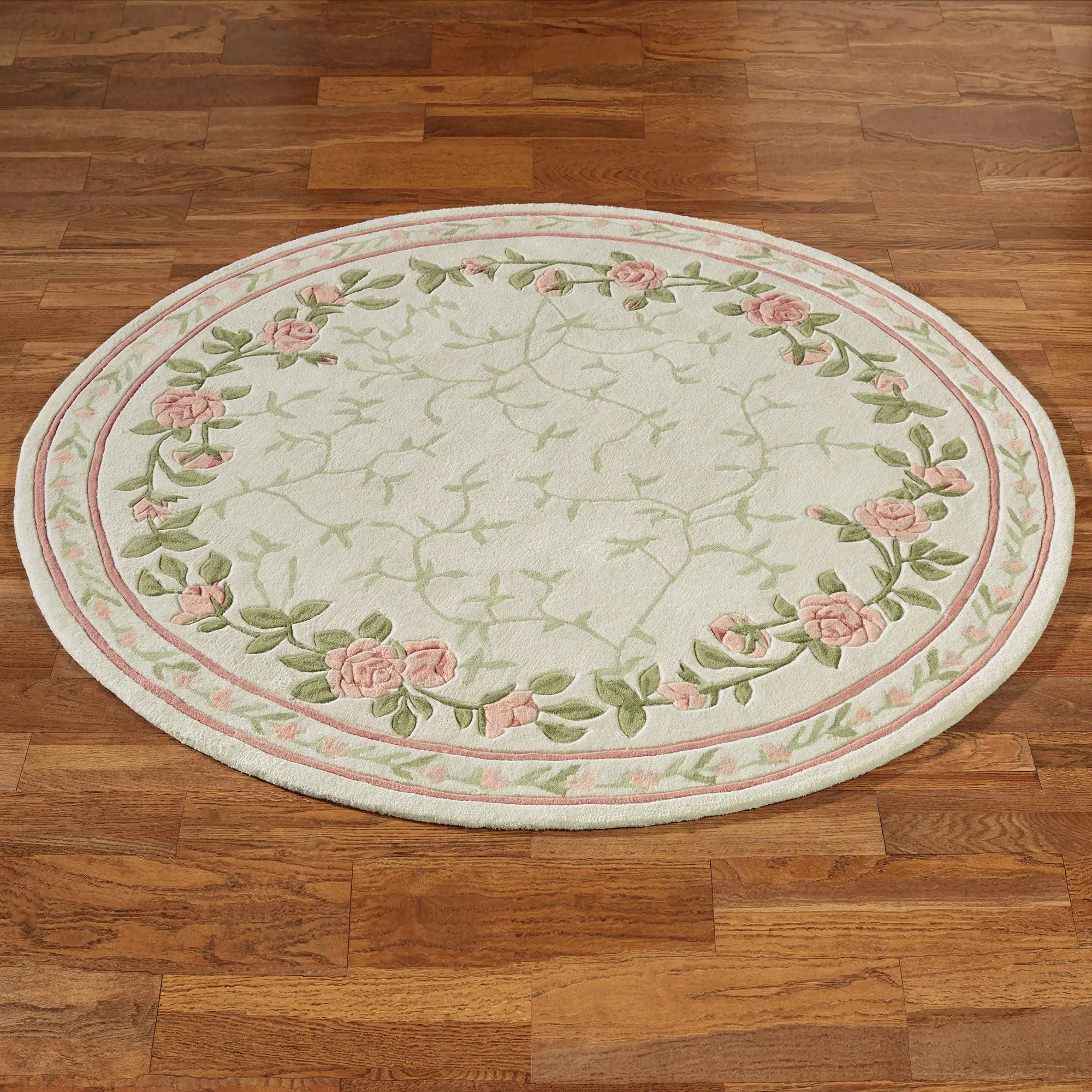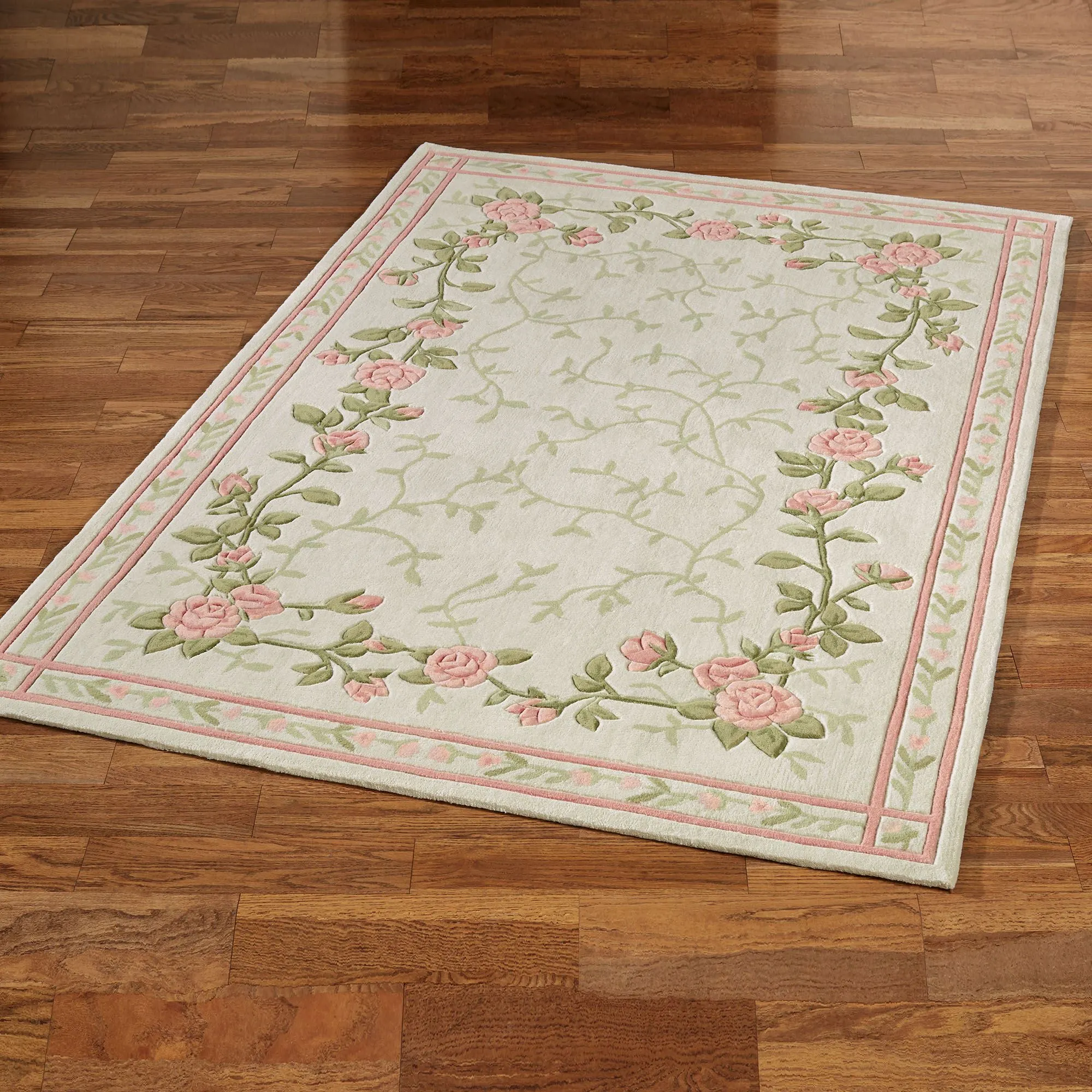 The Blush Bloom Floral Area Rug celebrates the garden's true majesty. The .5" thick, hand-tufted ivory polyester rug features a field of green leafy vines framed in handcarved blossoming blush roses and a blush frame of vining buds. Backing is cloth-covered latex. We recommend professional cleaning by a rug cleaner. Imported.