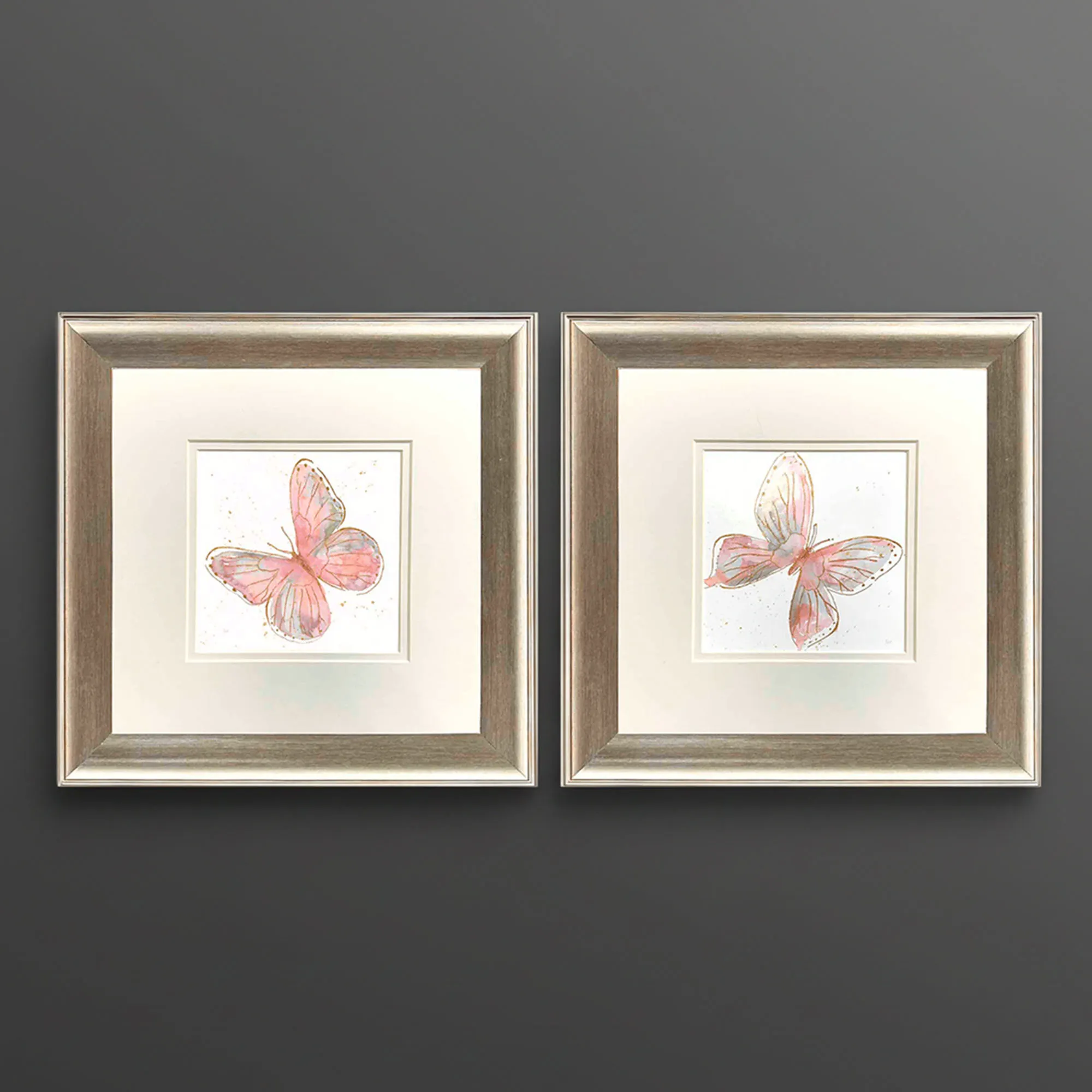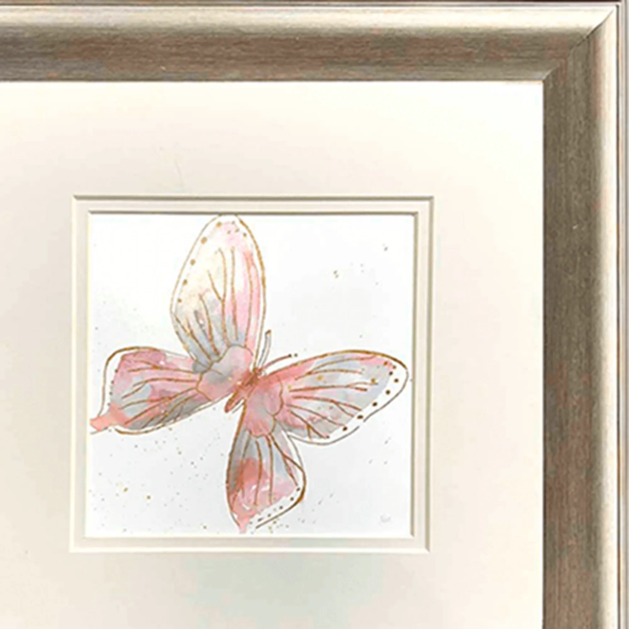 Blush Butterfly wings are full of whimsy, charm, and beautiful color. From watercolor original artwork by the artist Nan, the lovely prints in this wall art set feature two pink, dusty rose, and slate blue butterflies flitting about on pastel wings. Double off-white mats, glass inserts, and champagne gold polystyrene frames complete each beautiful artwork. Overall, each butterfly framed wall art print measures 13"sq.x1"D. Imported/USA.