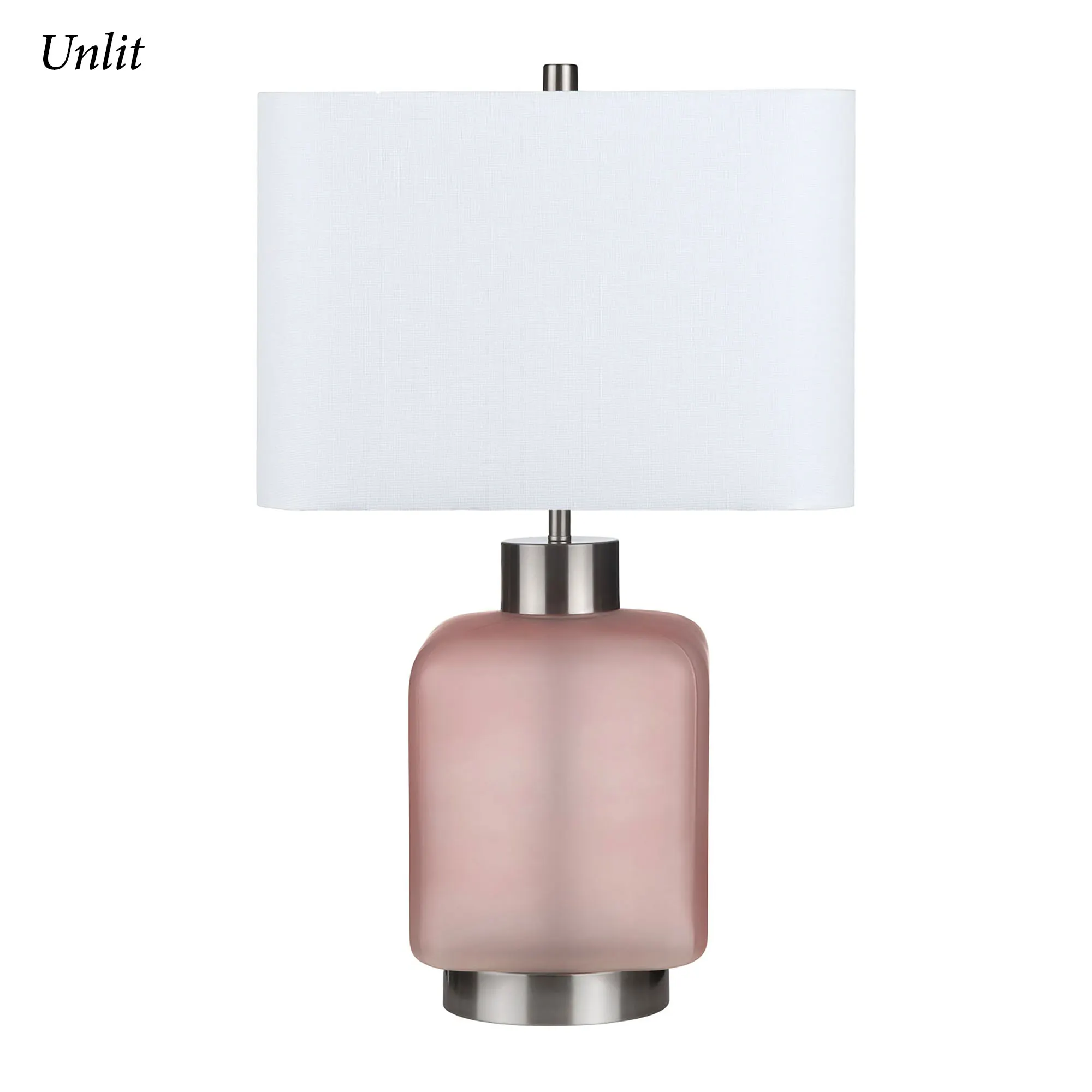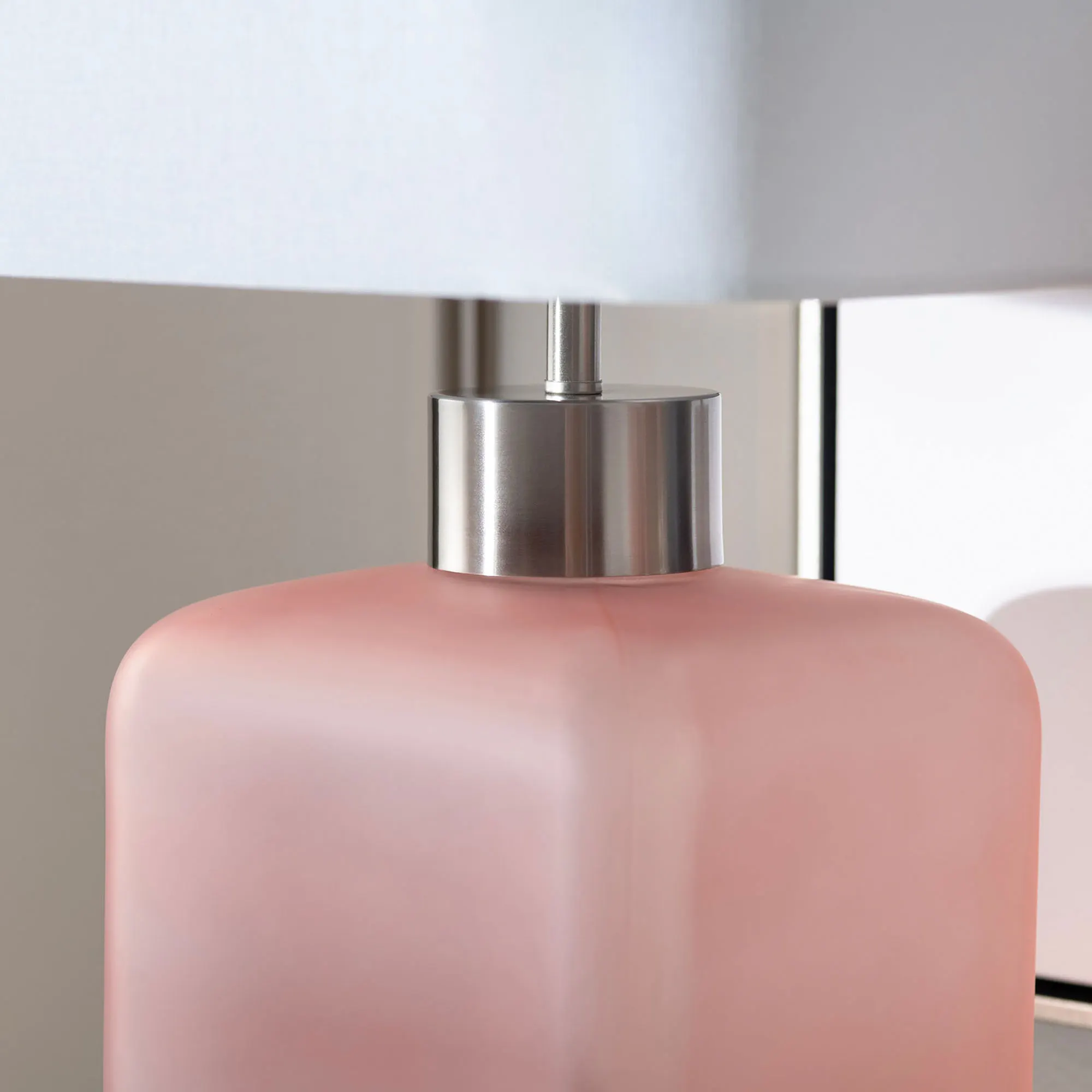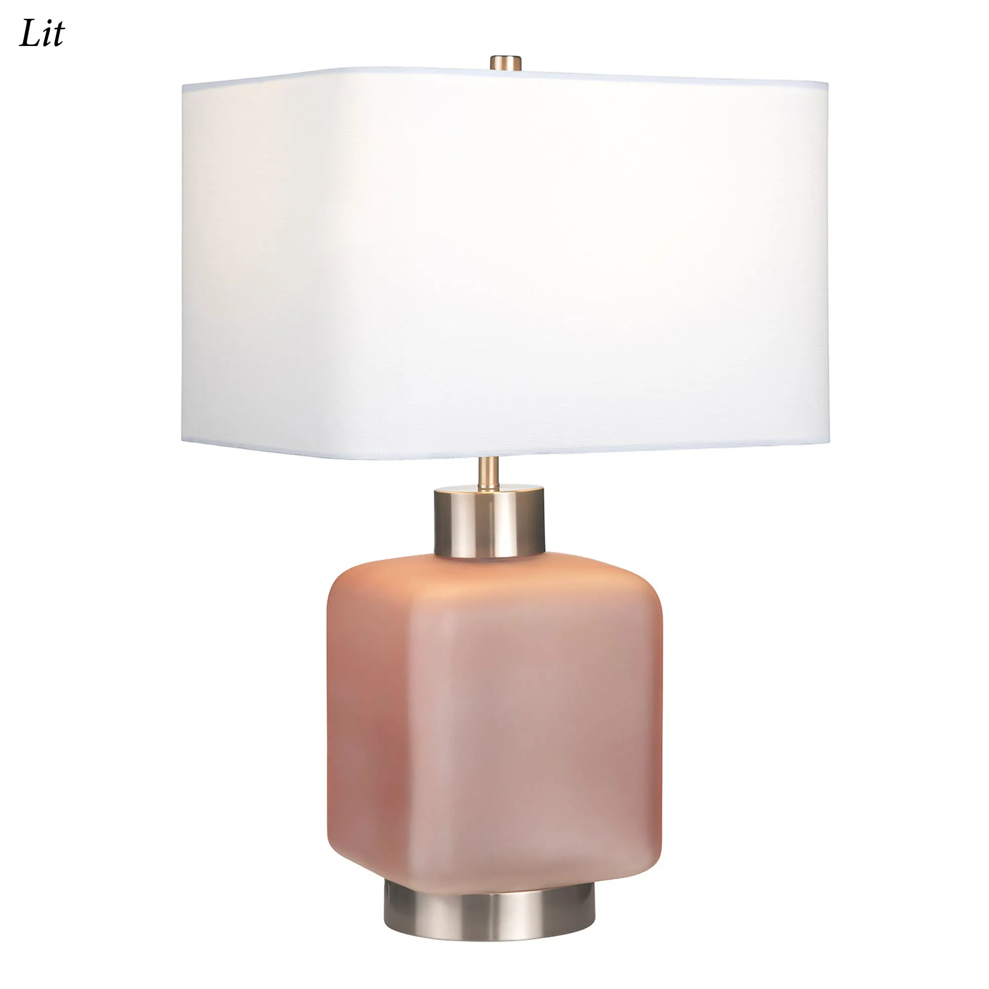 The Blushing Table Lamp styles a space with a soft allure. With brushed nickel metal accents, the softly squared font features a lovely blush pink, frosted glass design beneath the white linen rounded-corner square lamp shade. UL listed. Requires one 3-way 150W max. bulb. Overall, the charming table lamp measures 16"sq.x27.5"H, including the 1.5"H cylinder finial.