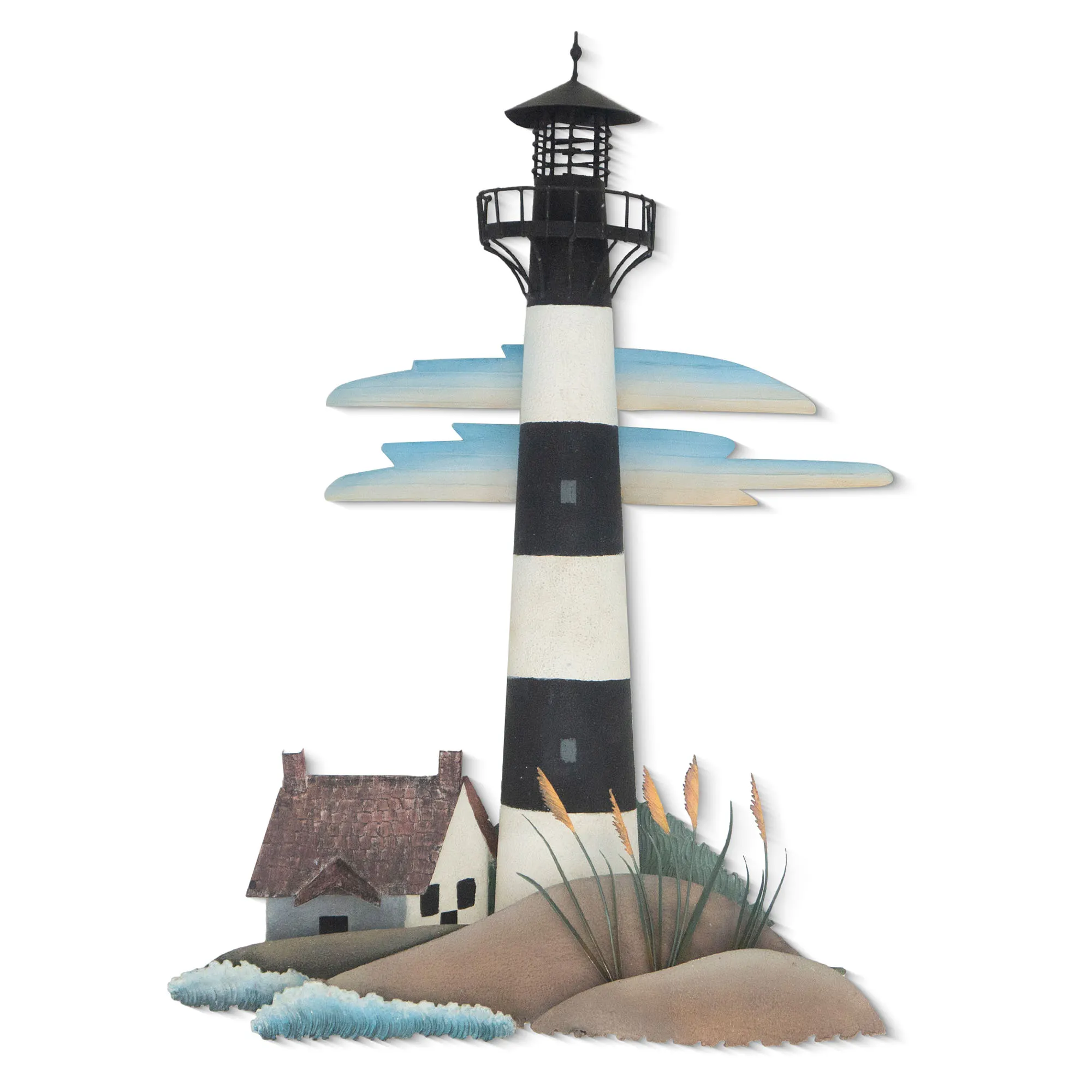 The Bodie Island Lighthouse stands tall with individual flair and an unmistakable pattern. Designed by artist Joanne Ferrara, the handcrafted and handpainted metal wall sculpture resembles a lighthouse and its unique surroundings. The Bodie Island Lighthouse, located in North Carolina, has classic black and white stripes, clouds, waves, sand dunes, and a cottage. Artwork can hang in your indoor space, covered porch, or enclosed patio. Lighthouse wall art measures 17"Wx4.5"Dx25"H.