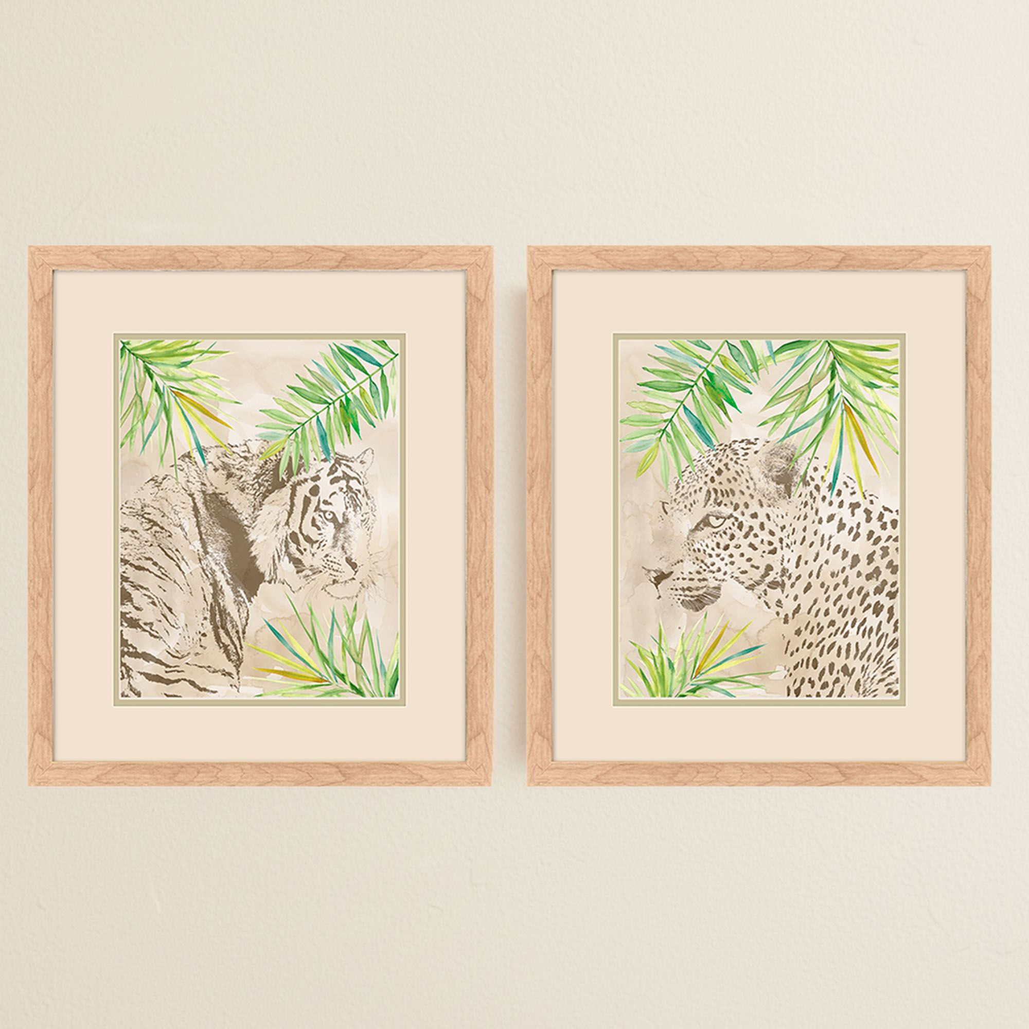 The Boho Jungle Cat Framed Wall Art Set exudes a wild and exotic presence. From original digital artwork by the artist Carol Robinson, the print designs layer vibrant green palm fronds against a mottled beige background and a camouflaged tiger or leopard. Pale laurel green and beige mats, a glass insert, and a natural wood-toned polystyrene frame protect each artwork. Overall, each framed wall art measures 18"Wx1"Dx21"H. Imported/USA.