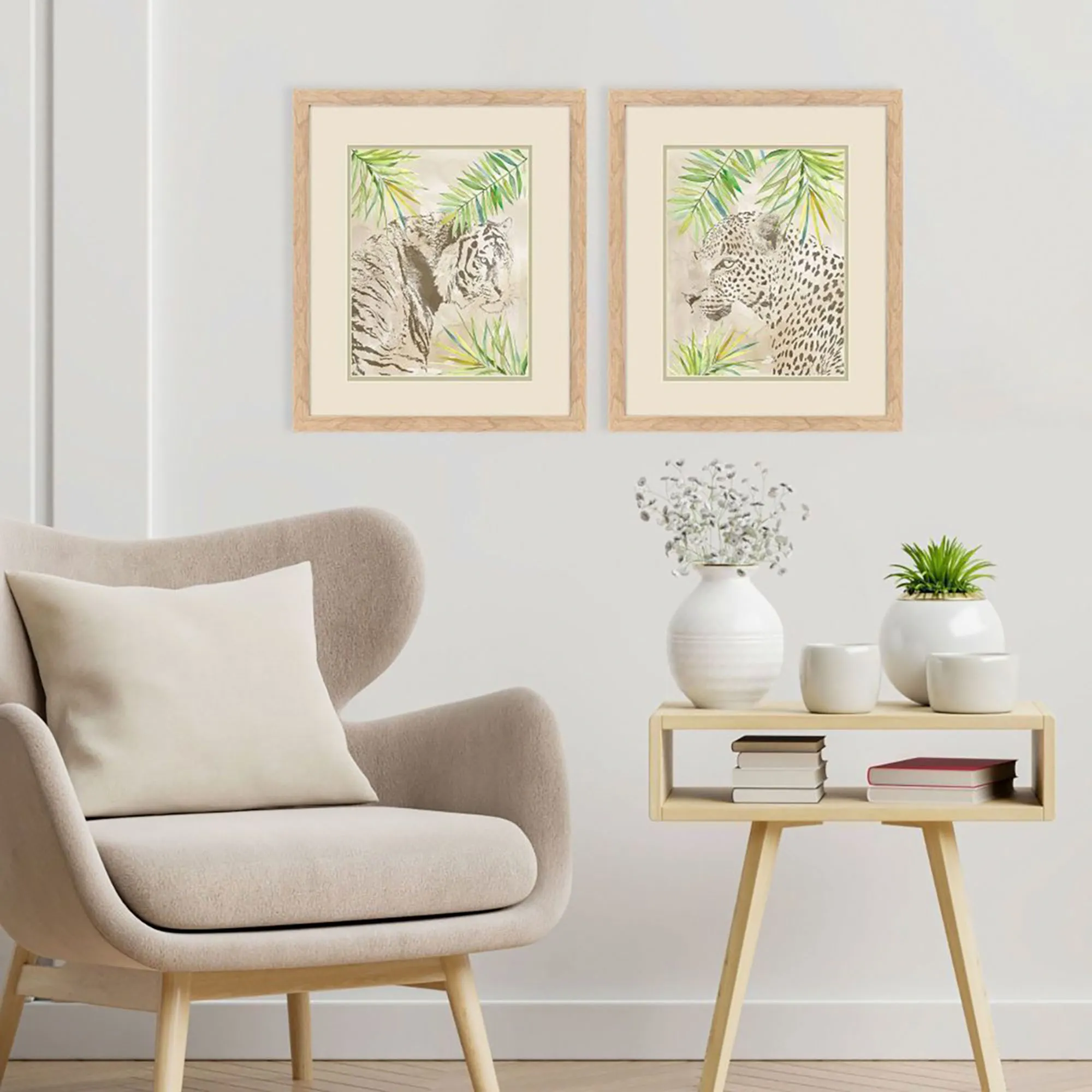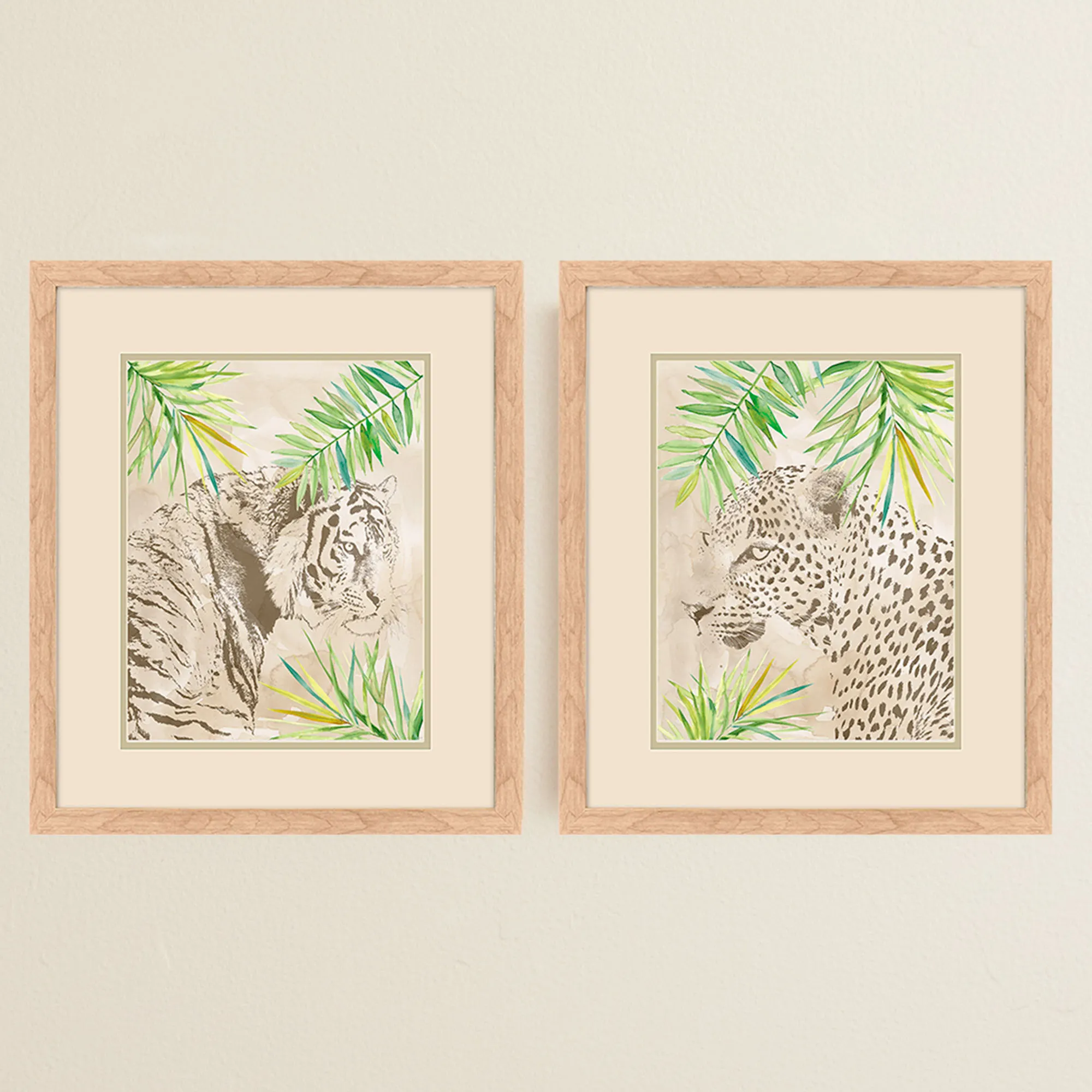 Boho Jungle Cat Framed Wall Art Beige Set of Two
