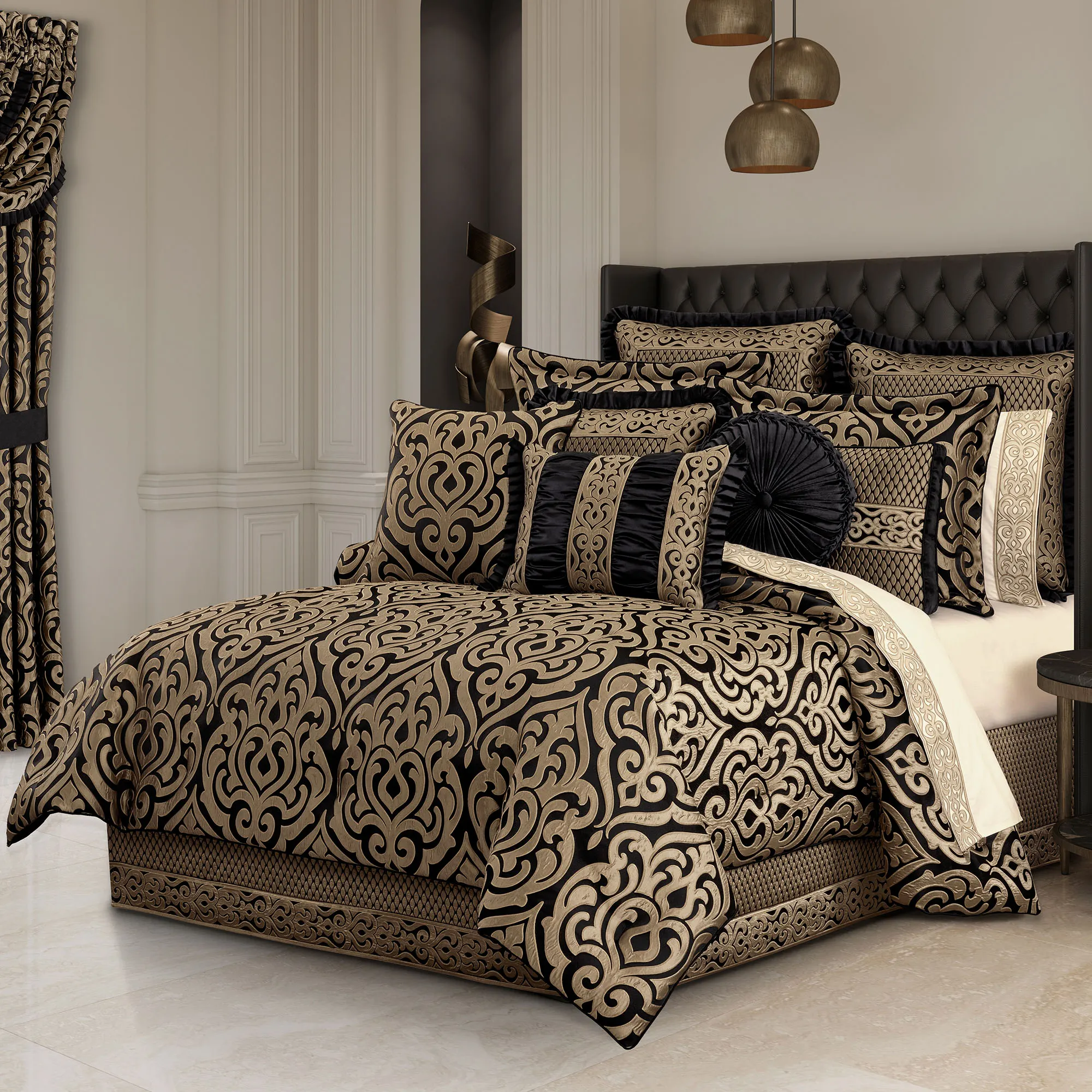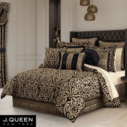 Majestic damask designs revel with luxurious splendor on the Bolero Bedding. This polyester ensemble, from J. Queen New York, features gold woven-jacquard motifs on black.