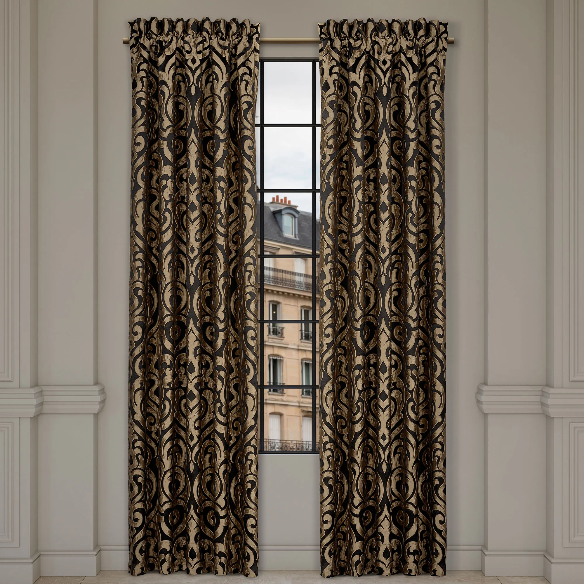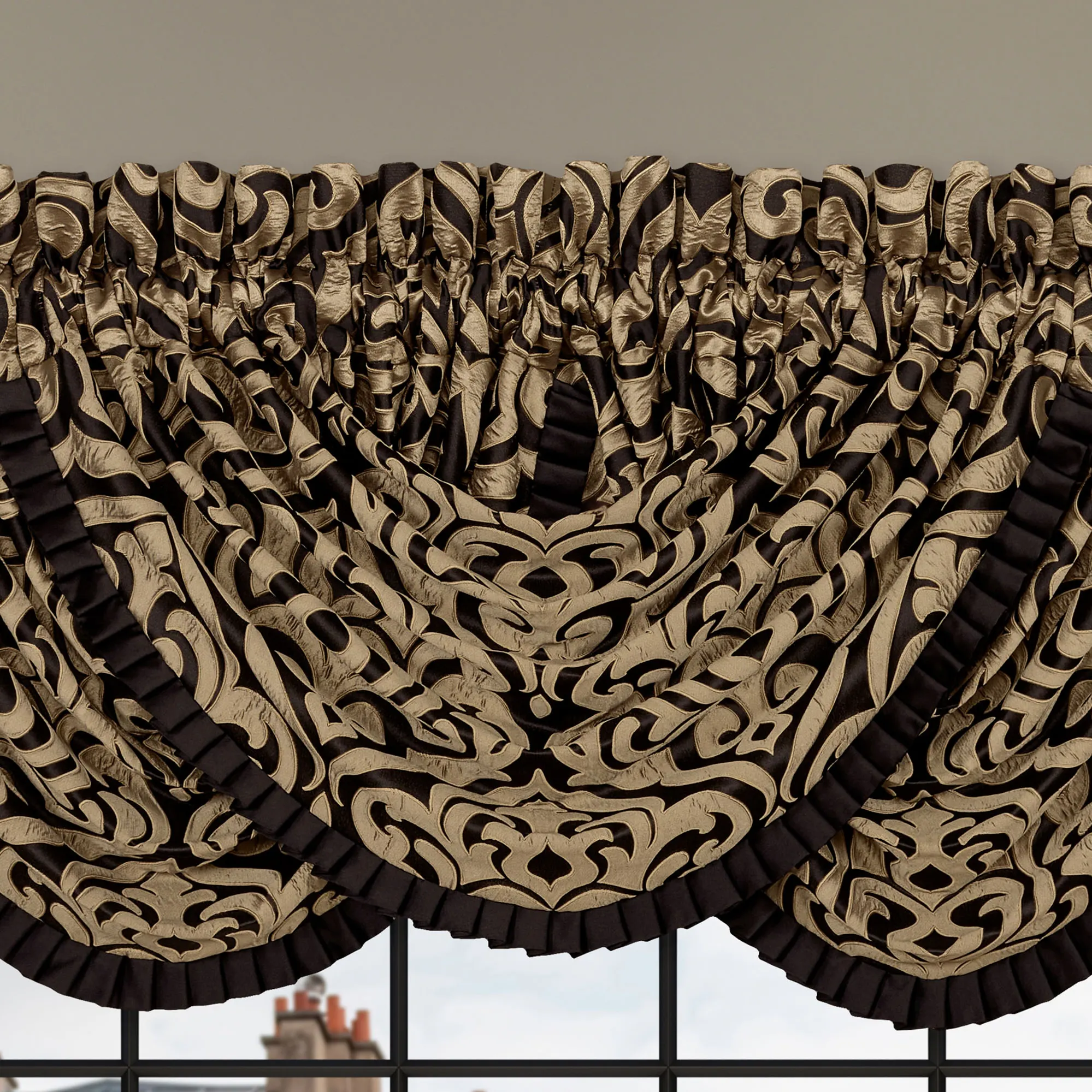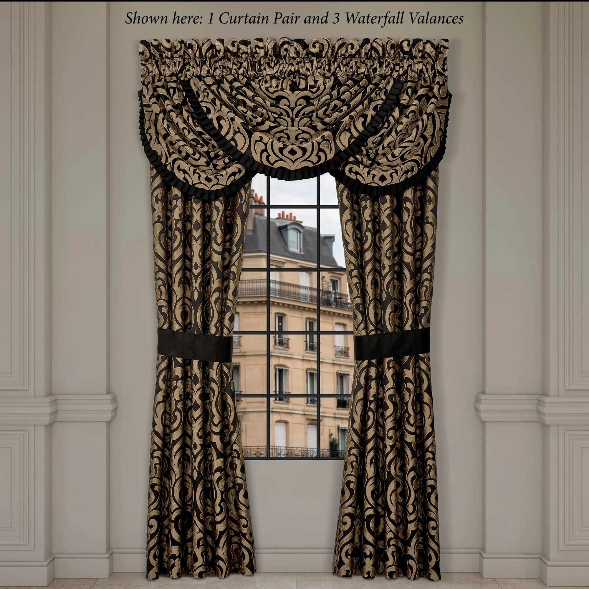 Lined Window Treatment has damask designs. The tailored Wide Curtain Pair includes tiebacks. Rod pocket is 3". Curtains are available in two lengths. Each Waterfall Valance has a pleated black polyester satin flange on the ends. Rod pocket is 3.25". We recommend one valance for every 12"-15" of window width.