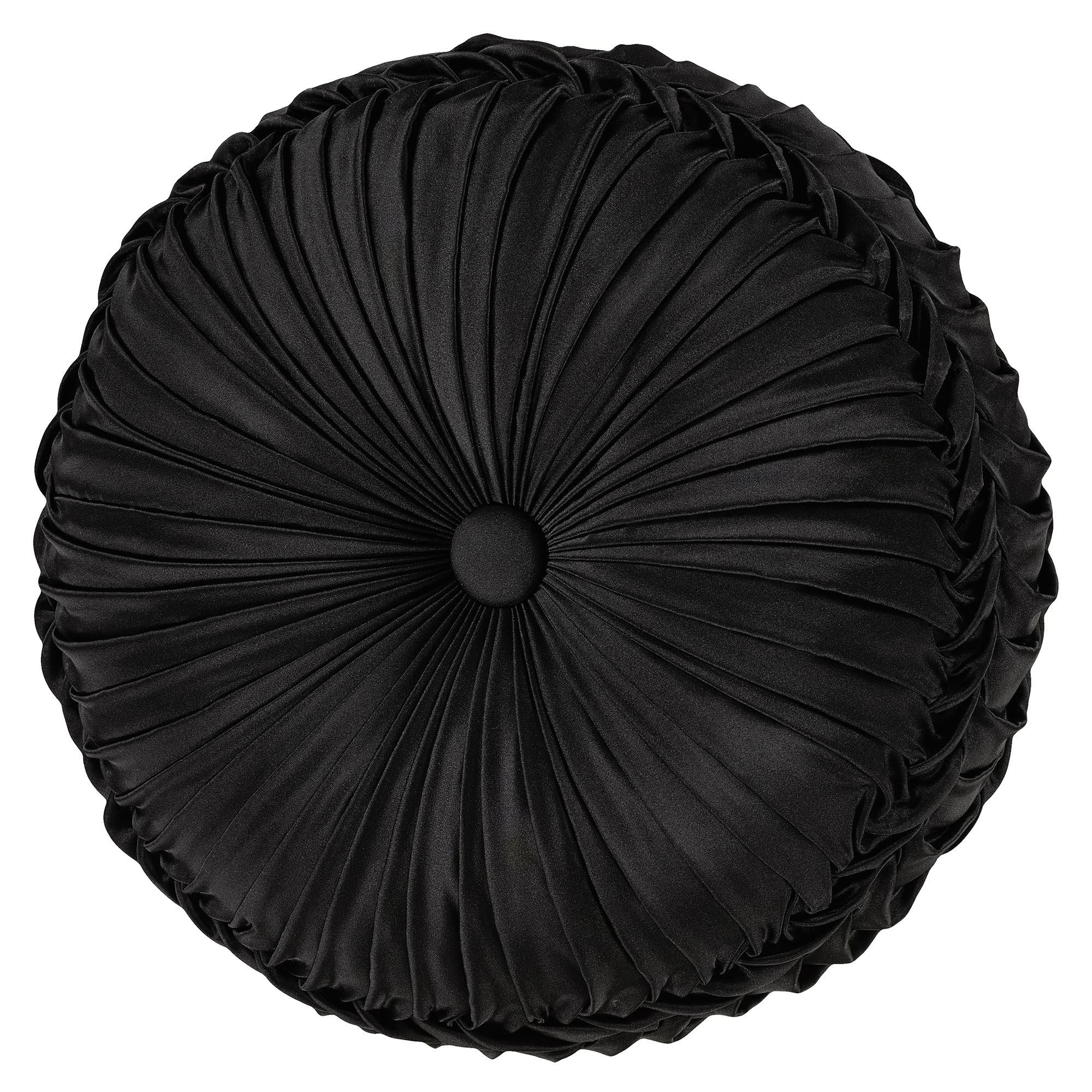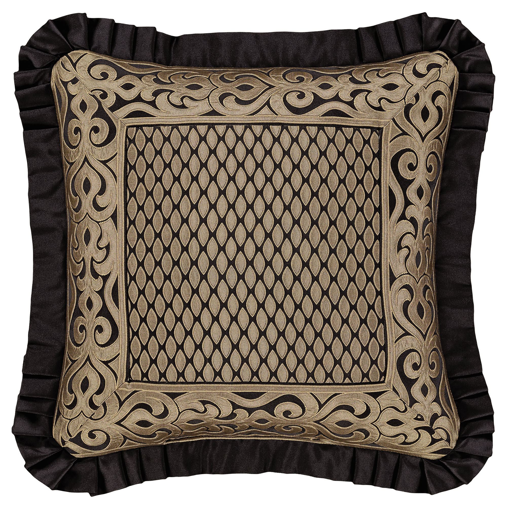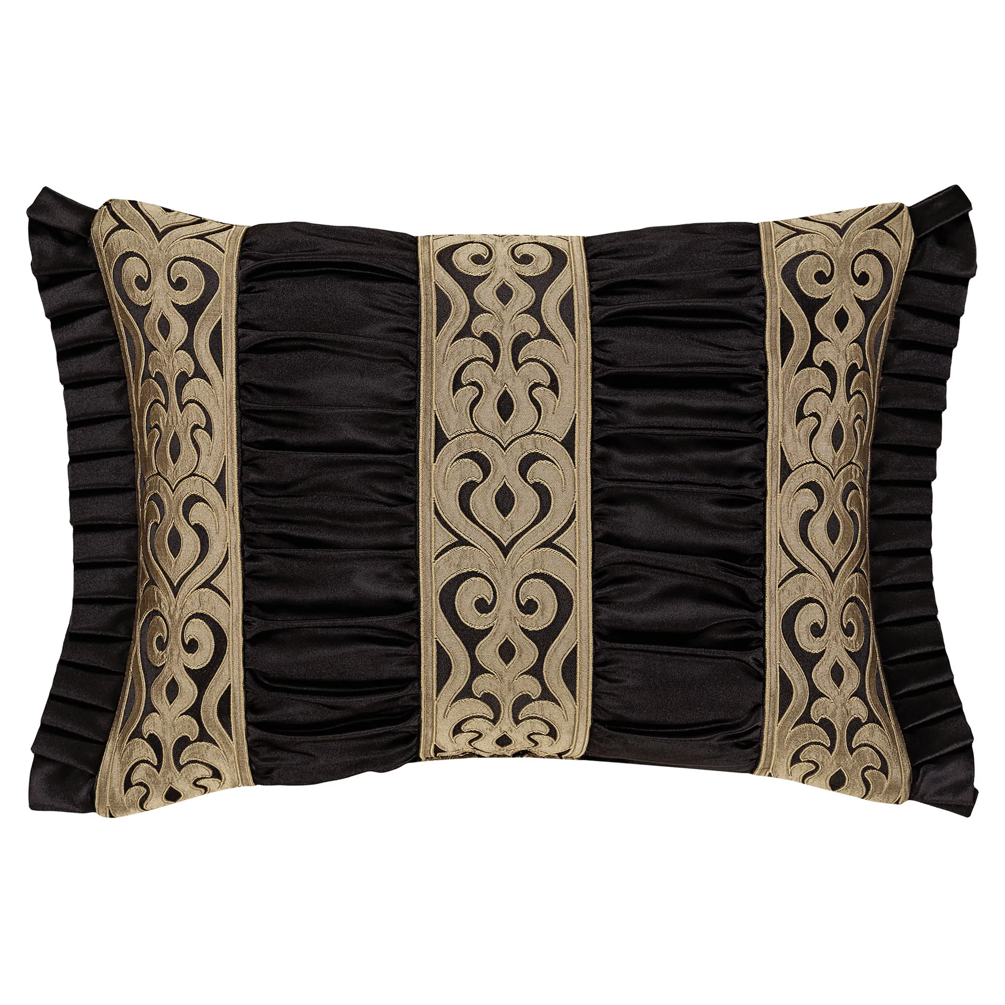 Pillows: Spot clean. The Flanged Square has a teardrop design in the center pieced with a scrolling frame; pillow has a flange with pleated corners and reverses to a teardrop pattern. The Piped Square has damask designs and reverses to a teardrop pattern. The piped Jumbo Rectangle has a teardrop pattern, a pieced scrolling center, a 2.5" side gusset, and a reverse with a teardrop pattern. The Flanged Rectangle alternates between scrolls and ruched black bands, has a pleated flange on the length ends, and reverses to a teardrop pattern. The handmade Round is pleated solid black polyester satin with a central button tuft and a 3" side gusset; round pillow is reversible.