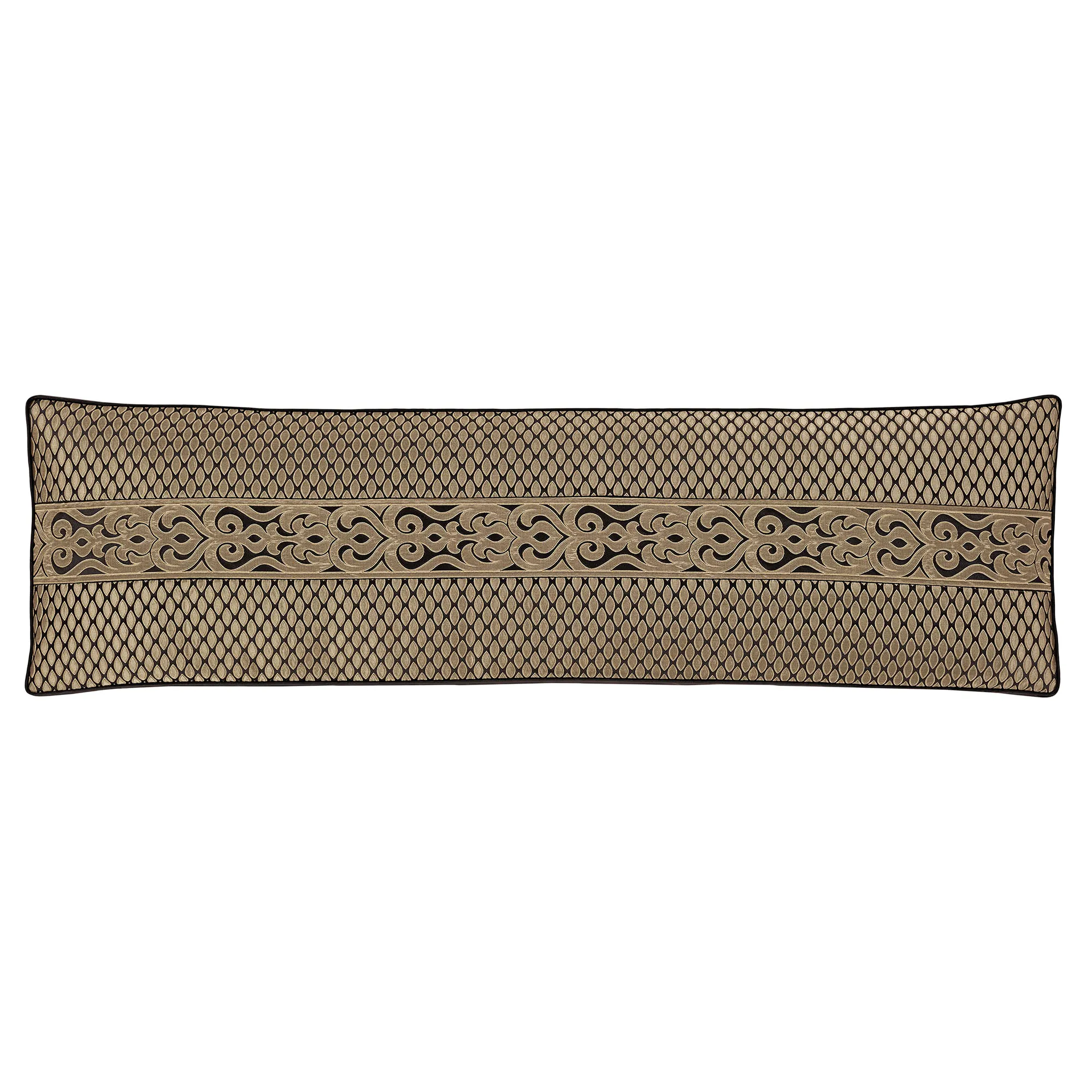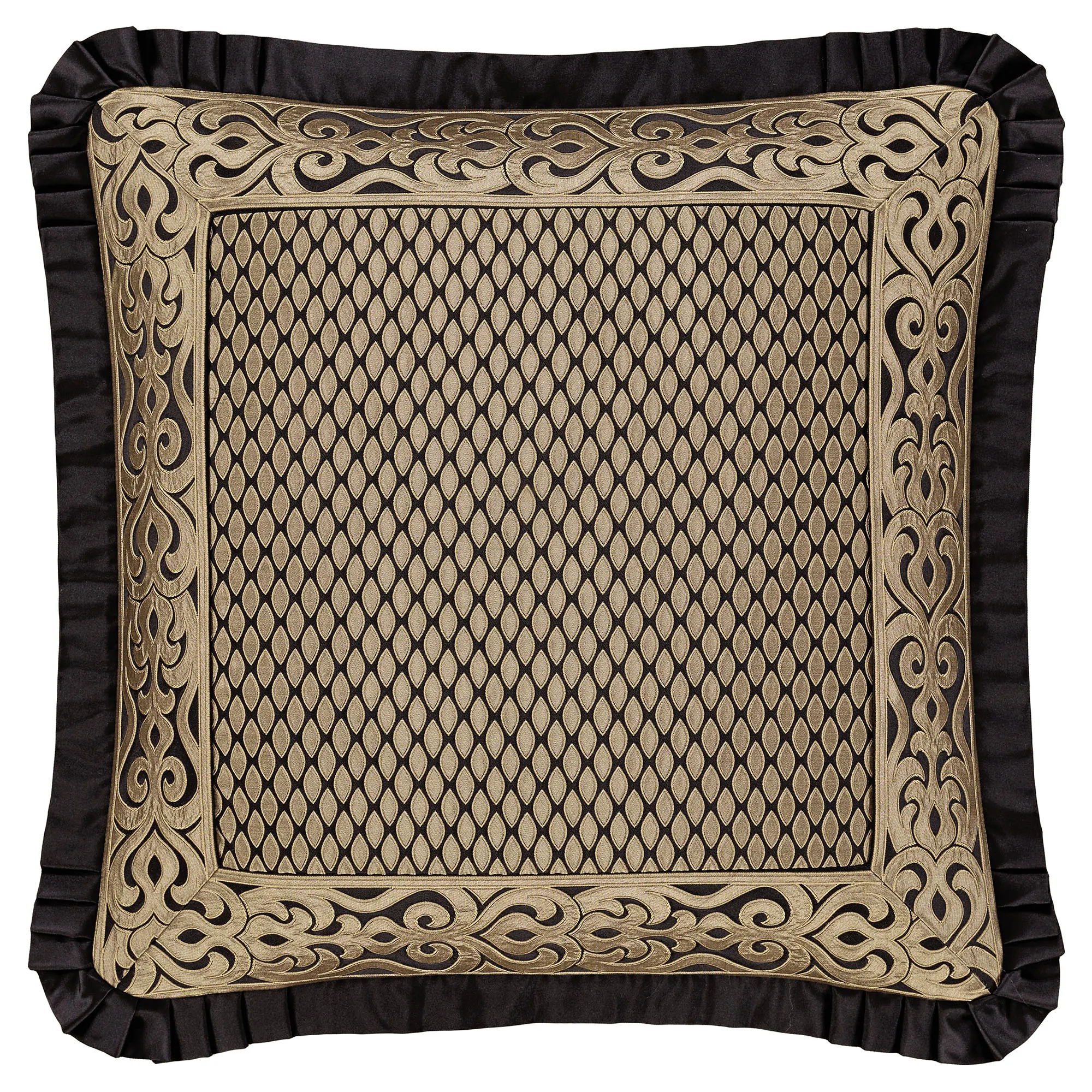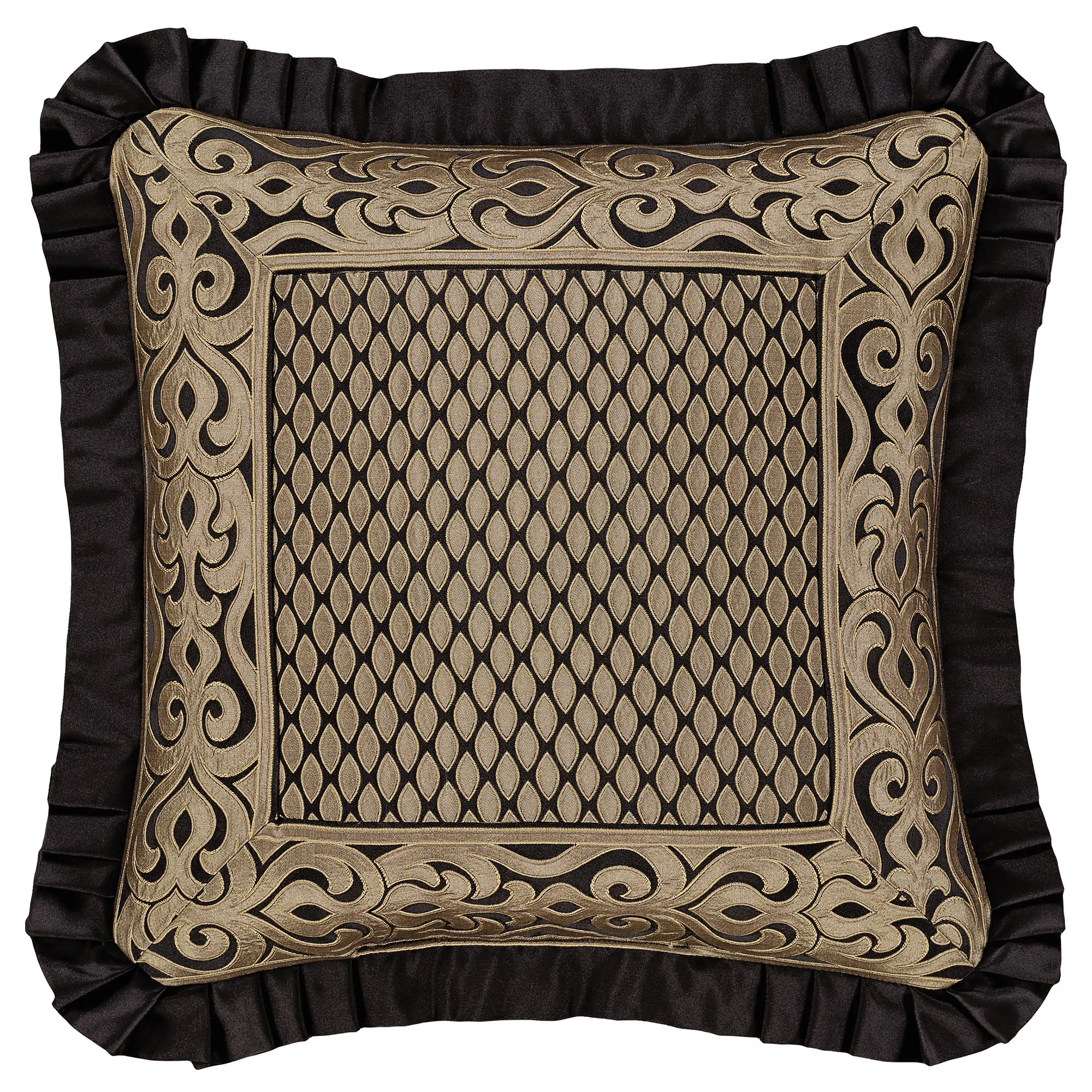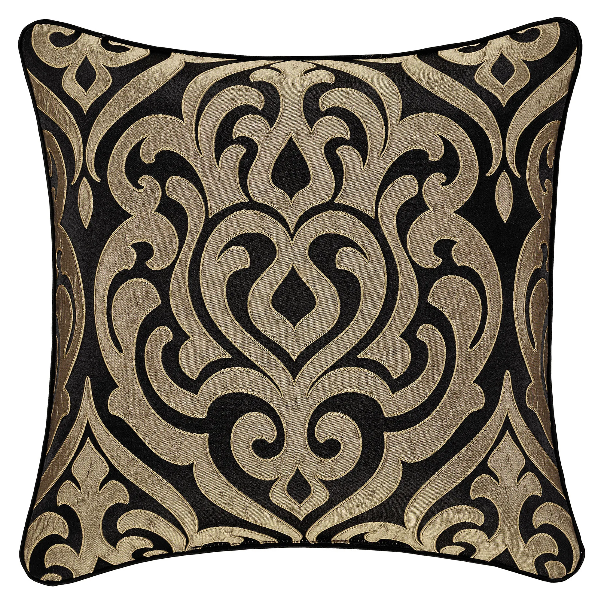 Pillows: Spot clean. The Flanged Square has a teardrop design in the center pieced with a scrolling frame; pillow has a flange with pleated corners and reverses to a teardrop pattern. The Piped Square has damask designs and reverses to a teardrop pattern. The piped Jumbo Rectangle has a teardrop pattern, a pieced scrolling center, a 2.5" side gusset, and a reverse with a teardrop pattern. The Flanged Rectangle alternates between scrolls and ruched black bands, has a pleated flange on the length ends, and reverses to a teardrop pattern. The handmade Round is pleated solid black polyester satin with a central button tuft and a 3" side gusset; round pillow is reversible.