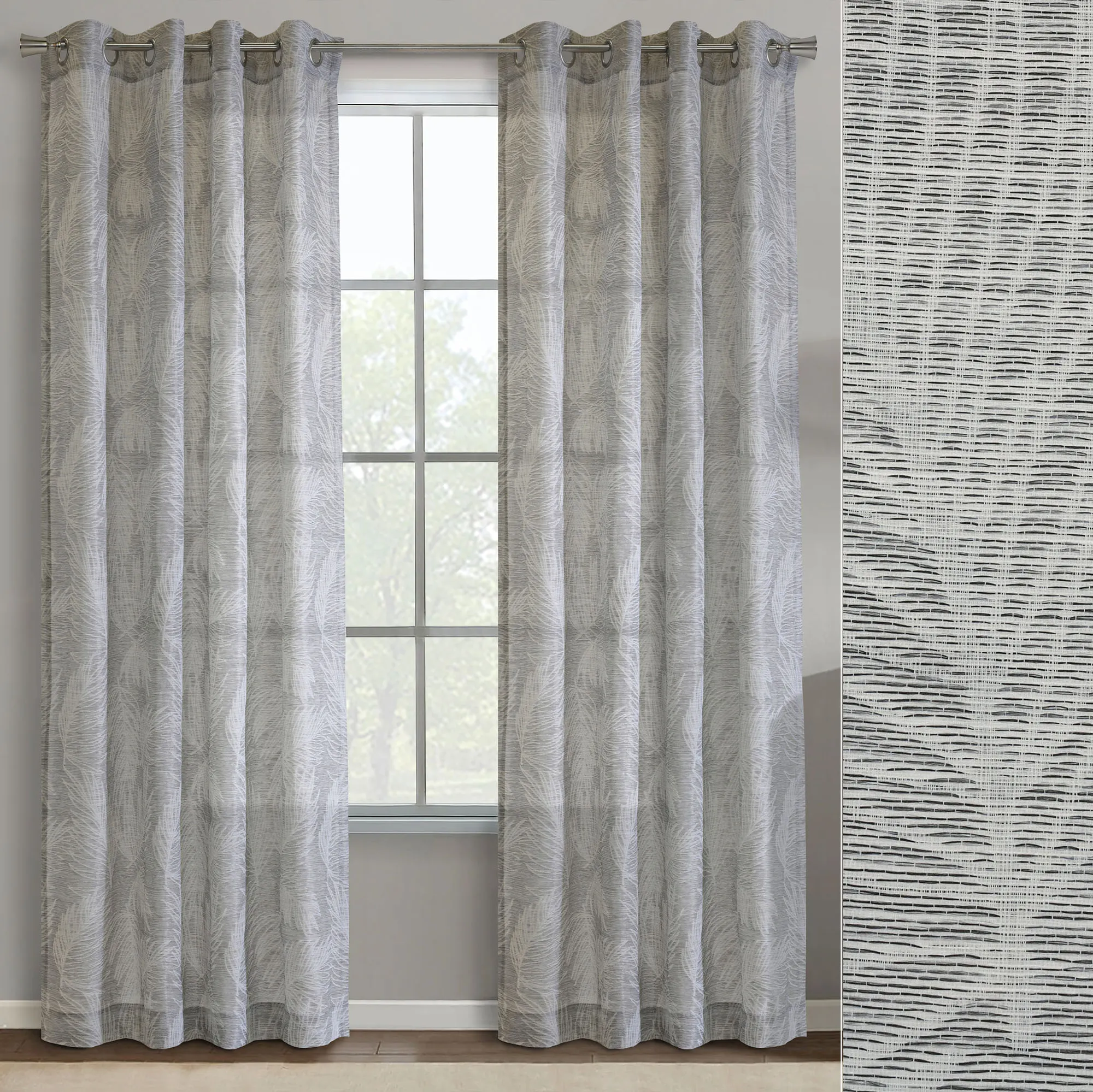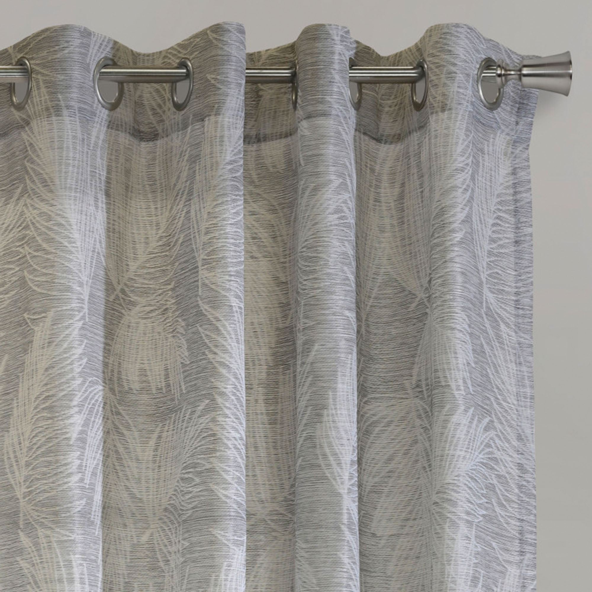 Cascading tropical leaves add a natural element to your space from the Boradal Grommet Curtain Panel. With a tonal dark gray hue, the jacquard-woven polyester window panel features a light-filtering design. Sold individually, each 52"W panel hangs via 1.5" dia. brushed silver metal grommets. Machine washable. Imported.