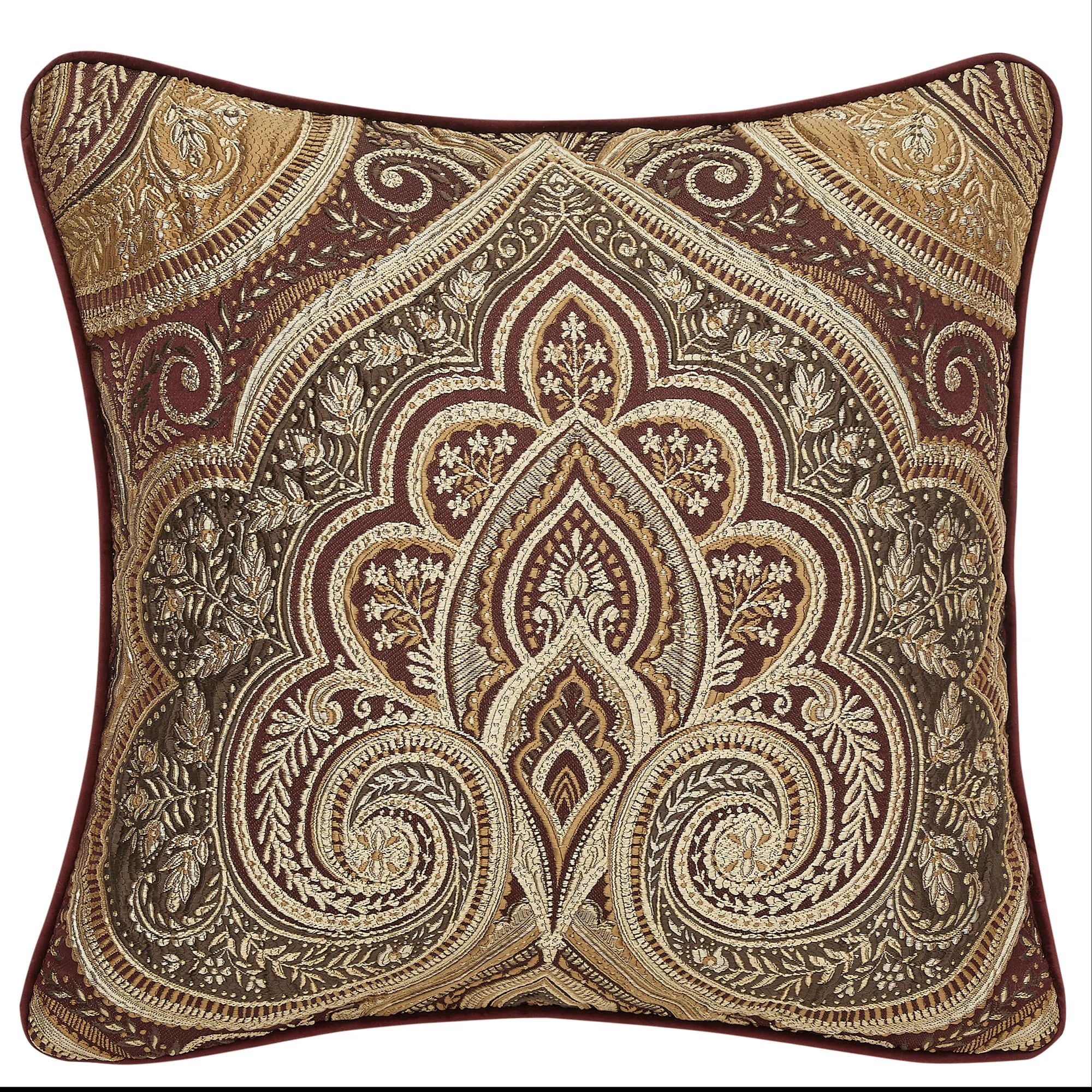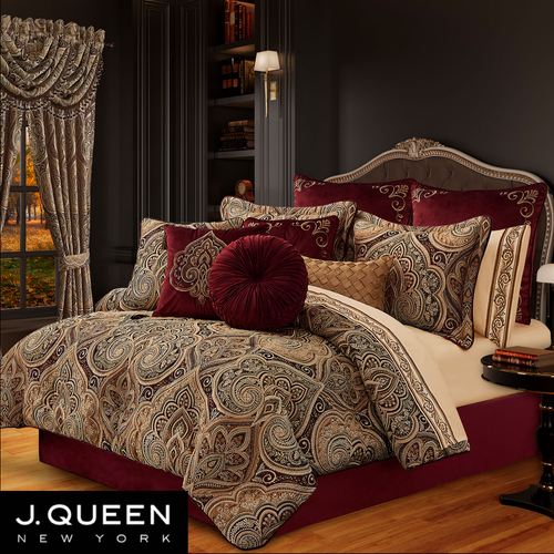 As richly complex as a bottle of Bordeaux wine, this ensemble from Five Queens Court appeals to high-class, exquisite tastes. Jacquard-woven with meticulous detailing, the polyester bedding features elaborate damask designs in robust shades of crimson, chocolate, and gold. Crimson velvet adds a richly textured appeal throughout the grand elements.