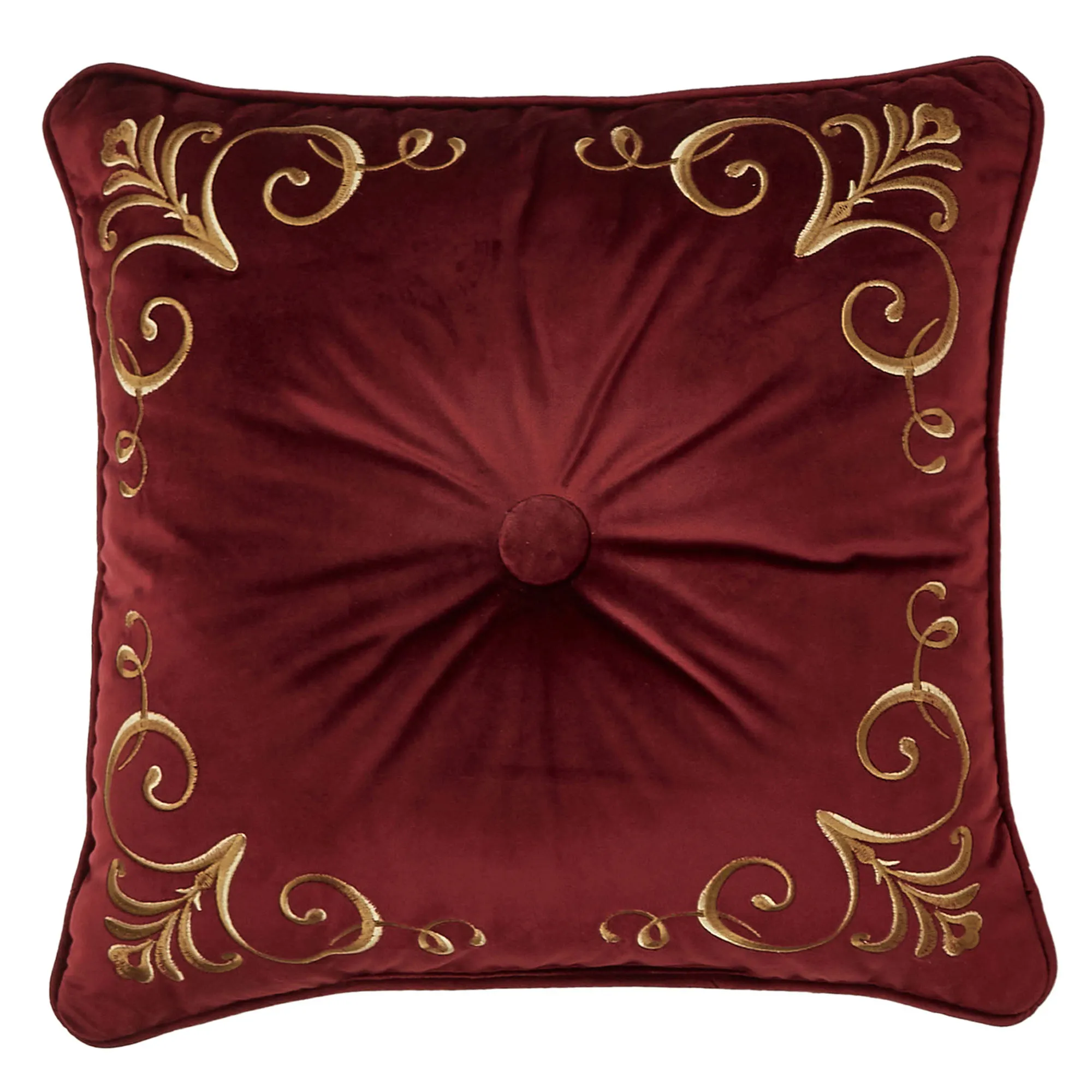 European Sham is crimson velvet with golden scrollwork corner embroidery and piped edges; reverses to crimson velvet; zipper closure.