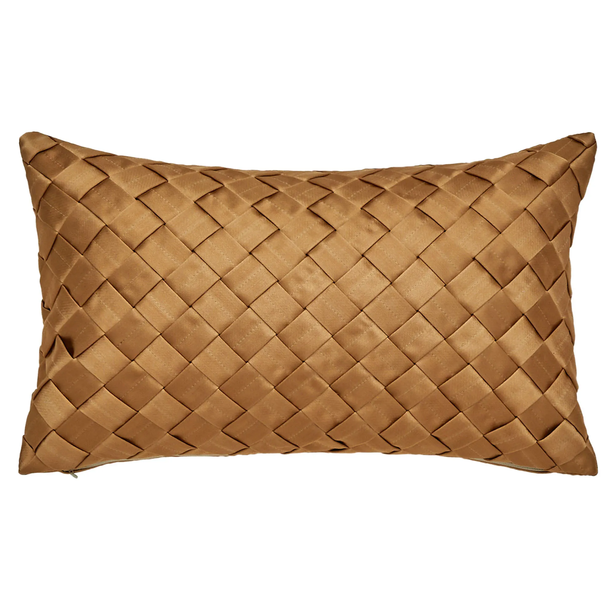 Pillows: Spot clean. The piped Tufted 18" Square is crimson velvet with a center button tuft and gold scroll embroidered corners; reverses to crimson velvet. The tailored Embroidered 18" Square is crimson velvet with damask embroidery and beaded corner tassels; reverses to crimson velvet. The piped 20" Square has damask, piped edges, and a crimson velvet reverse. Rectangle features basket-woven gold polyester satin with tailored edges. Reversible, handmade Round is pleated crimson velvet with a center button tuft and a 3" side gusset.