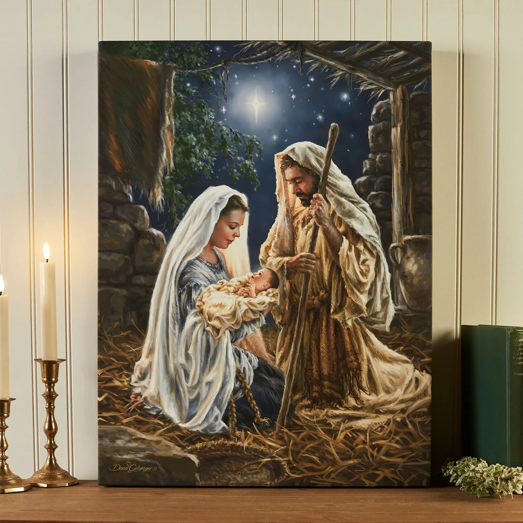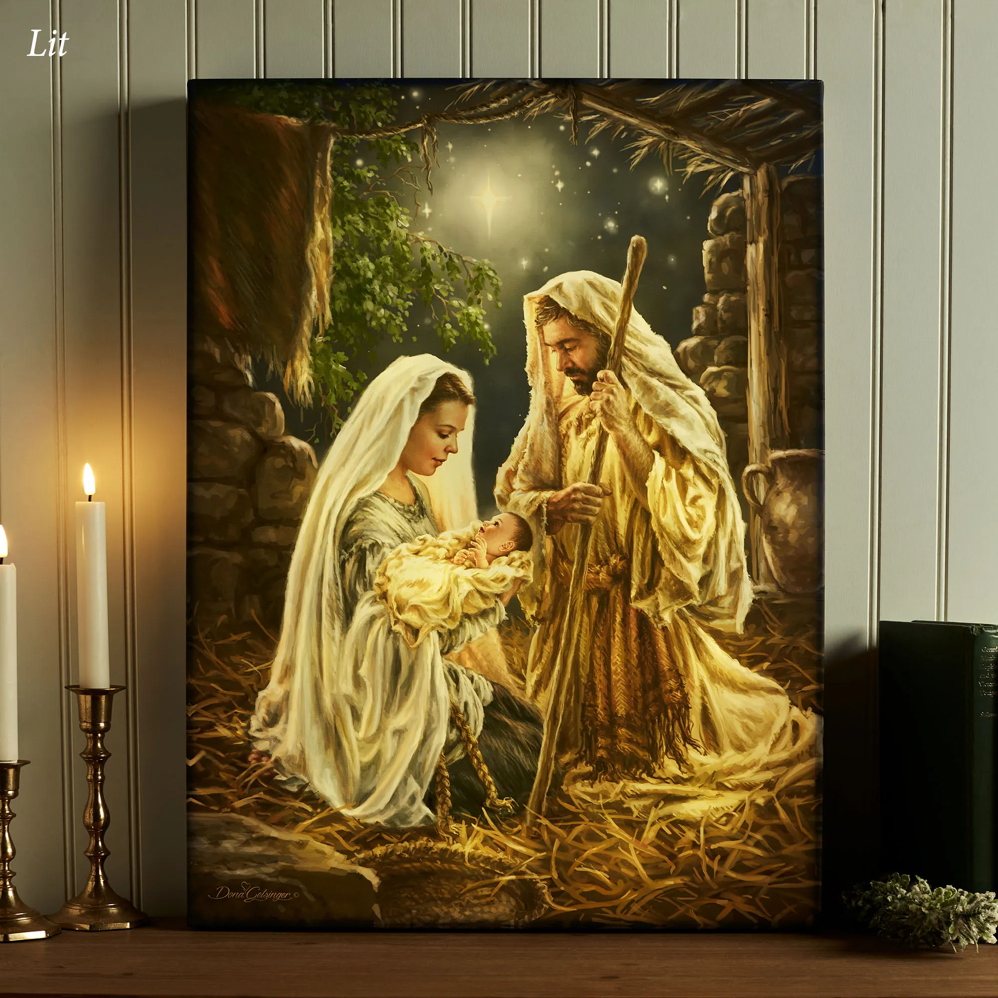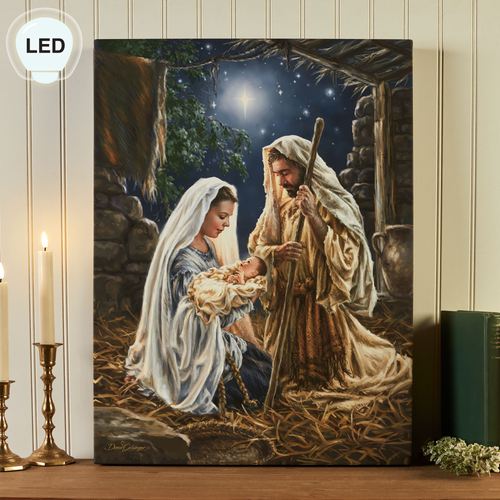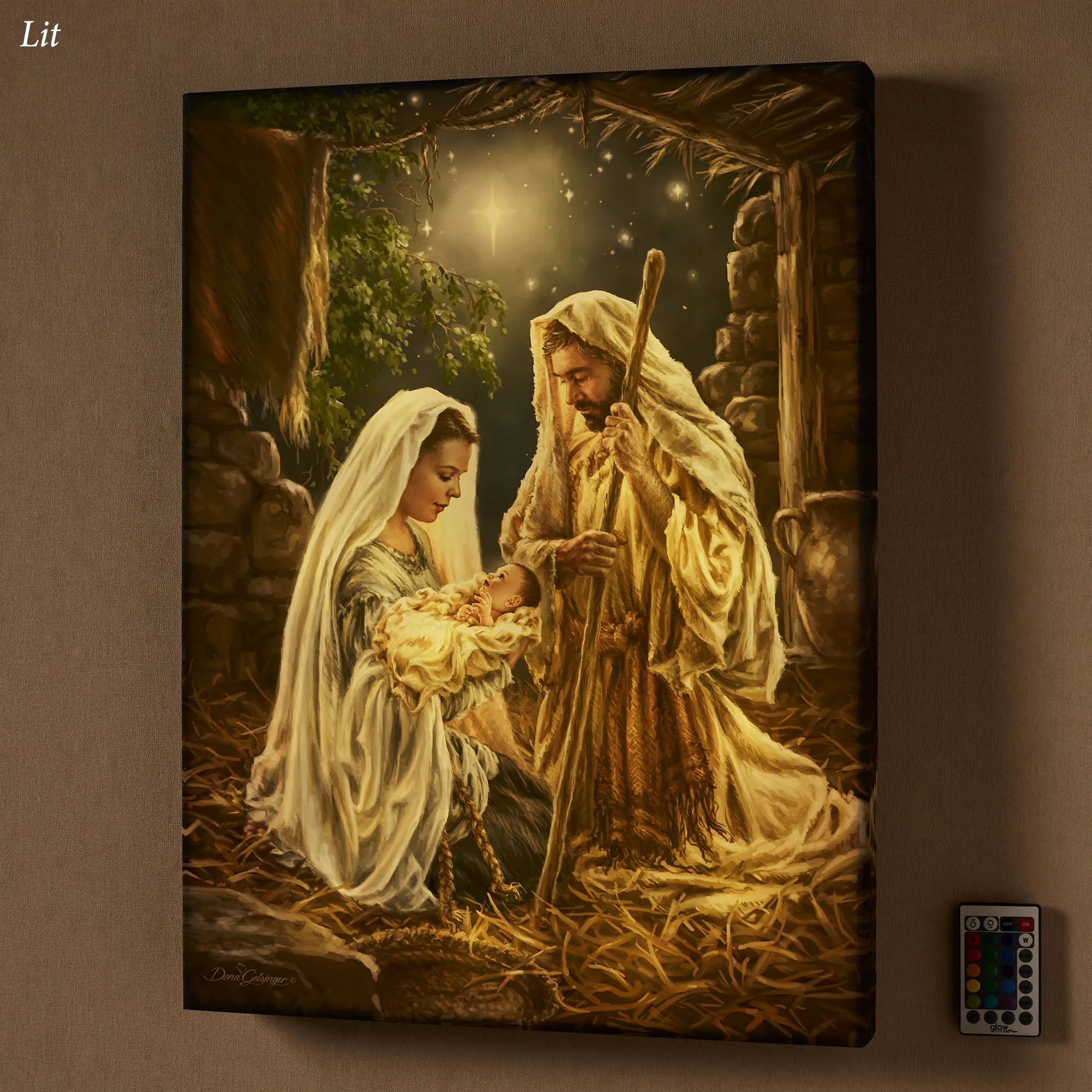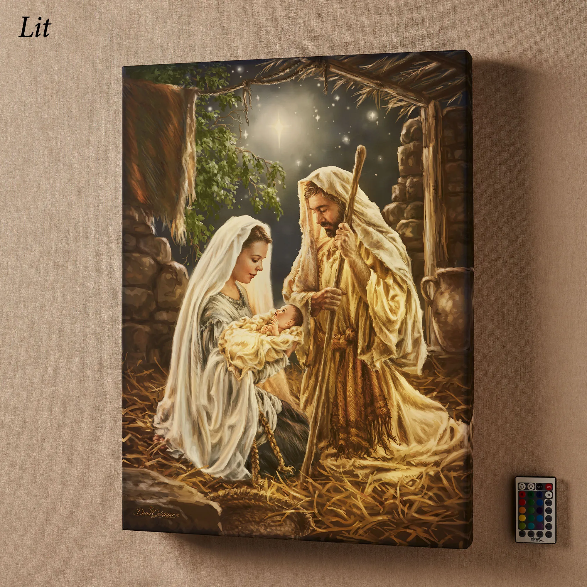 Let us adore the tiny baby Born in a Manger. This religious lighted wall art features the Holy Family in a stable kneeling on golden straw as Joseph looks lovingly at the tiny newborn child in Mary's arms; a stunning blue sky and North Star accent the background. This Glow Decor(R) light-up art, from artist (C)Dona Gelsinger, is printed on a silky satin cloth, gallery-wrapped around a wooden frame, and fully illuminated with 30 LED lights. Artwork requires three AA batteries, not included, or your adapter for use with the included USB cord. The included remote, with battery, has many functions; click on the Details tab to read more. Measures 18"Wx2"Dx24"D. Imported/USA.