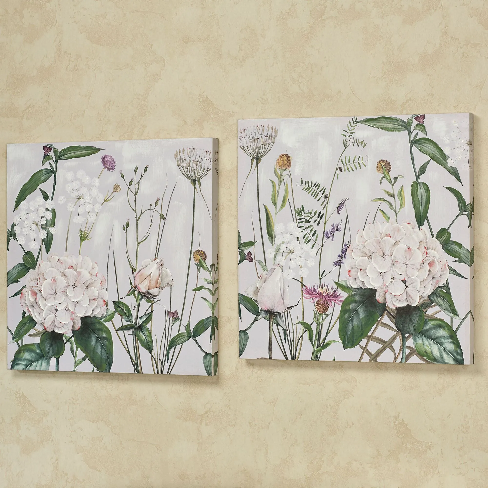 The Botanical Beauties Floral Wall Artworks are canvases gallery-wrapped around wood frames.