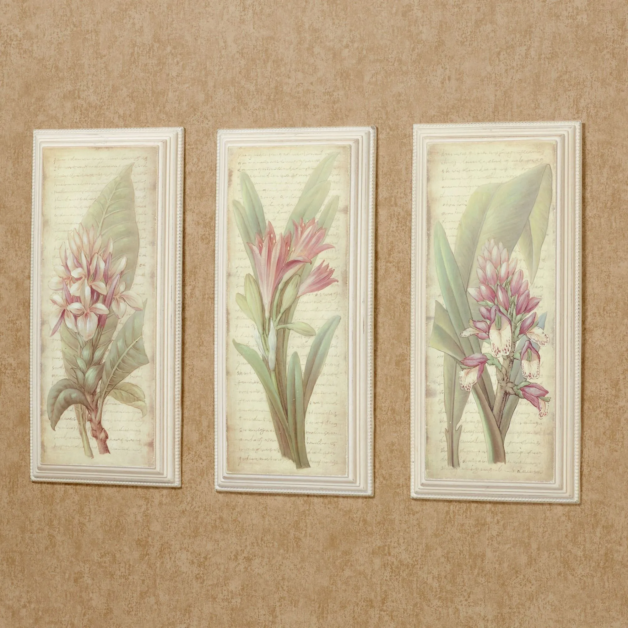 These intriguing Botanical Blooms uniquely blossom into pretty pink flowers. Wooden wall art plaque set has flowers and script on an antique, light cream background and handpainted embellishments. Outer borders have beaded trim and a distressed look. The unique texture used creates a look similar in appearance to a chalk drawing. Each is 10.5"Wx1.5"Dx22"H.