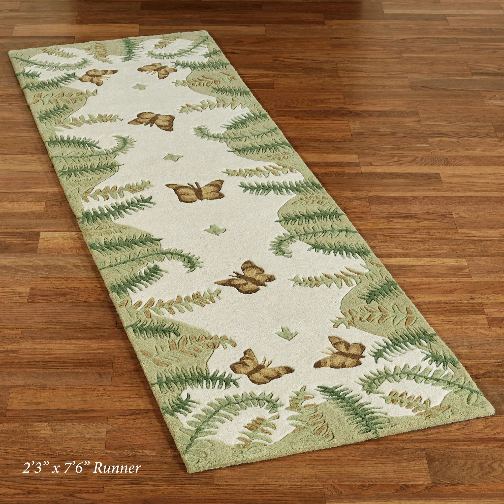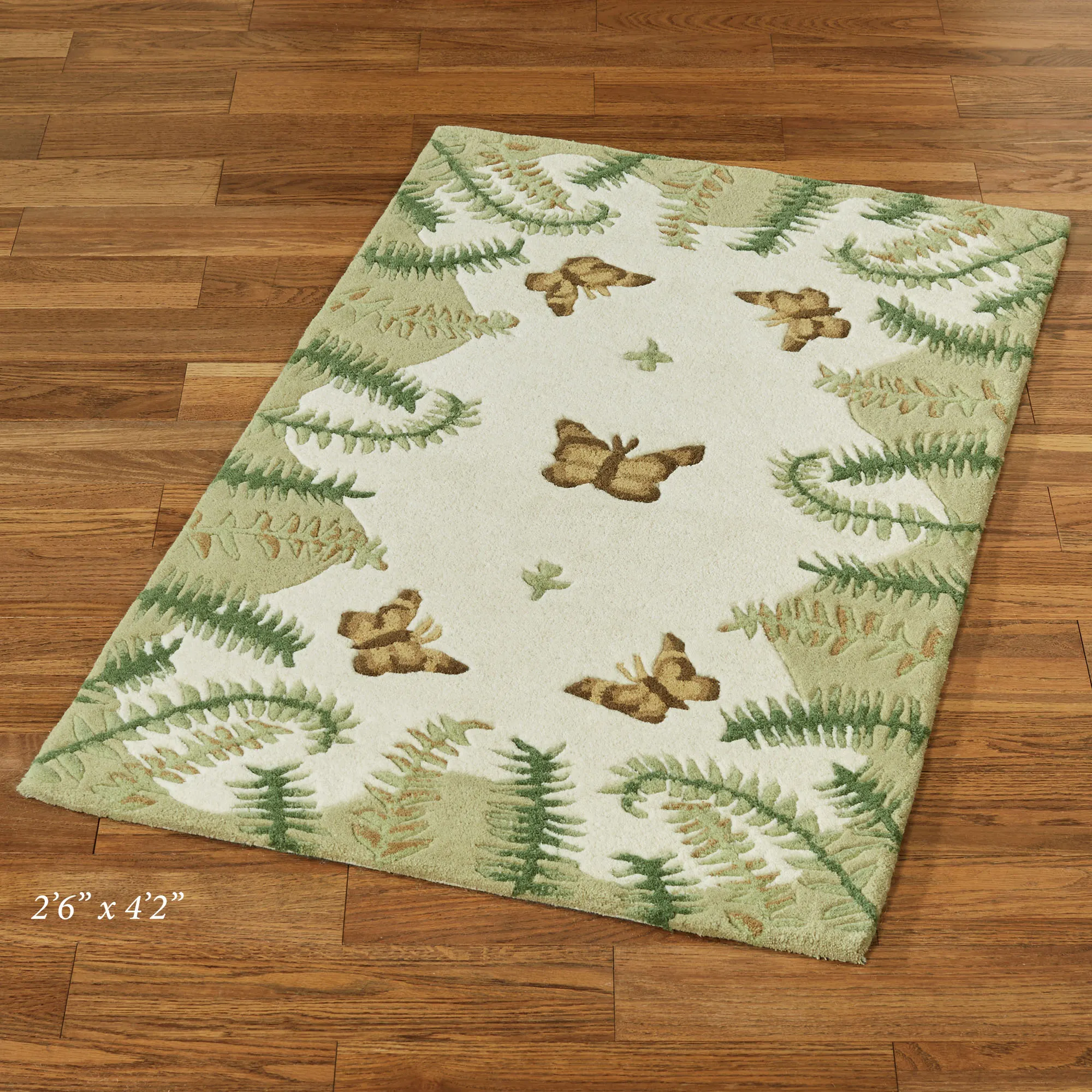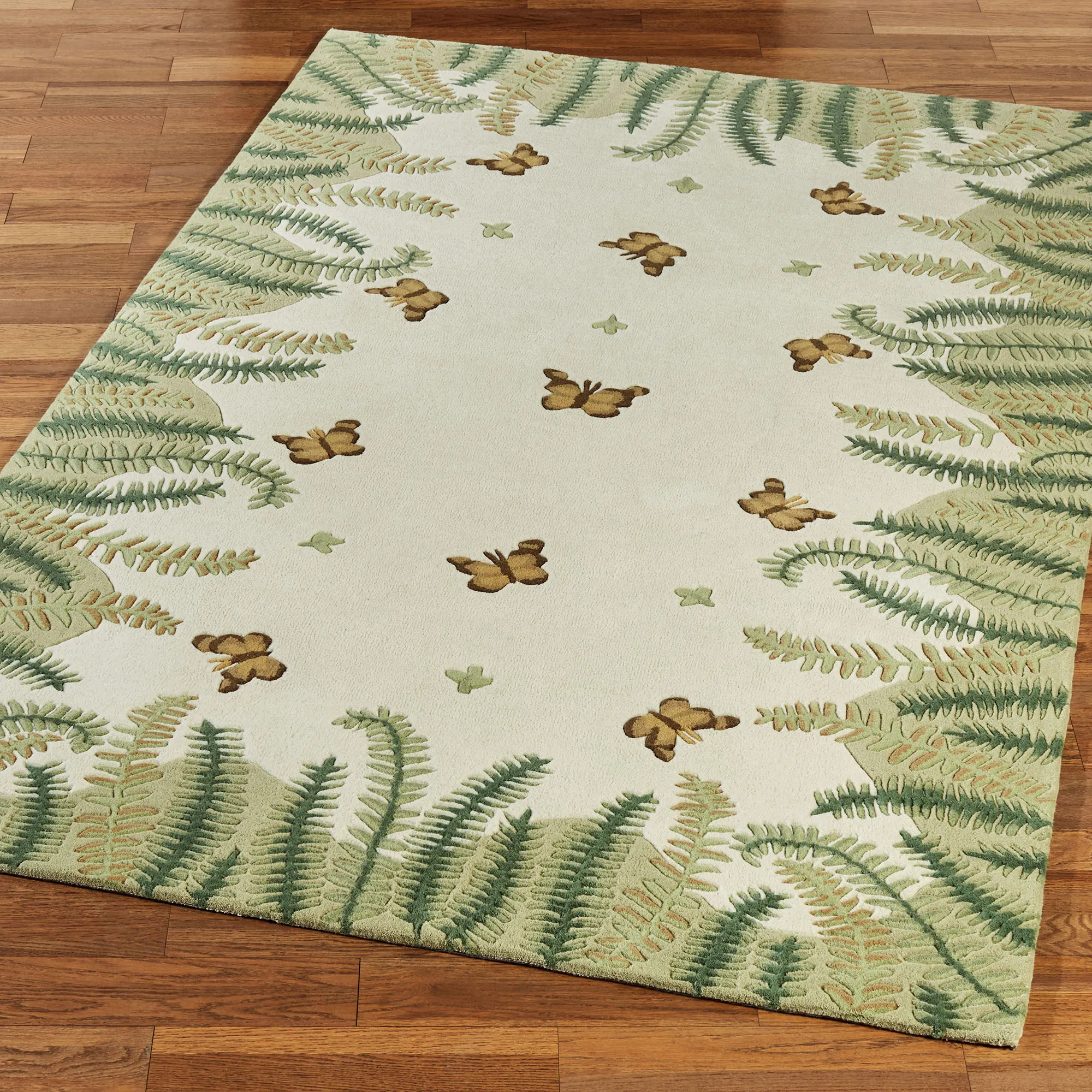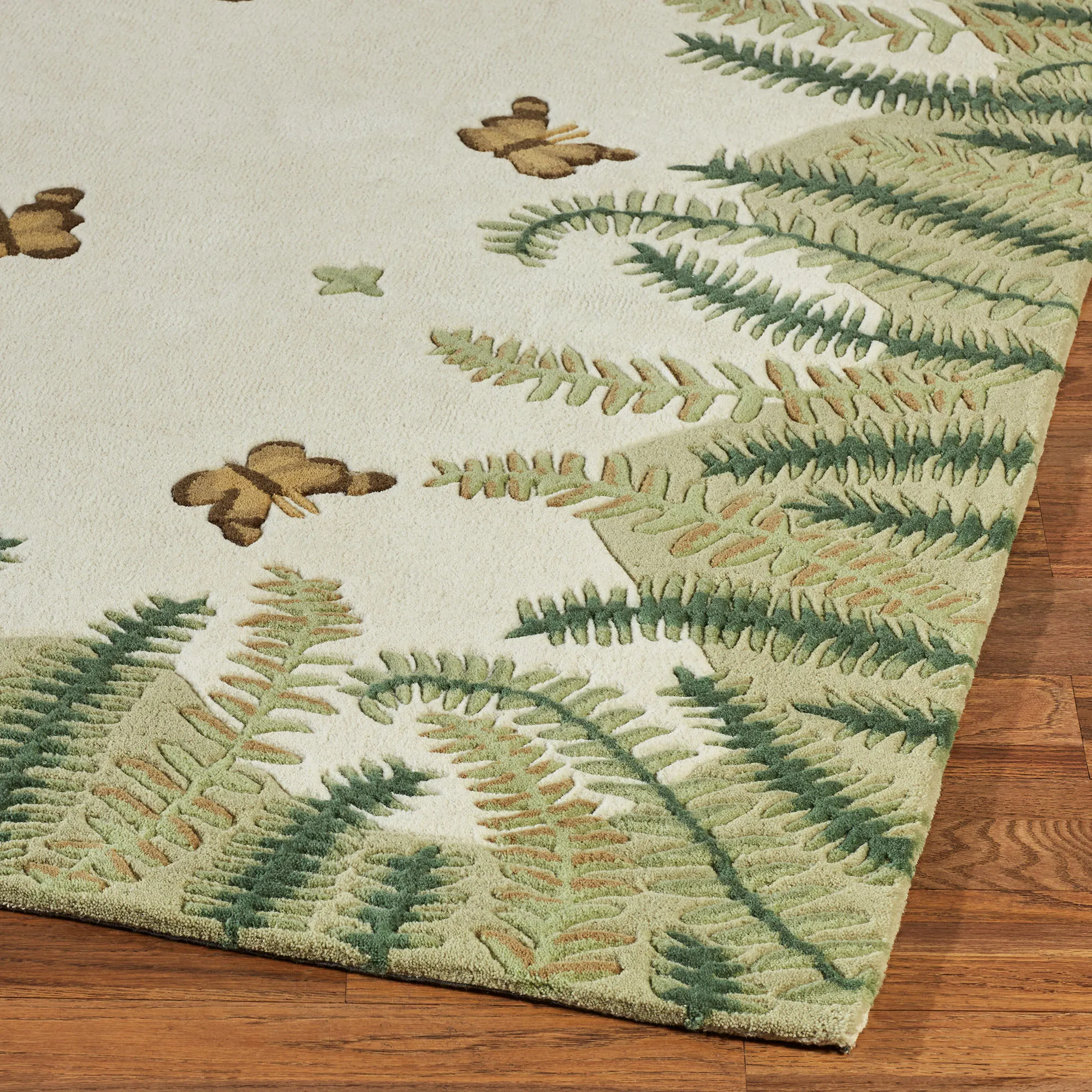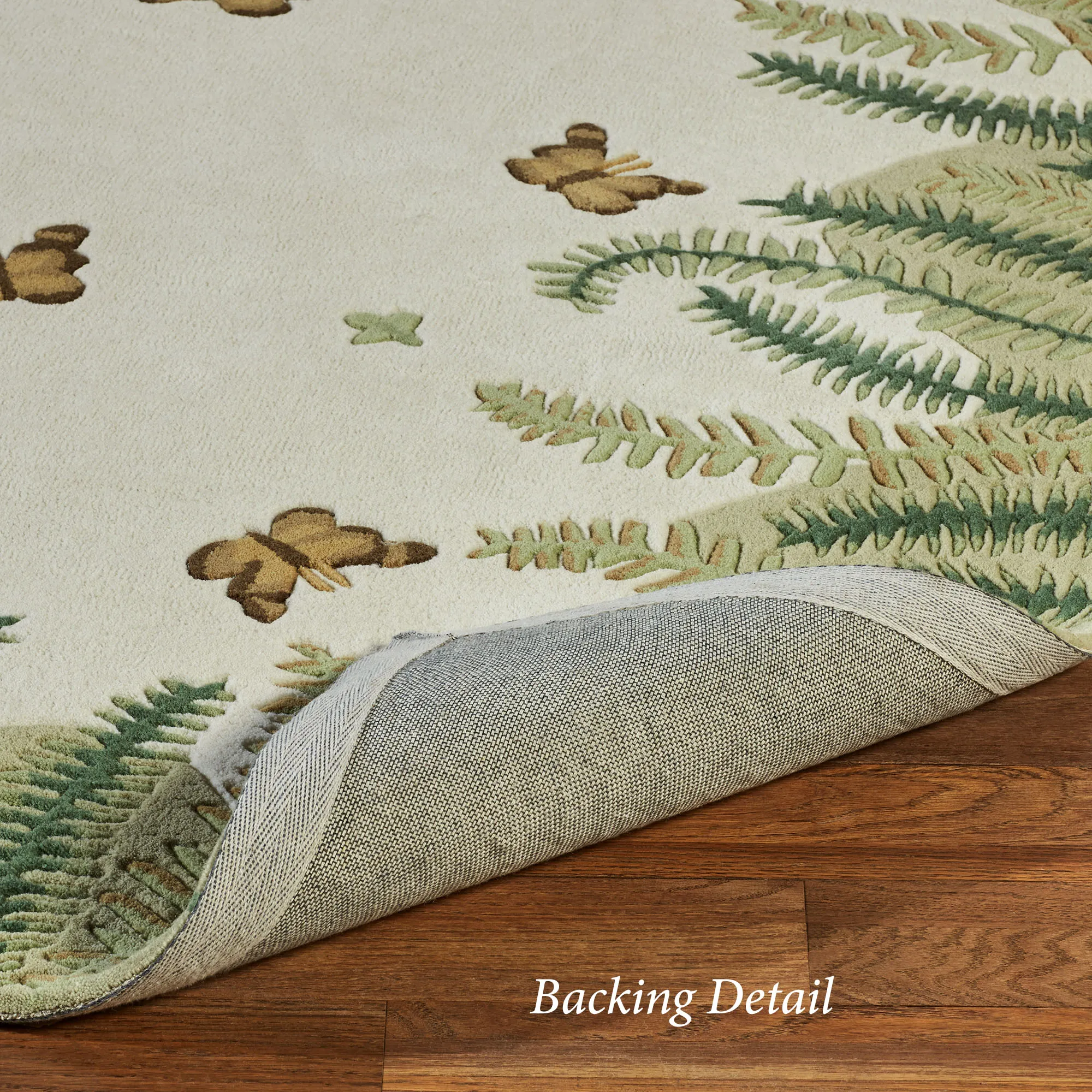 Behold the beauty of the Botanical Butterfly Rug. Handcrafted in India from pure wool, the .75" thick, hand-tufted and handcarved rug features a lush fern border surrounding flitting butterflies and falling leaves. Natural shades of eggshell, pine green, sage, pale green, cocoa, light brown, and camel add a soothing touch. Backing is cloth-covered latex. We recommend professional cleaning by a rug cleaner.