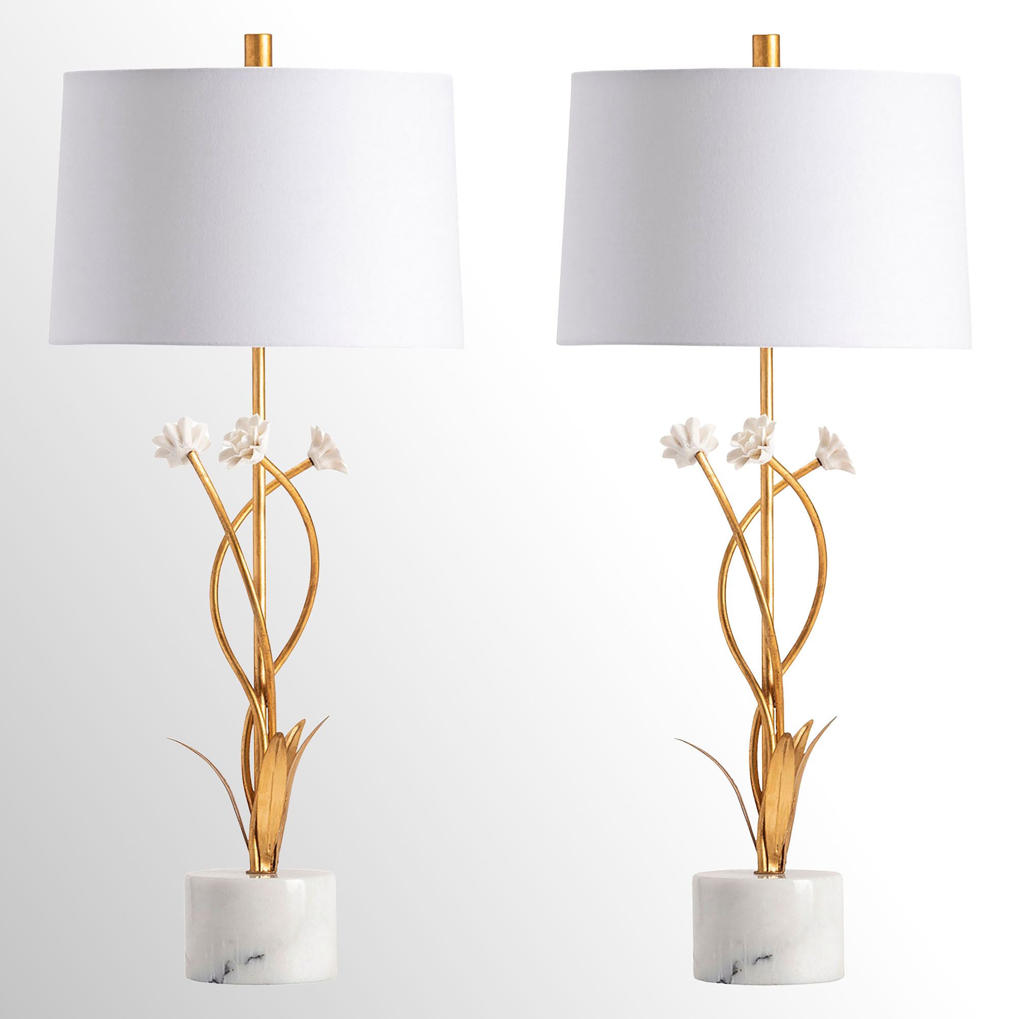 Grace your home with the charm of a Botanical Garden from this table lamp pair. Designed by David Lee, the sophisticated, nature-inspired table lamps feature white marble round bases and metallic gold candlestick fonts surrounded by flowering plants. White ceramic flowers sprout from the curling metal plants, which also have flaring leaves. A chic white linen drum shade and 2"H gold cylinder finial complete the designs. UL listed. Each lamp requires one 100W max. bulb and measures 14"dia.x31.5"H overall. Pair weighs approx. 18 lbs.