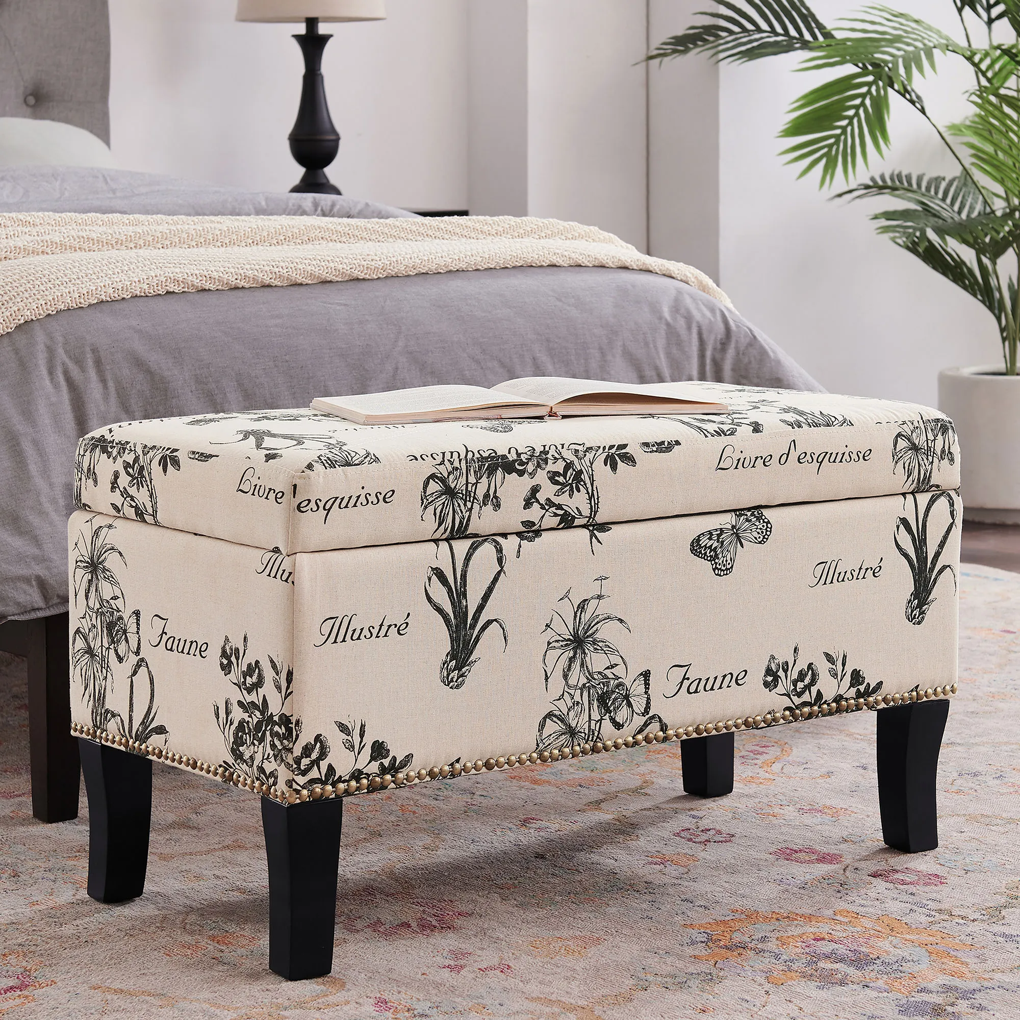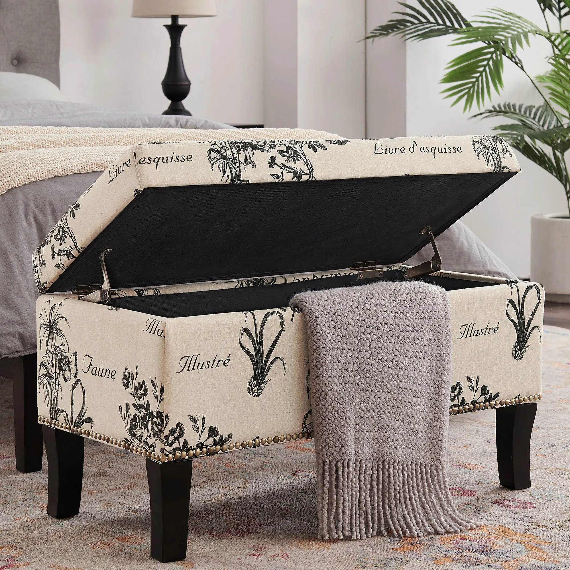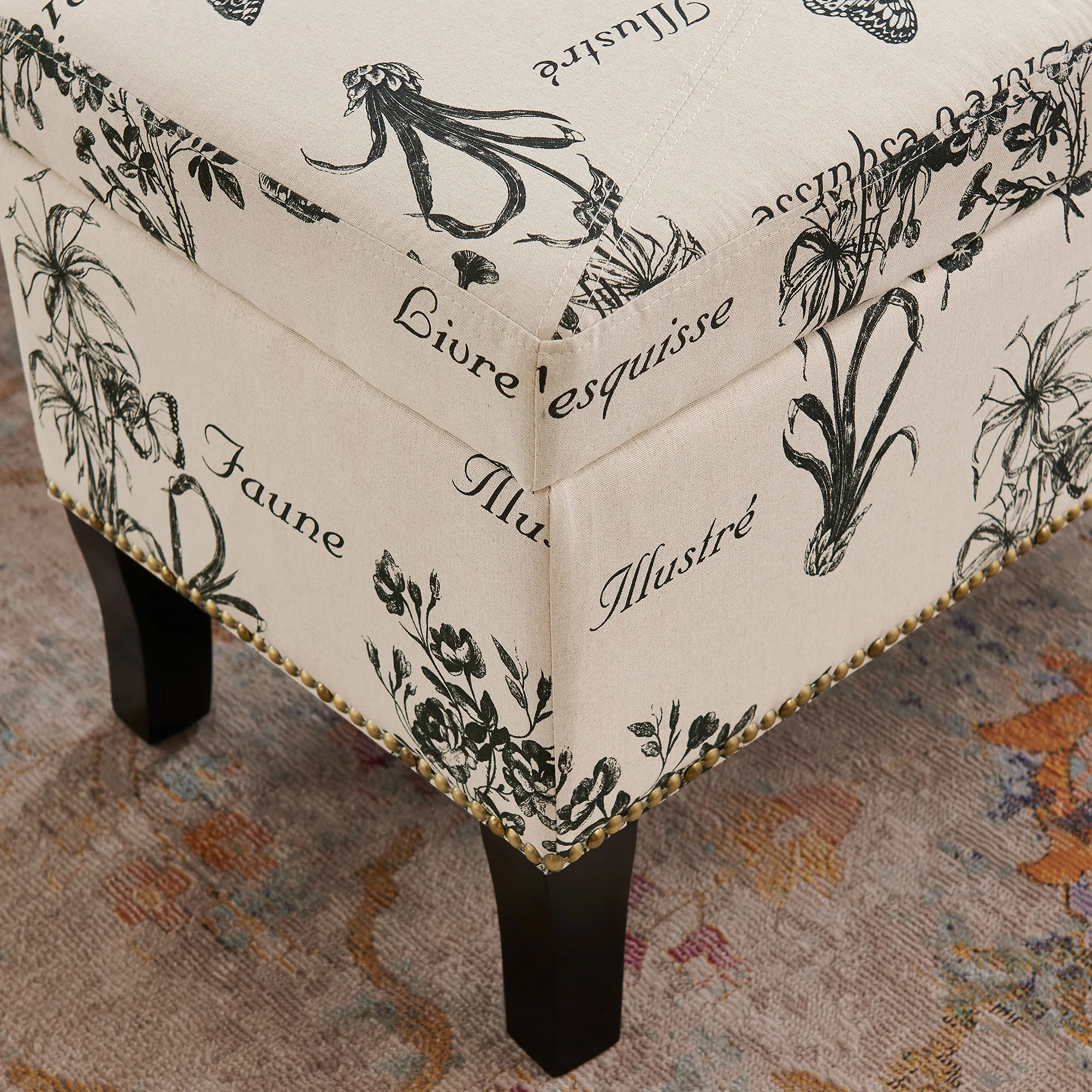 The Botanical Storage Bench embraces nature alongside classic design. Black butterflies, flowers, leaves, and French words pattern the charming cream linen upholstery, while brass metal nailhead trim and black-finished wood legs complete the look. The foam-cushioned lid provides extra seating but also opens on safety hinges to a lined storage interior measuring 29"Wx13"Dx7.5"H. Maximum weight is 350 lbs. Overall, the bench measures 32"Wx16"Dx18"H and weighs approx. 28 lbs. Spot clean the fabric.