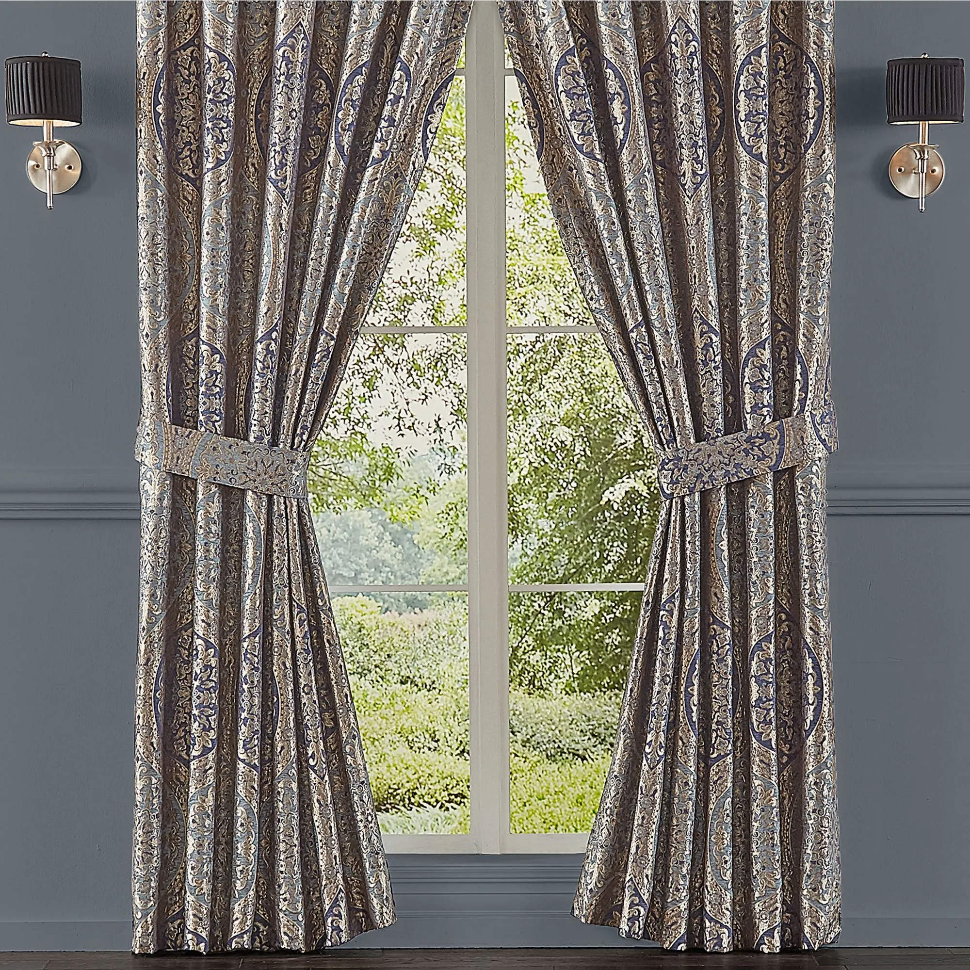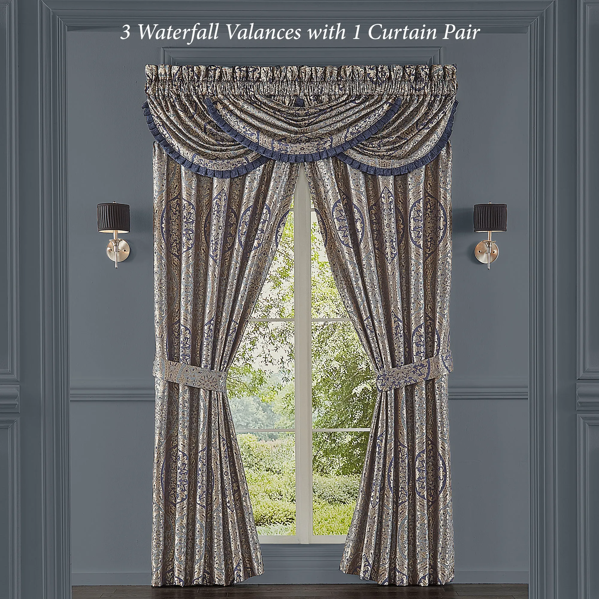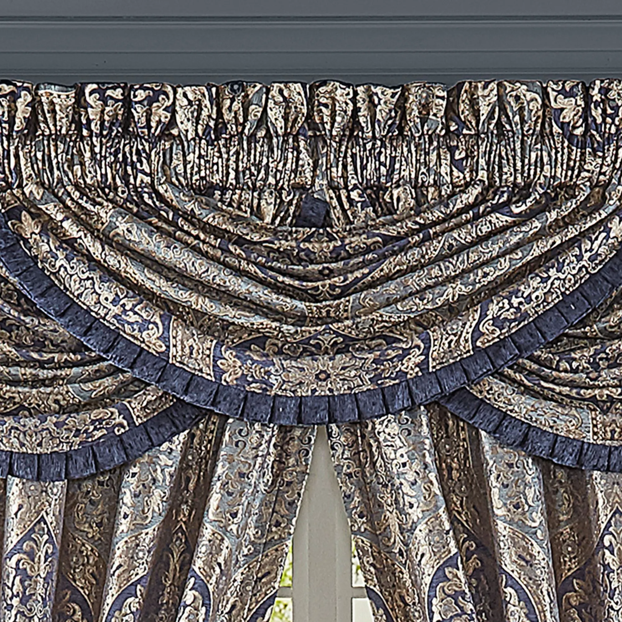 Window Treatments have ogee medallions and 3" rod pockets. Lined Wide Curtain Pair has tailored edges and includes tiebacks. Each Waterfall Valance has navy chenille pleated edges. We recommend one valance for every 12"-15" of window width.