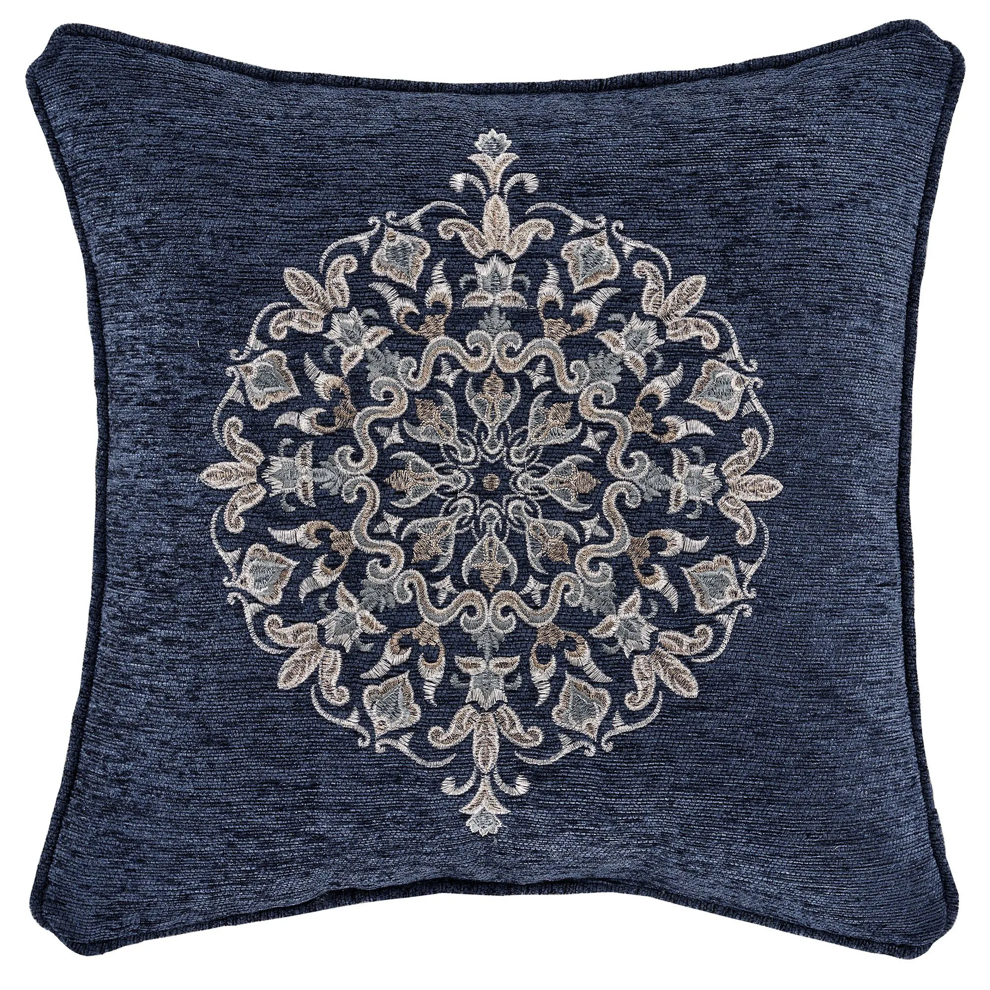 Pillows: Spot clean. Reversible handmade Round is pleated dusty blue chenille with a button tuft and a side gusset. Tailored Rectangle is navy chenille with a center embroidered band of golden scrollwork, gimp trim accents, and beaded tassel ends. The piped Jacquard Square has an ogee medallion design. The Embroidered Square is navy chenille with a coordinating medallion and piped edges.