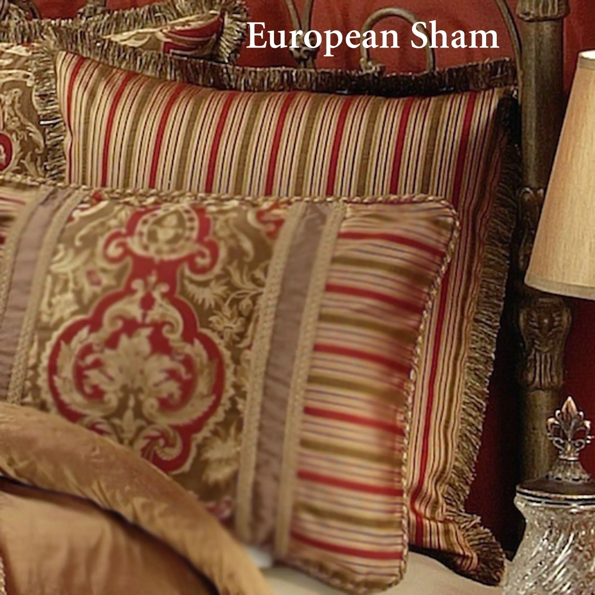 Reversible European Sham has stripes on one side and scrolls on the other; sham also has brushed fringe on ends; zipper closure.