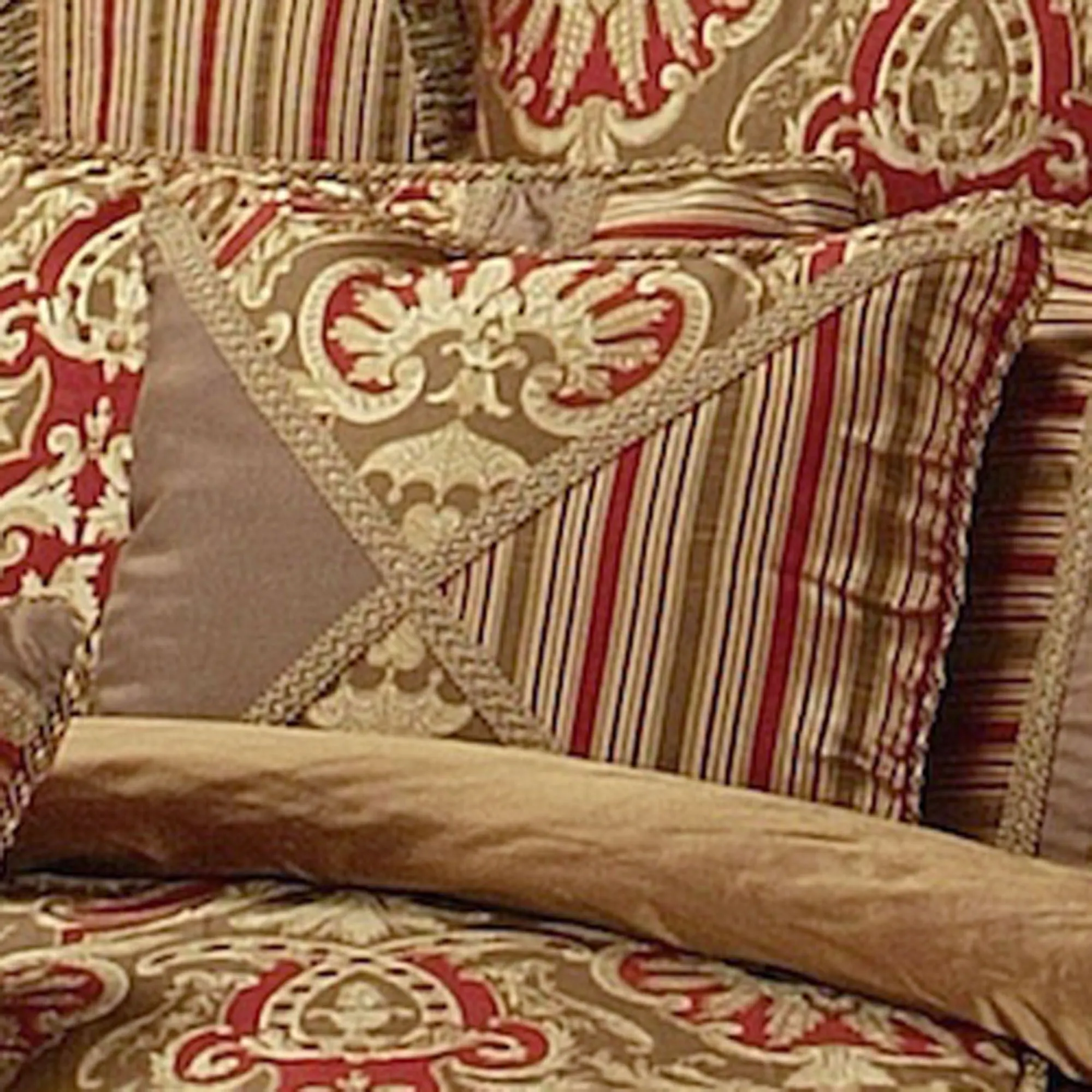 Pillows have gimp trim, scrolls, stripes, and gold sections. Pillows are reversible to coordinating stripes. Spot clean. Fringed Square has brushed fringe and mitred corners. Rectangle has twist cording all around. Piped Square has crisscross trim.