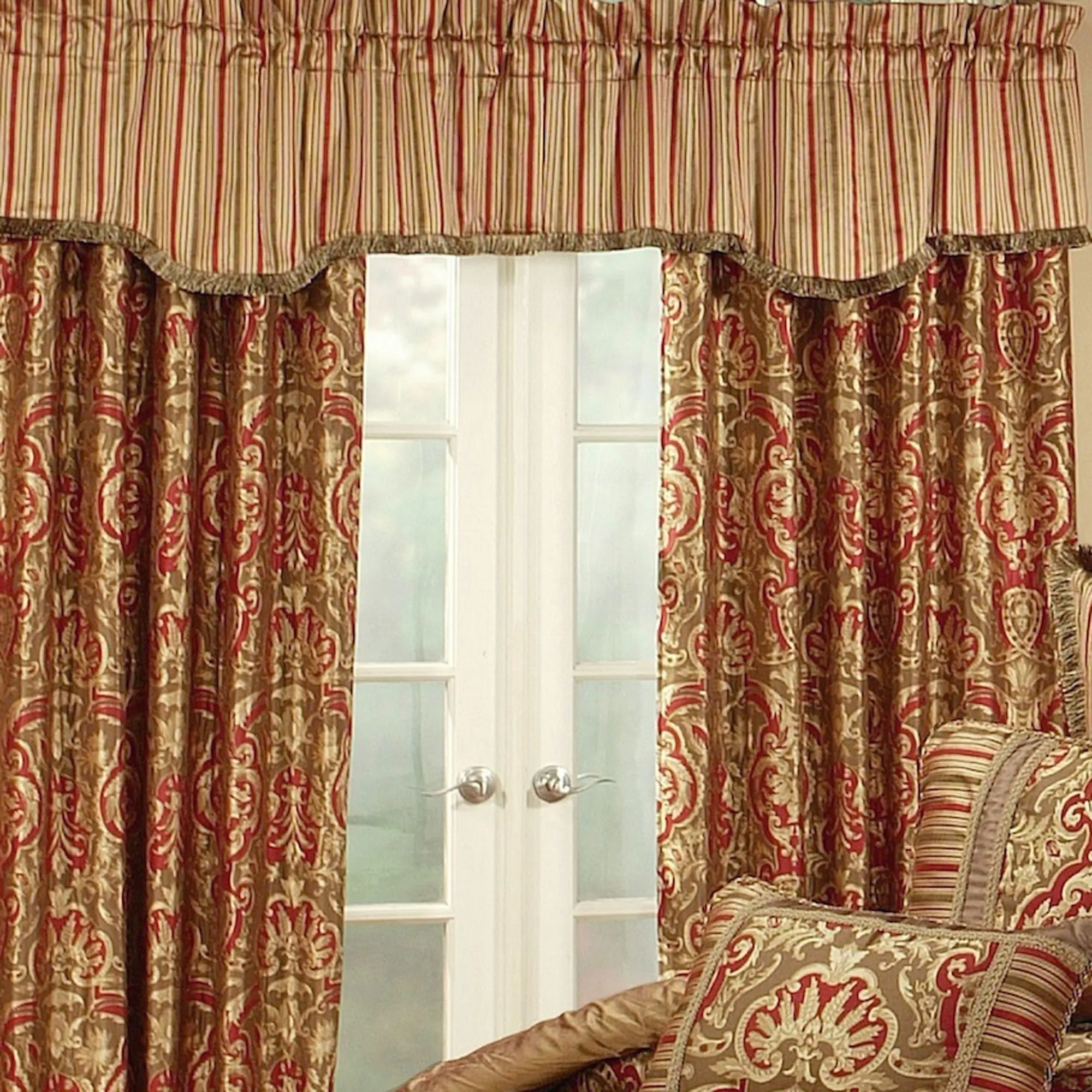 Lined Window Treatment has a 3" rod pocket. Wide Curtains are tailored and mimic the comforter; tiebacks included. Valance has stripes, an arch at the bottom, and brushed fringe on the ends.