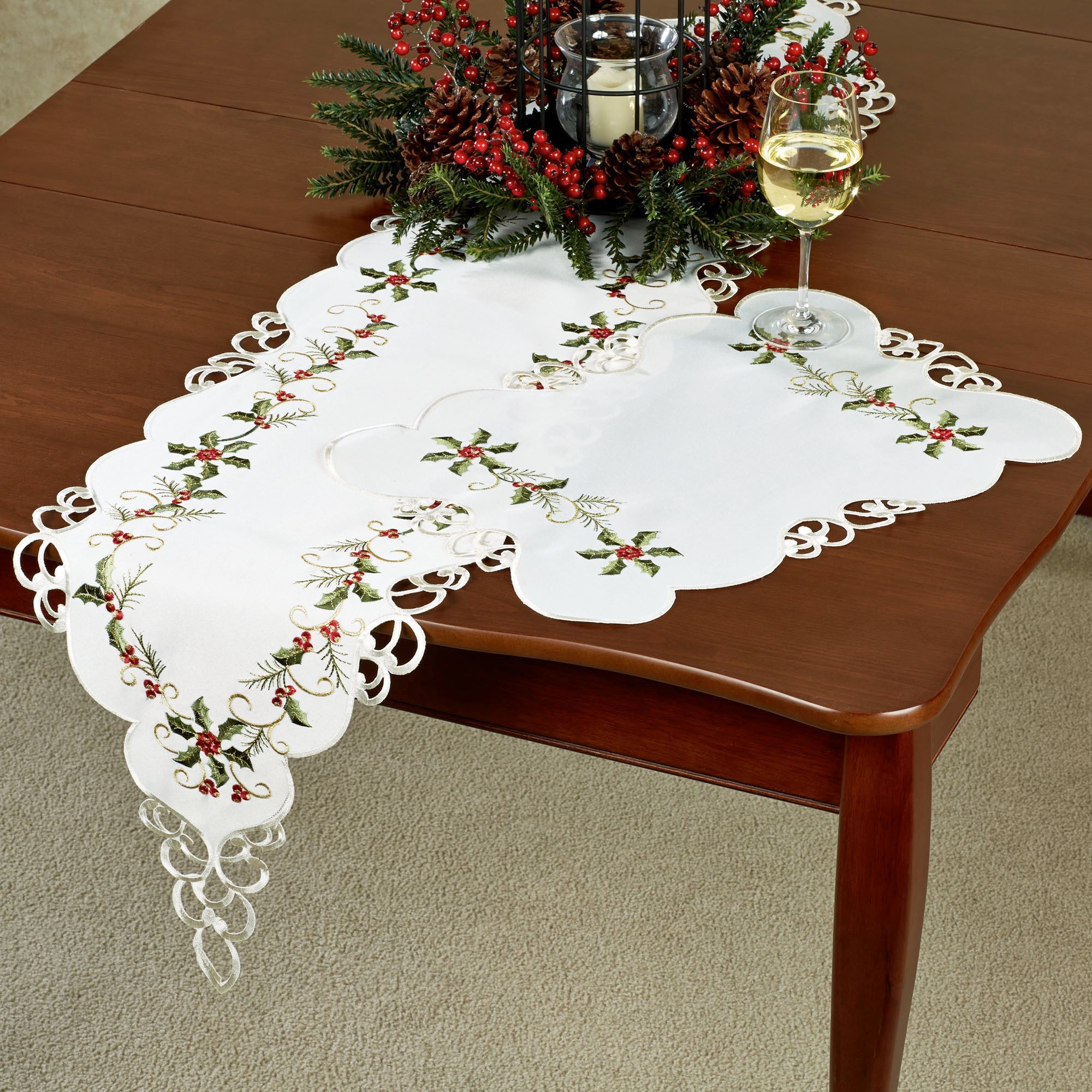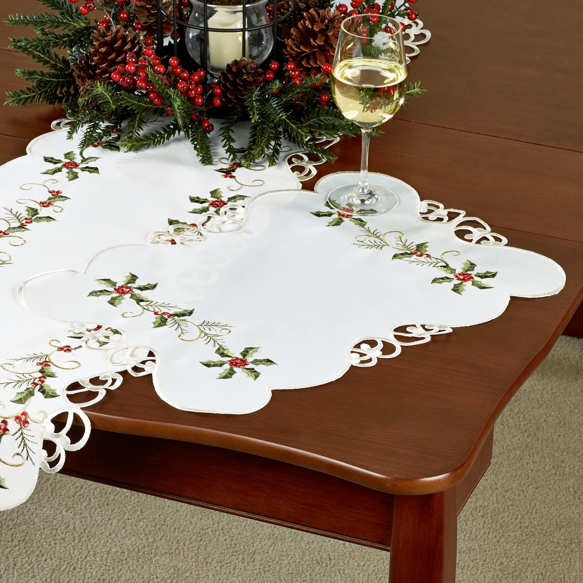 Boughs of Holly Cutwork Holiday Table Linens
