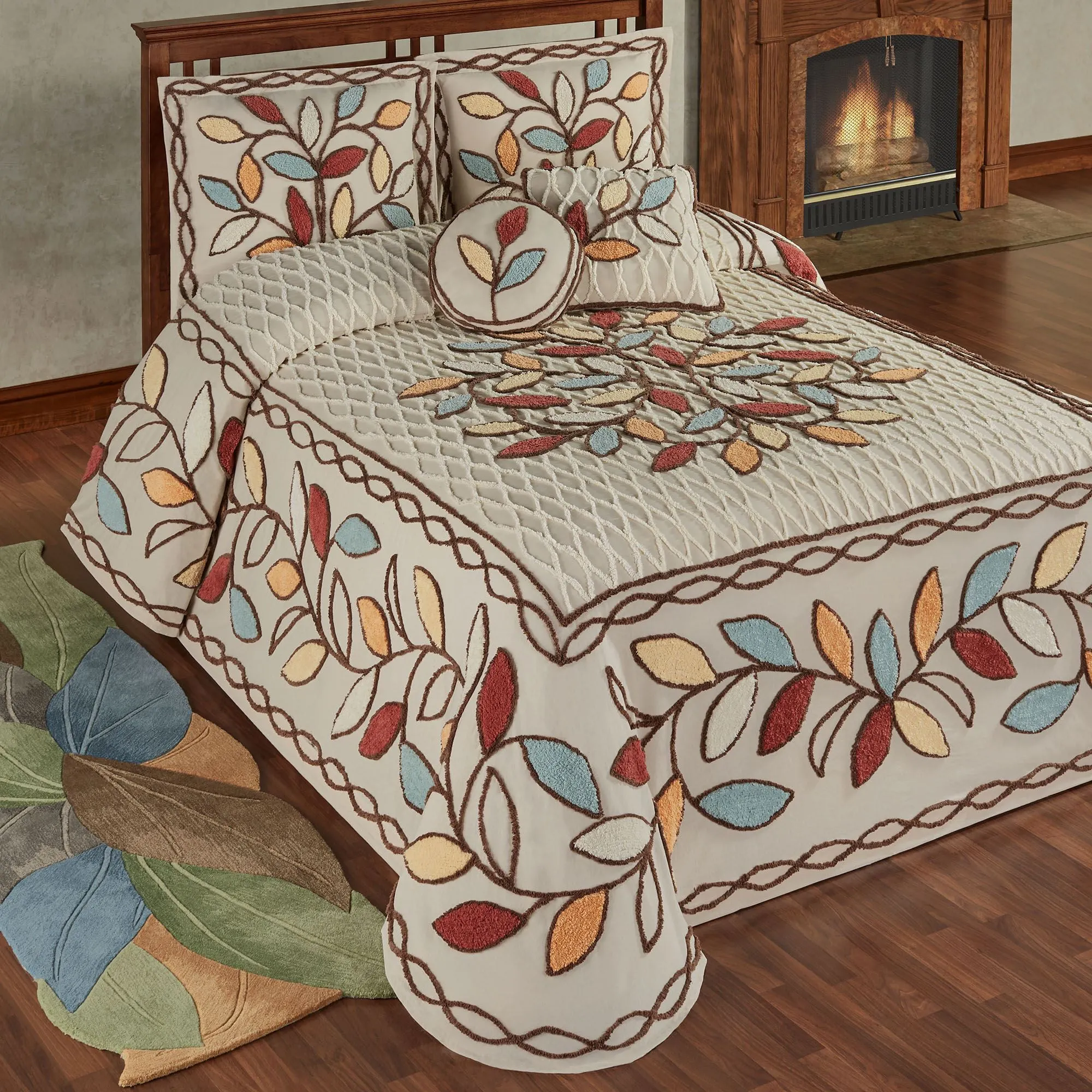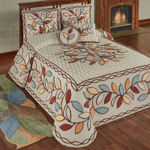 Bountiful Leaves breathe nature's wonder into your dreams. In a dimensional chenille design, the lightweight, fawn pure cotton ensemble features ivory, light blue, orange, cranberry, and yellow leaves alongside cocoa and ivory scrolling chain work motifs.