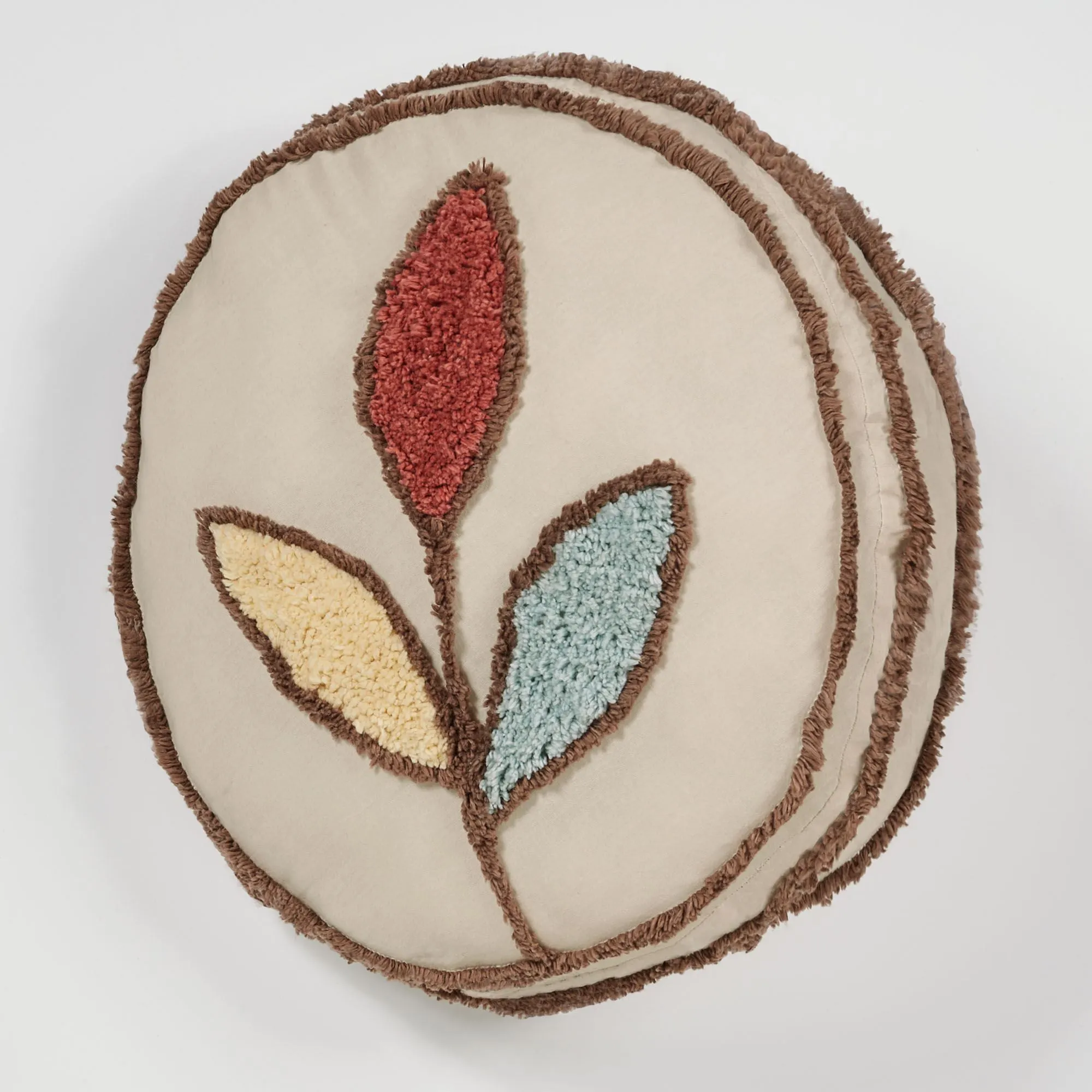 Pillows feature leaves and tailored edges. Spot clean. Round has 2" side gussets with tufting. Square features chain work.