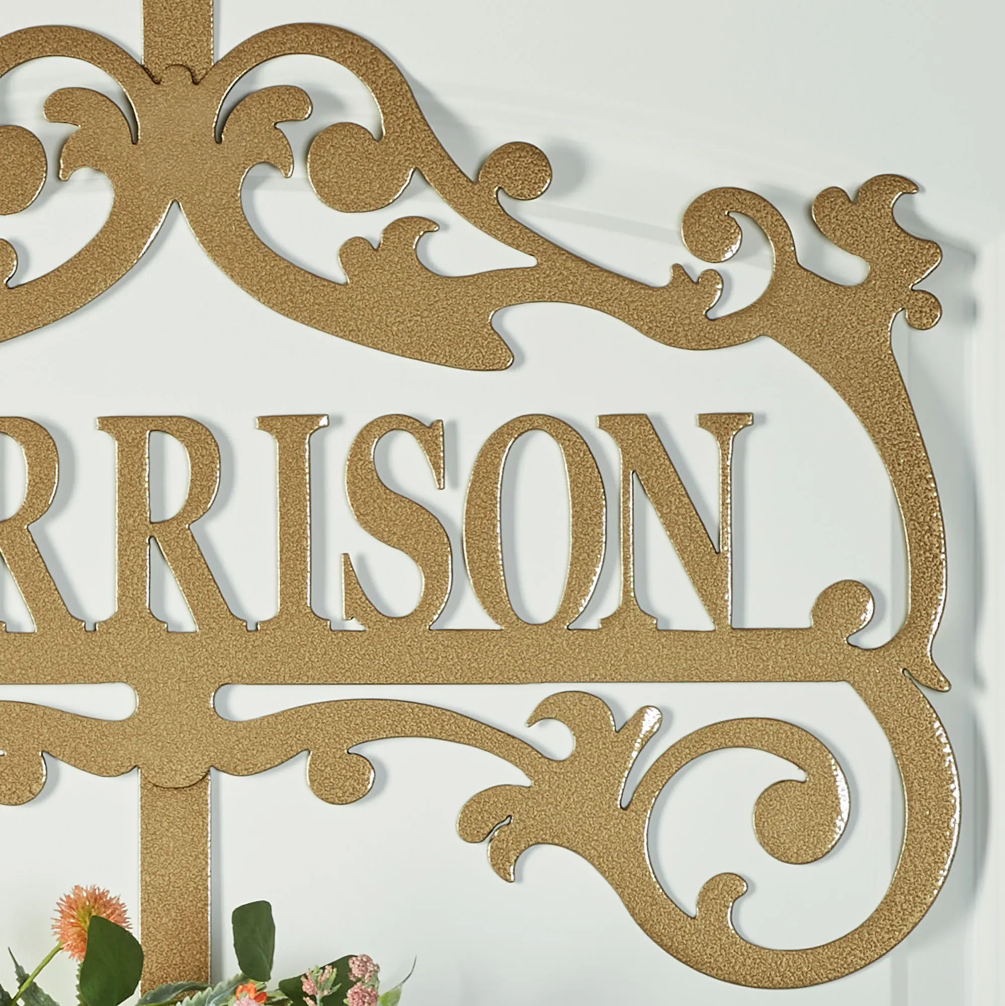 The Bower Gold Personalized Wreath Hanger has a traditional style for your wreath. Handcrafted of 14-gauge steel, this personalized wreath hanger, designed by JasonW Studios(R), has a scroll design and can be personalized with a name up to 9 uppercase characters in the center. Surnames with a prefix will be uppercase, lowercase, and followed by capital letters. UV-, weather-, and tarnish-resistant, the powder-coat finish allows you to decorate for any season indoors or outdoors year round. Wreath holder fits over doors up to 2"D, and the design is 5" down from the top of the hanger. The hook area is 2.75"D. Measures 22"Wx3"Dx22"H. (C)2022 Touch of Class(R).
