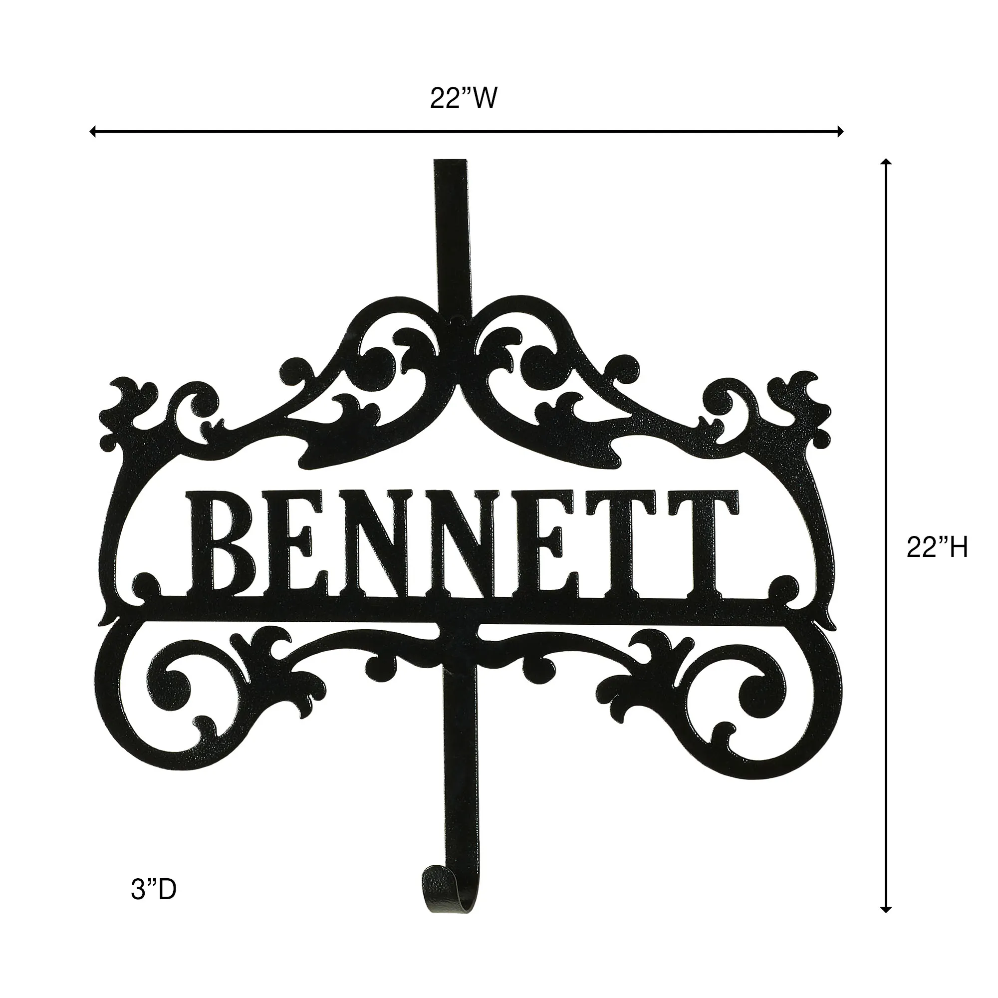 The Bower Black Personalized Wreath Hanger has a traditional style for your wreath. Handcrafted of 14-gauge steel, this personalized wreath hanger, designed by JasonW Studios(R), has a scroll design and can be personalized with a name up to 9 uppercase characters in the center. Surnames with a prefix will be uppercase, lowercase, and followed by capital letters. UV-, weather-, and tarnish-resistant, the powder-coat finish allows you to decorate for any season indoors or outdoors year round. Wreath holder fits over doors up to 2"D, and the design is 5" down from the top of the hanger. The hook area is 2.75"D. Measures 22"Wx3"Dx22"H. (C)2022 Touch of Class(R).