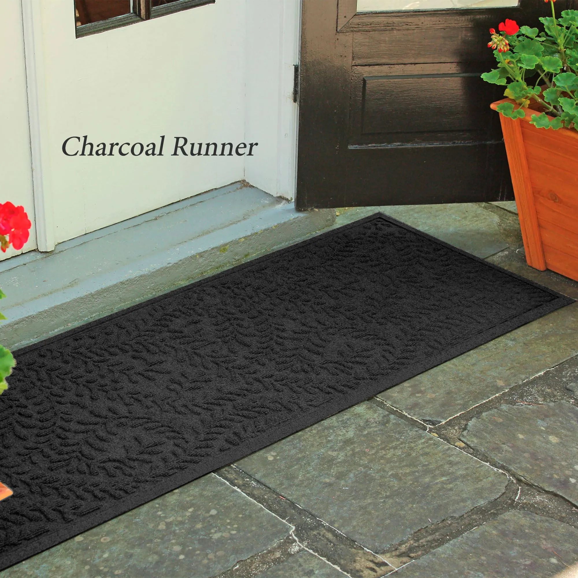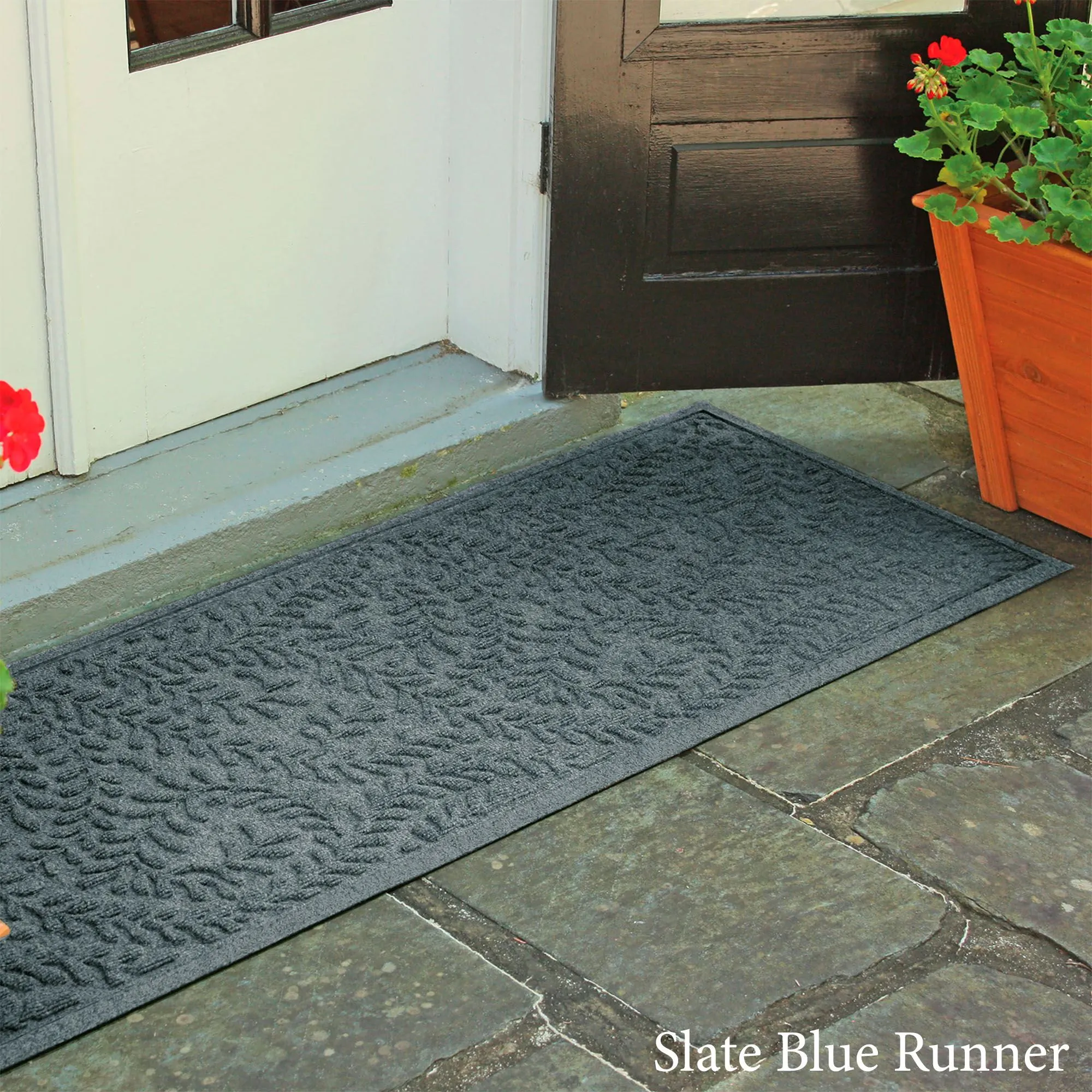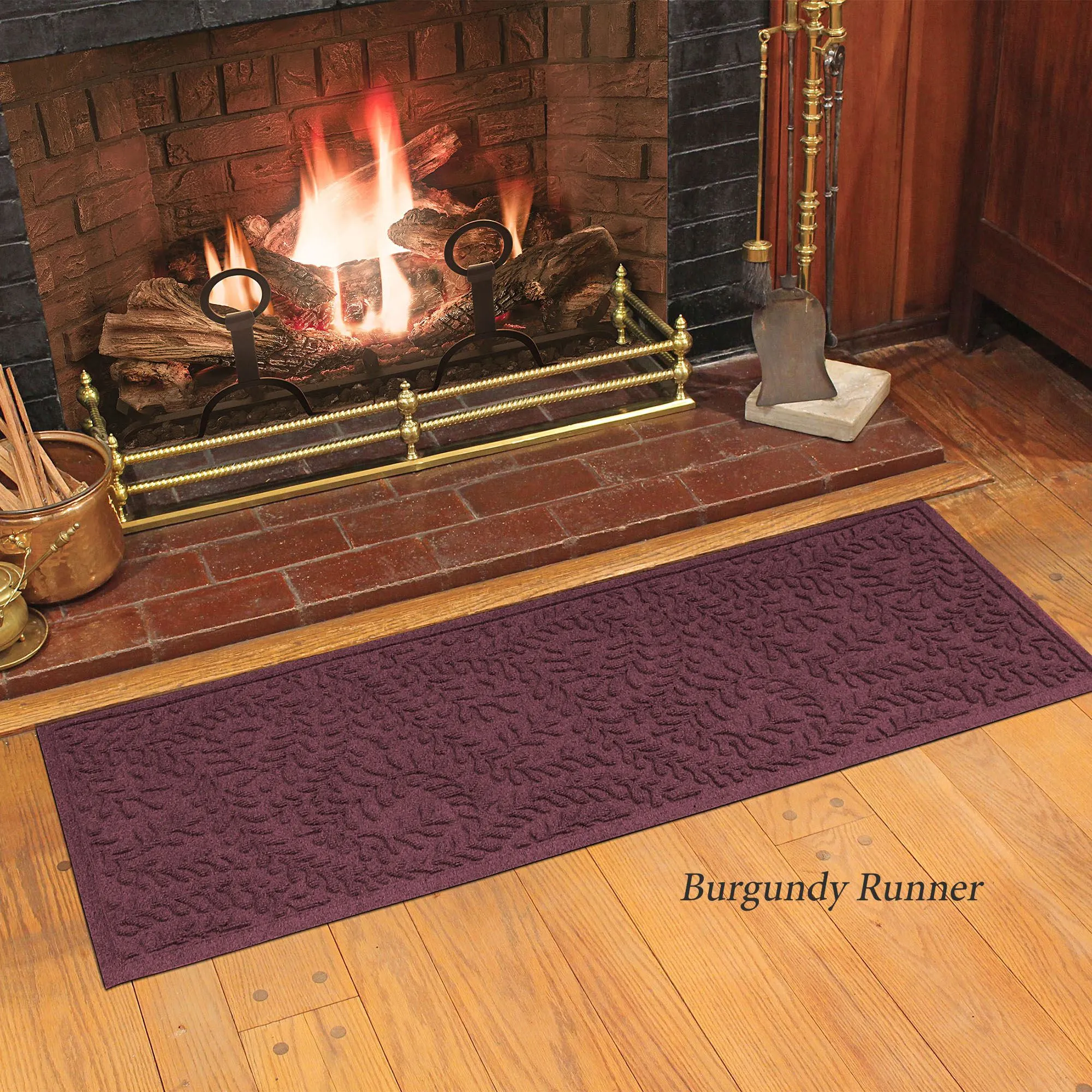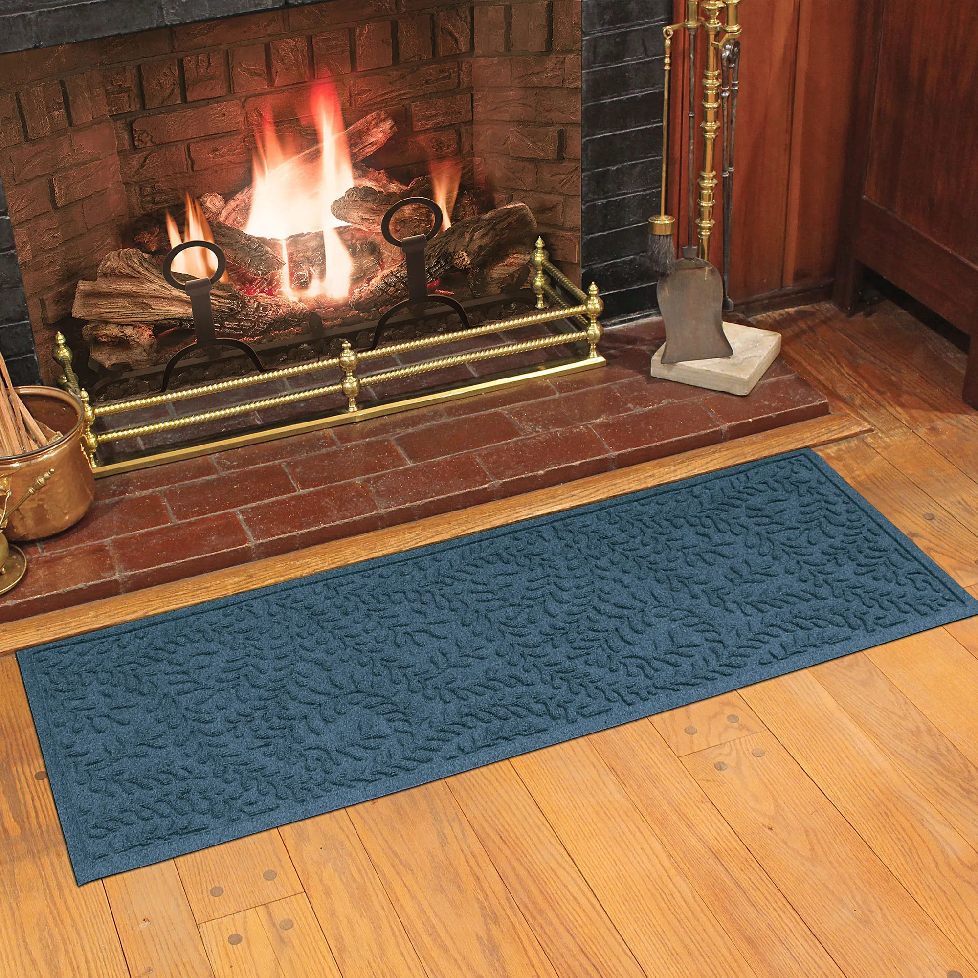 The vining leaves on the Boxwood Indoor/Outdoor Runner Mat will decorate any entryway with intriguing motifs. The antistatic PET polyester fiber floor accent has a slip-resistant SBR rubber backing that is skid-resistant and certified by the National Floor Safety Institute. The WaterHog(R) exclusive Water Dam border keeps dirt and water on the mat and not your floor. Mat is mildew-, mold-, and rot-resistant. Specify color: Navy, Burgundy, Charcoal, Dark Brown, Dark Green, Gray, Khaki, or Slate Blue. Runner mat is 60"x22". Indoor use or outdoor use year round. Hose off to clean.