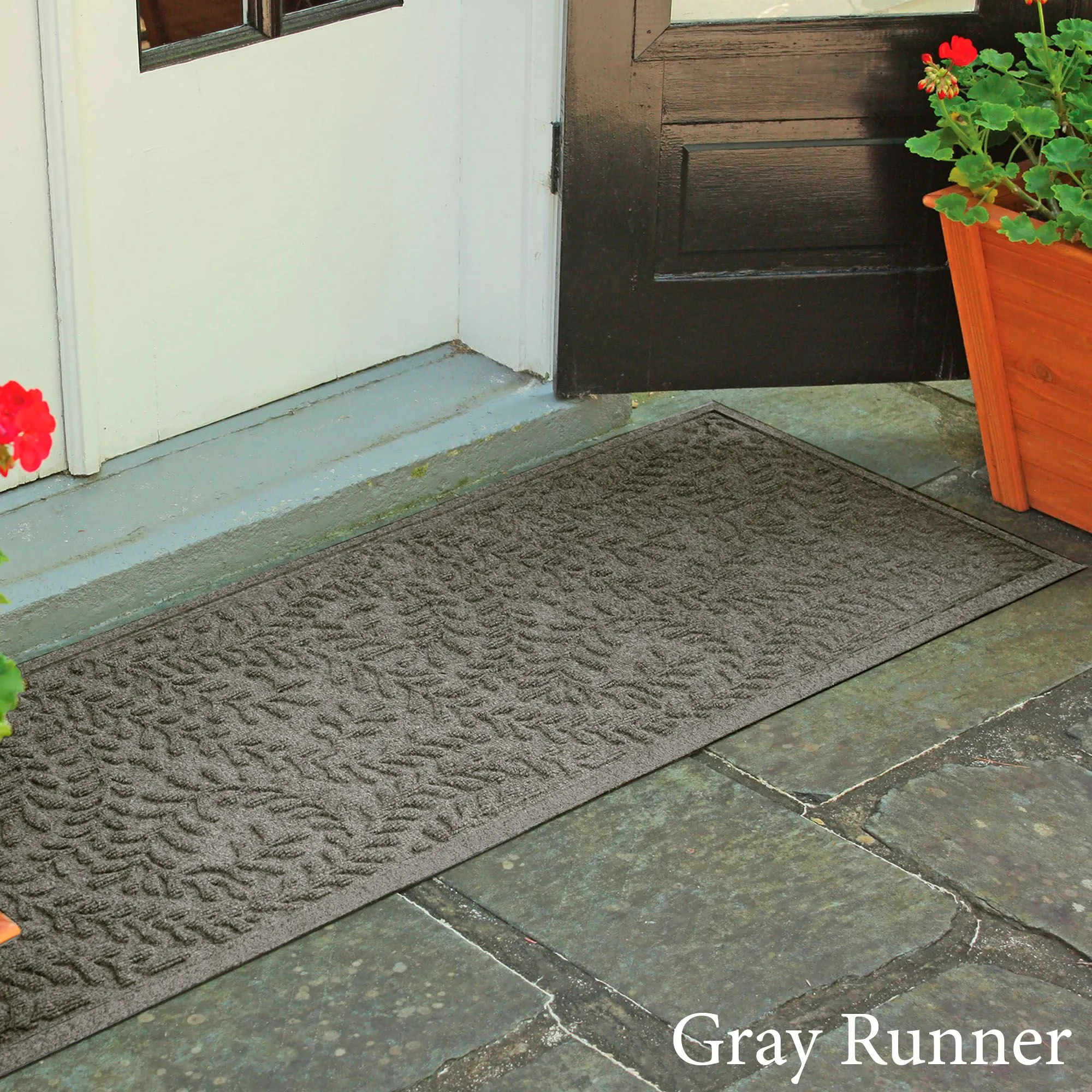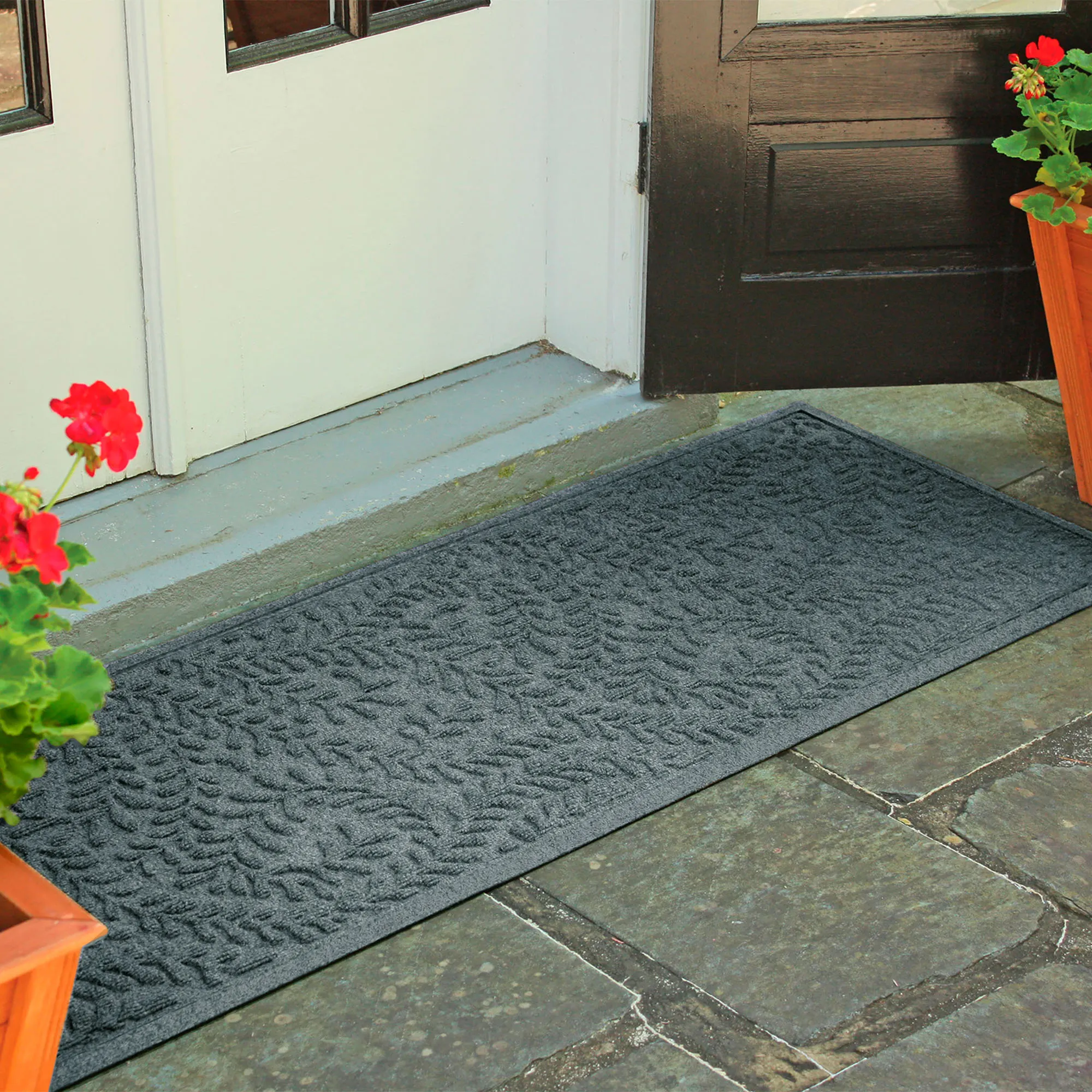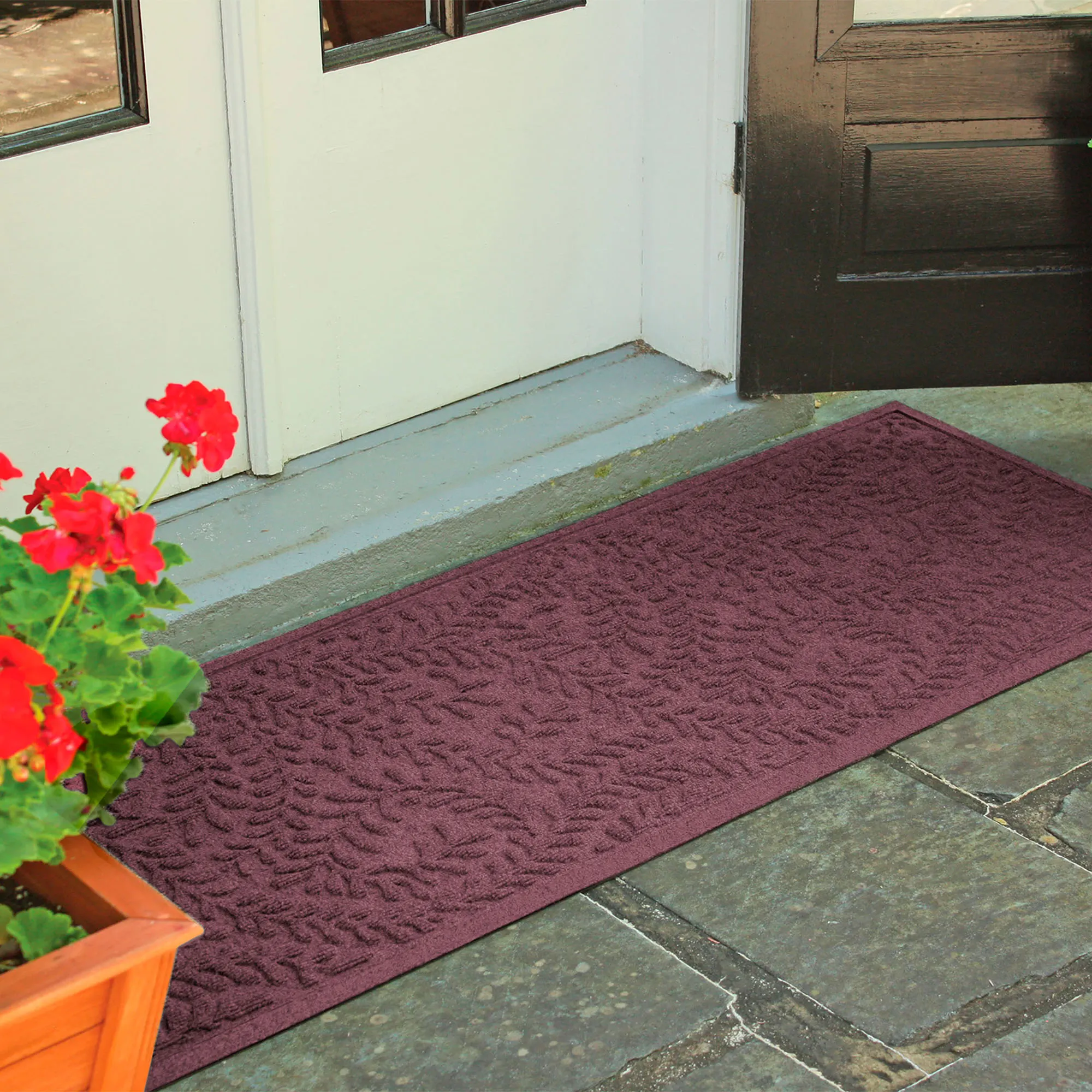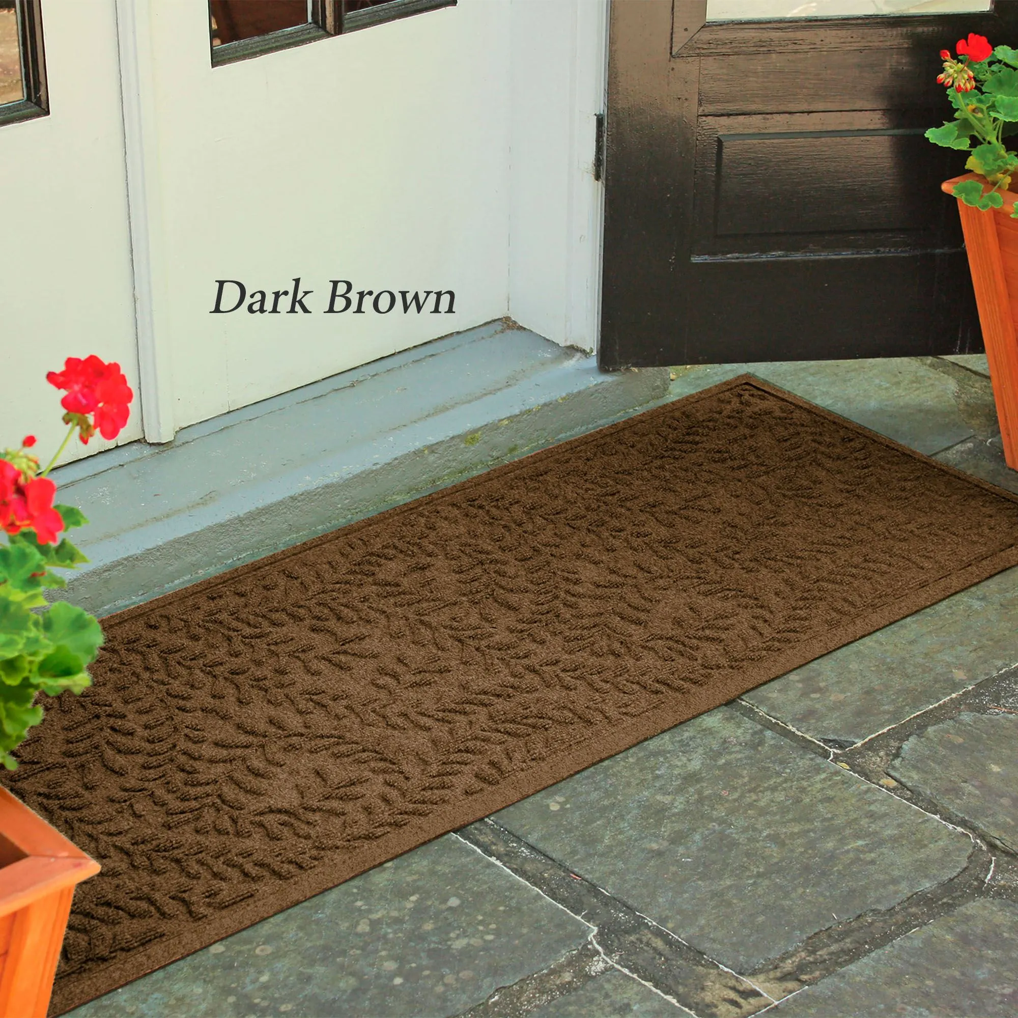 The vining leaves on the Boxwood Indoor/Outdoor Runner Mat will decorate any entryway with intriguing motifs. The antistatic PET polyester fiber floor accent has a slip-resistant SBR rubber backing that is skid-resistant and certified by the National Floor Safety Institute. The WaterHog(R) exclusive Water Dam border keeps dirt and water on the mat and not your floor. Mat is mildew-, mold-, and rot-resistant. Specify color: Navy, Burgundy, Charcoal, Dark Brown, Dark Green, Gray, Khaki, or Slate Blue. Runner mat is 60"x22". Indoor use or outdoor use year round. Hose off to clean.