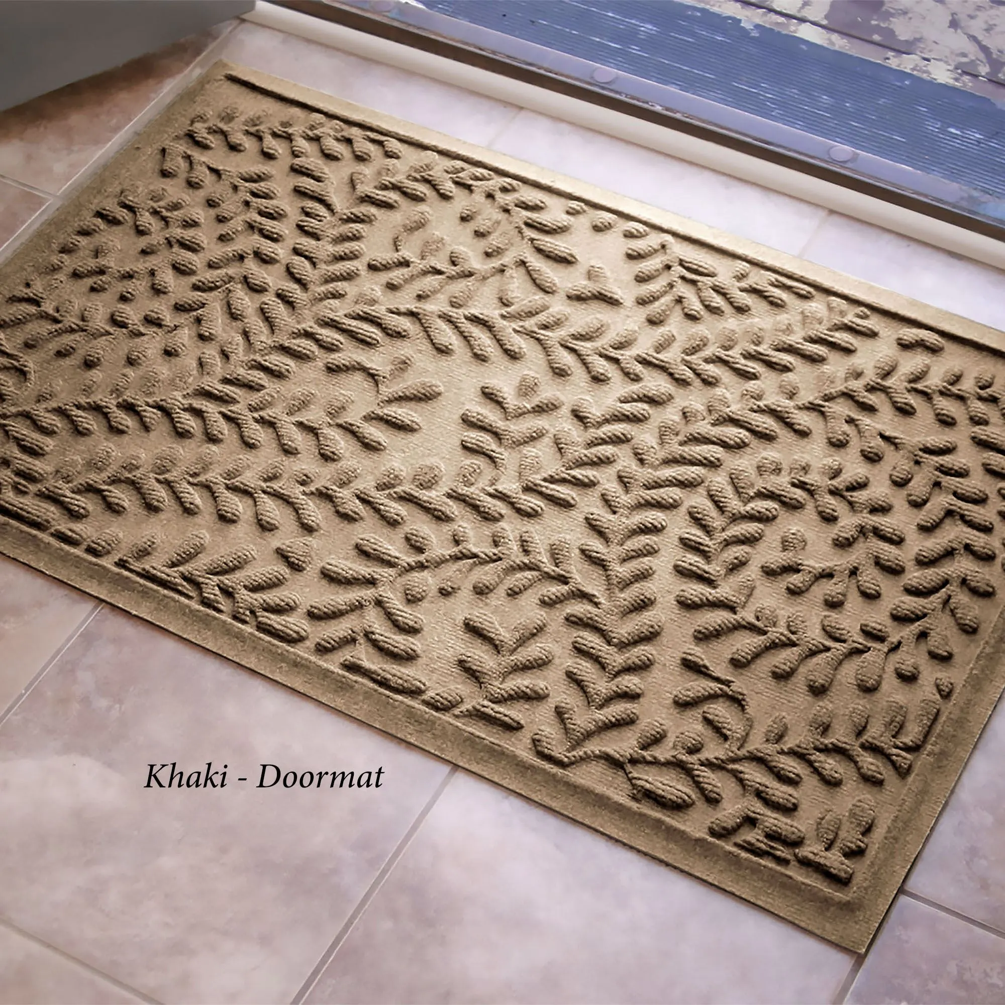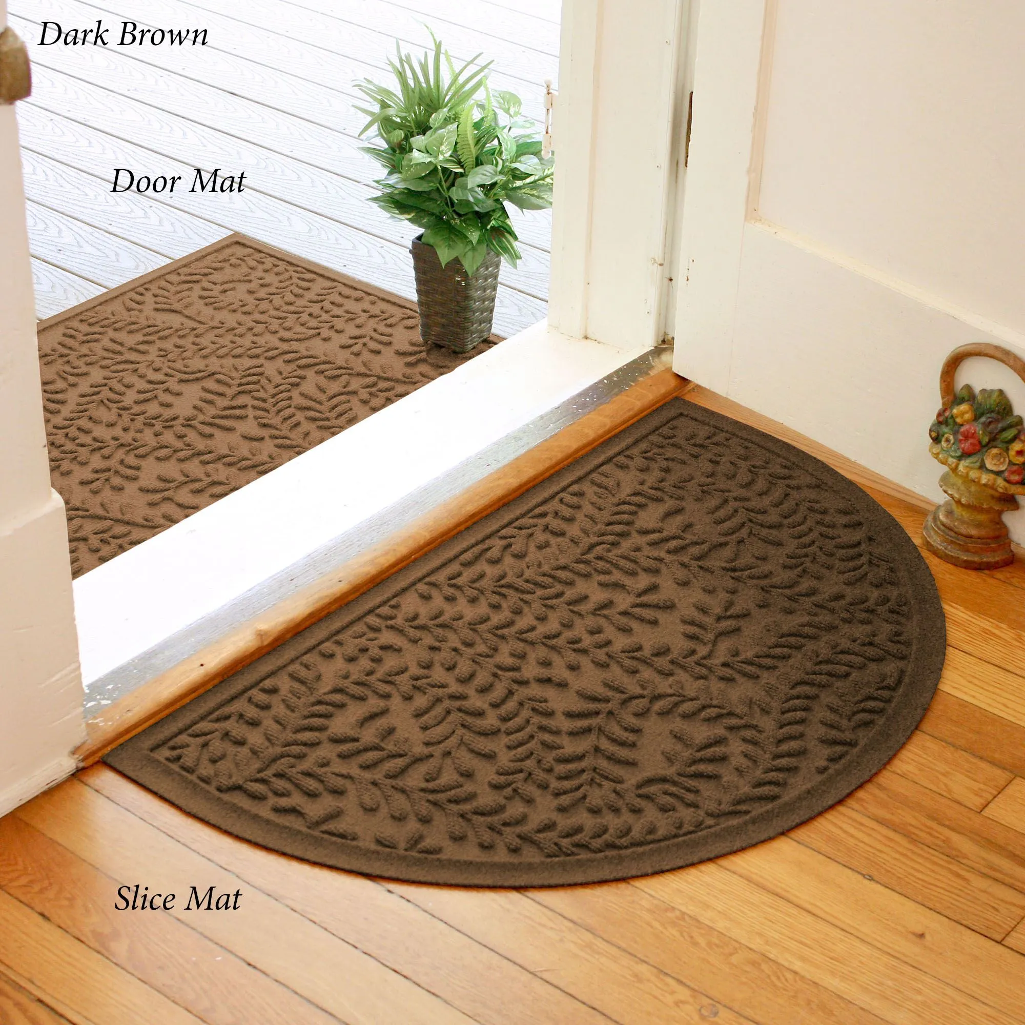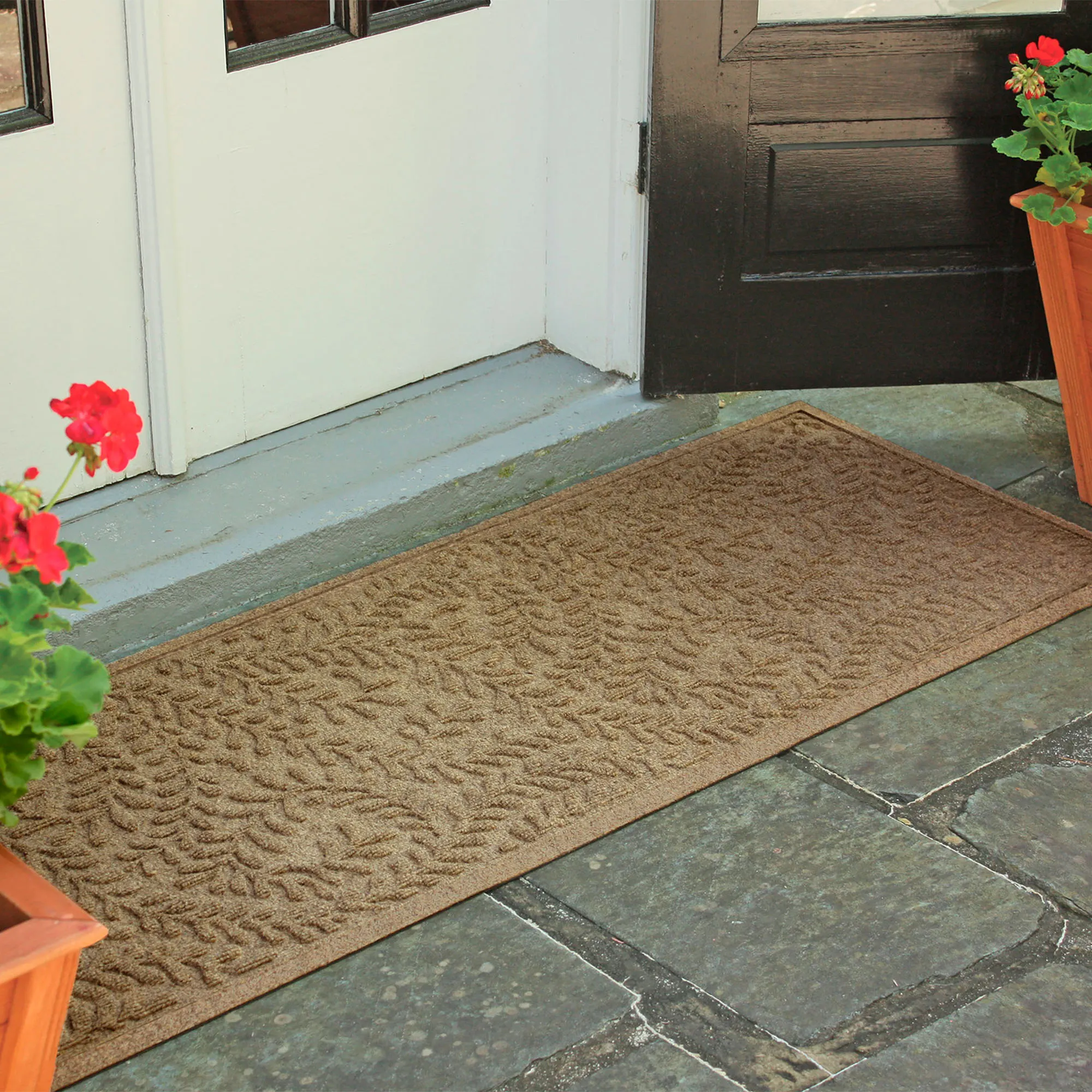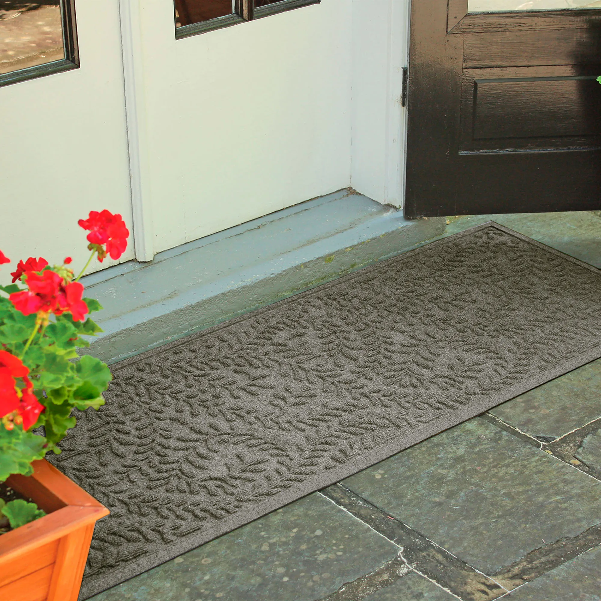 The vining leaves on the Boxwood Indoor/Outdoor Runner Mat will decorate any entryway with intriguing motifs. The antistatic PET polyester fiber floor accent has a slip-resistant SBR rubber backing that is skid-resistant and certified by the National Floor Safety Institute. The WaterHog(R) exclusive Water Dam border keeps dirt and water on the mat and not your floor. Mat is mildew-, mold-, and rot-resistant. Specify color: Navy, Burgundy, Charcoal, Dark Brown, Dark Green, Gray, Khaki, or Slate Blue. Runner mat is 60"x22". Indoor use or outdoor use year round. Hose off to clean.