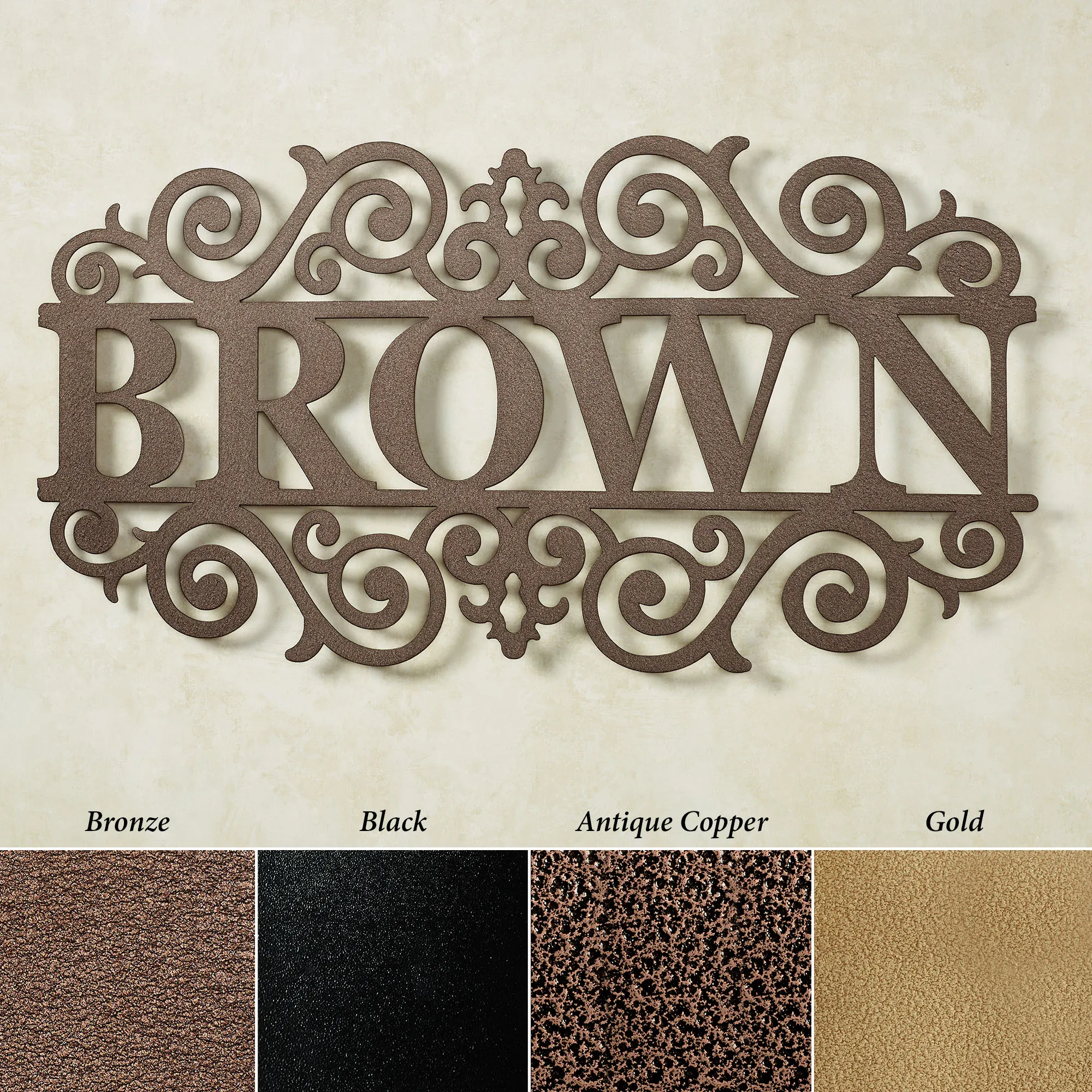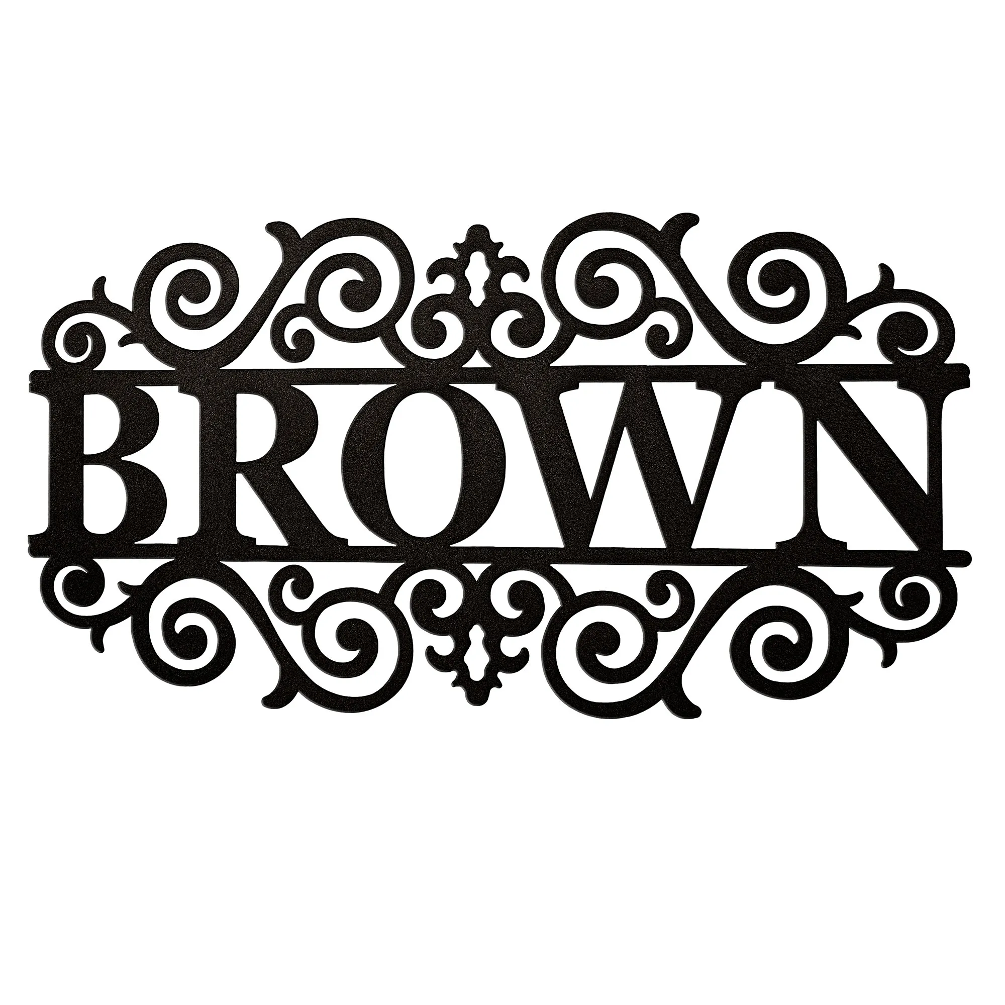 The Bradford Personalized Wall Art Sign displays a family name with class. Handcrafted of 14-gauge steel, this personalized wall grille, designed by JasonW Studios(R), has a powder-coat finish that is UV-, weather-, and tarnish-resistant. Personalize the center with your family name up to 10 capital letters. Surnames with a prefix will be uppercase, lowercase, and followed by capital letters. A fleur decorates the top; scroll designs accent the top and bottom. Indoor or outdoor year-round use. Measures 36"Wx1"Dx18"H. (C)2022 Touch of Class(R).